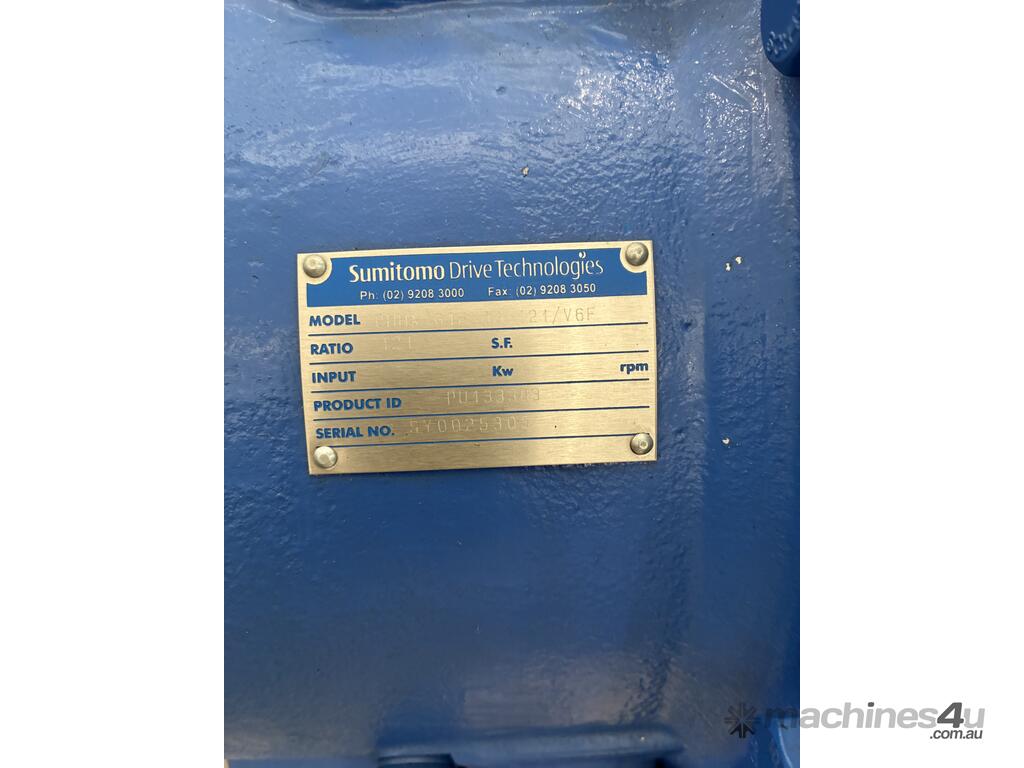 - Sumitomo Gearmotor (121:1 Ratio) – heavy-duty torque reduction and smooth power delivery