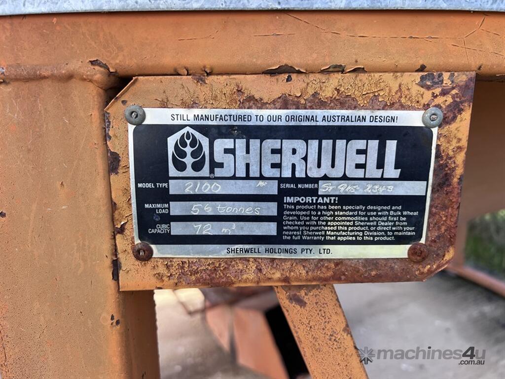 Sherwell 2100 Silo 56T. 72m3 capacity. Selling due to moving away from grain farming. Serial No 5T 915 2343. Located a Riverton QLD, available at MRE Auctions online sale.