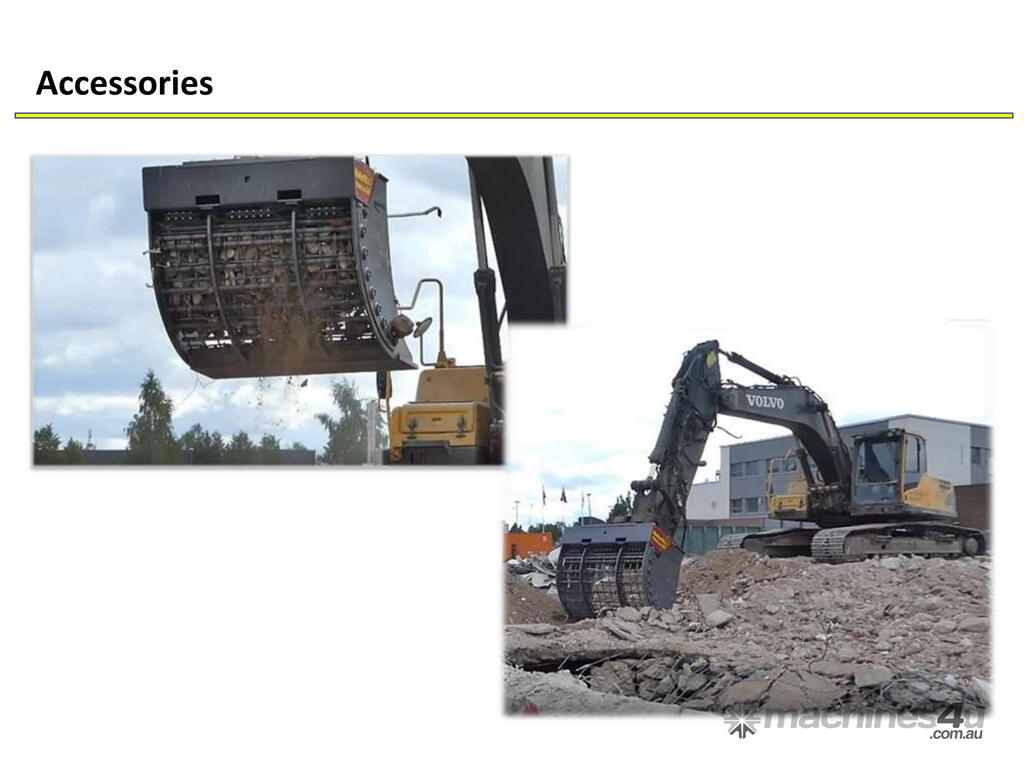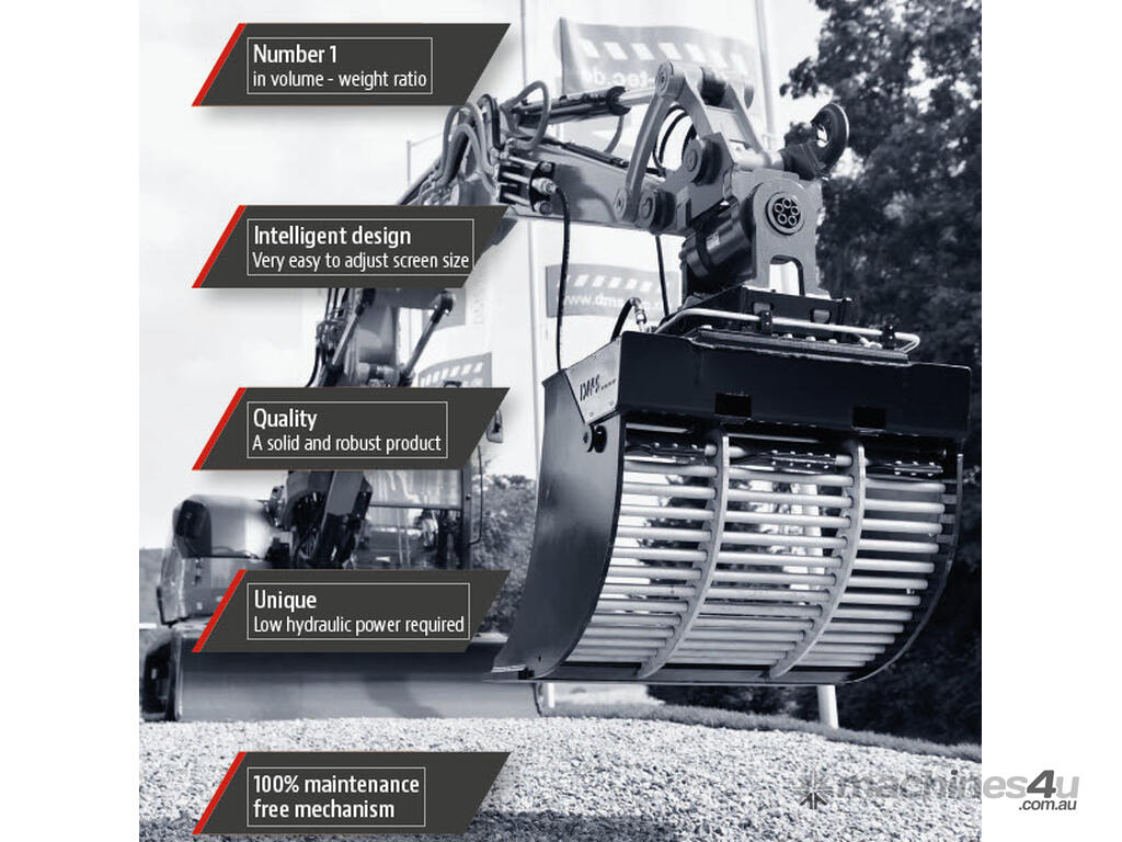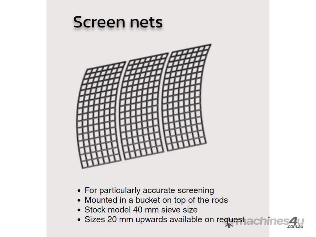 The frame material of the screen bucket is durable 400HB wear steel and all screen buckets are also available as supermodels with nails and additional reinforcements. The use of a screen bucket is cost effective and the cost of using it is only a fraction compared to rotor type screen buckets. The screen bucket needs 20 to 80 liters of hydraulic output at a pressure of 200 bar and can also be used on tiltrotators.