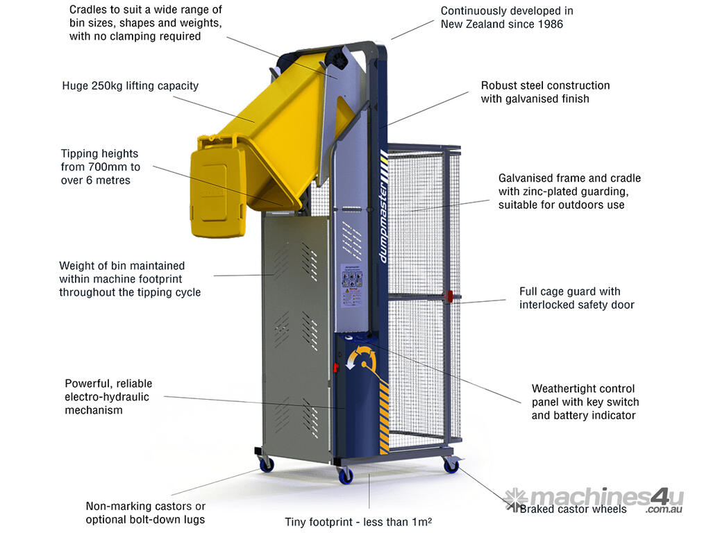 The Dumpmaster mobile bin tipper is packed full of features to ensure operator safety