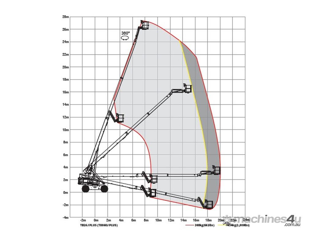 With a max platform height of 26.3m and a working height of 28.3m, this telescopic boom lift offers a large operational range, high efficiency, and the power to carry up to 454kg. It’s equipped with a 45% gradeability for easy positioning and reduced slippage risks, ensuring you stay productive even in challenging terrain. The TB26J is perfect for applications such as construction engineering, urban utilities, and building maintenance, among others.