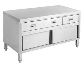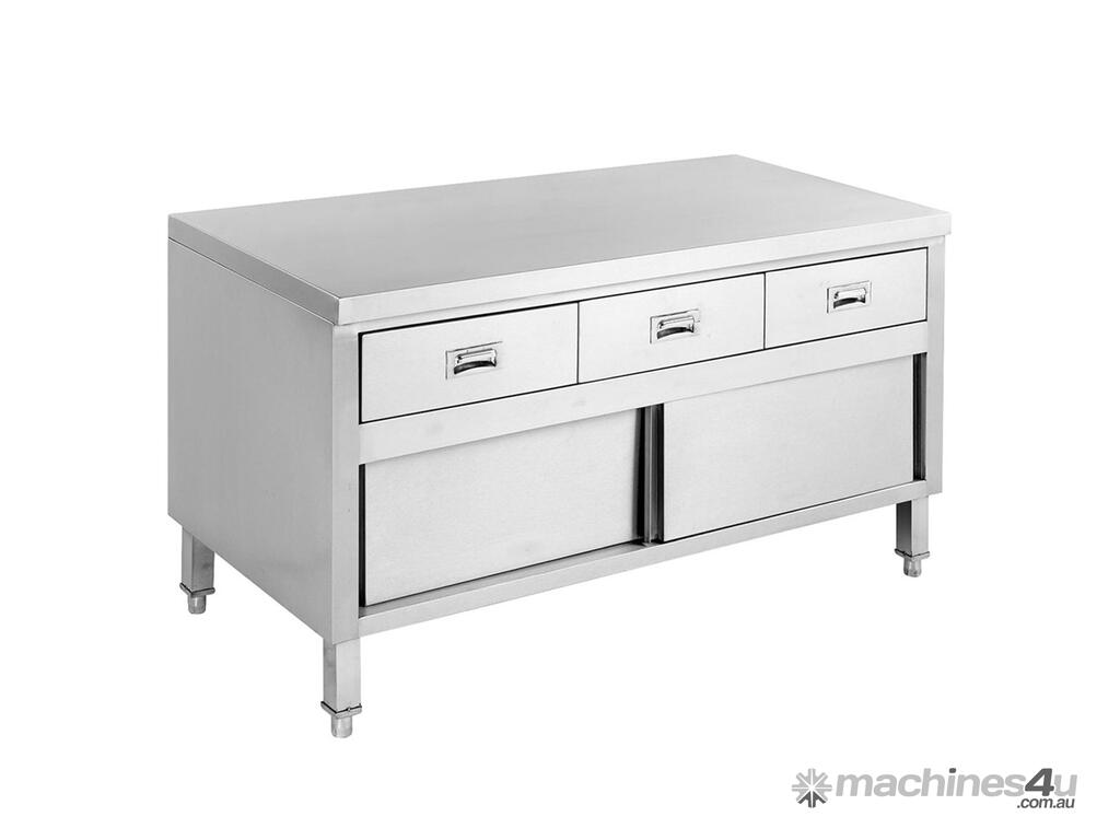 'KITCHEN TIDY' CABINETS ALL STAINLESS STEEL BENCHES WITH HANDY DOORS & DRAWERS TO KEEP KITCHENS TIDY AND HIDE CLUTTER Great for open kitchens • 1200 mm wide • 700 mm deep × 900 mm high • pre-assembled with all welded joins • Top 1.2 mm; SUS304 grade (18/8) • Doors are 0.9 mm S/S 2 Years Parts only Warranty Depth: 700 mm | Width: 1200 mm | Height: 900 mm | Net Weight: 66 | Price: $2750 | Manufacturer: Modular Systems | Warranty: 2 Years Parts Only