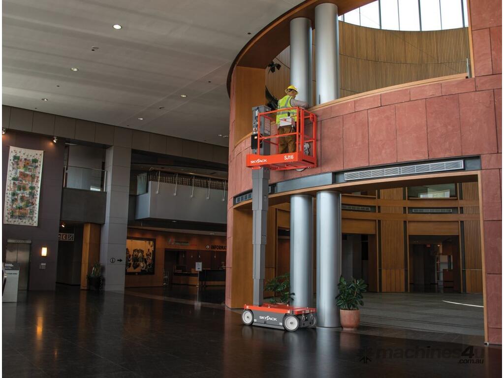 Skyjack’s SJ16 self propelled vertical mast lift features a compact footprint and superior maneuverability. The SJ16 has a working height of 18’. When operating in tight workspaces, a high degree steer angle allows superior functionality and flexibility by offering zero inside turning radius. The SJ16 features a 20” traversing platform, providing increased access and the ability to reach over potential obstacles. A unique slide away platform provides easy access to components, when raised or in the stowed position. Skyjack’s standard color coded and numbered wiring system with hard-wired relay based controls help to ensure the new SJ16 lives up to Skyjack’s reputation for quality and serviceability.