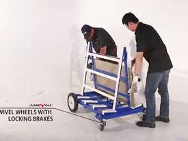 Two swivel wheels with brakes are mounted on the front and two rigid pneumatic wheels on the back for ease of handling. All are mounted outside of the steel frame for stability
