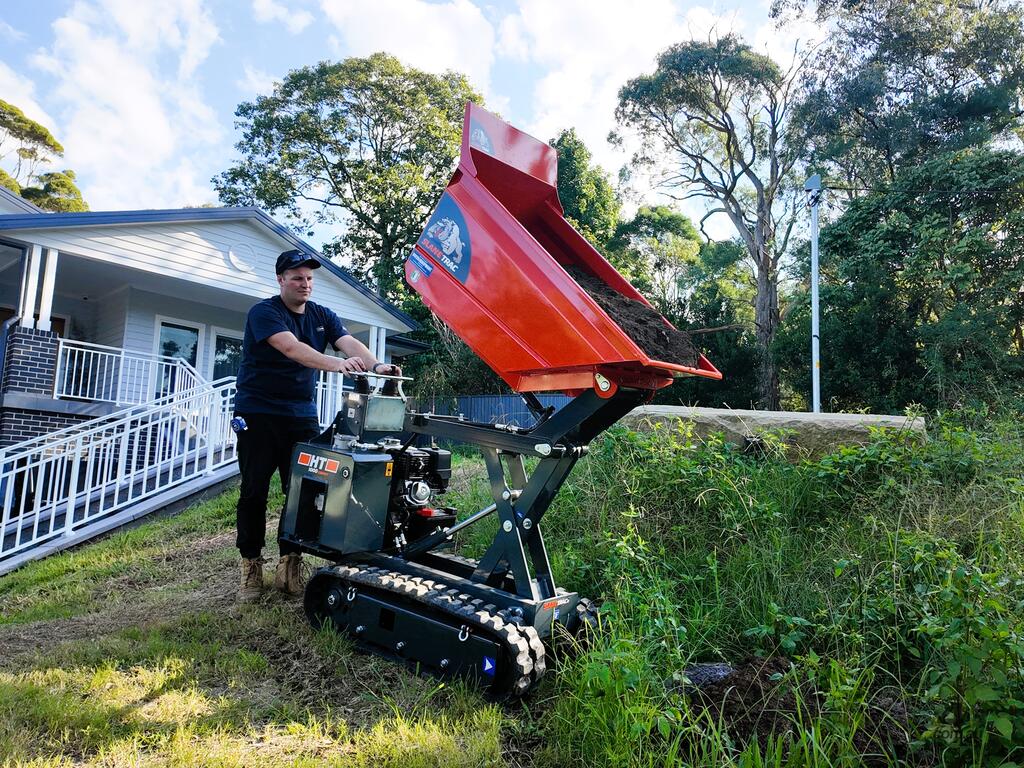 This compact petrol mini track dumper has a maximum width of 700mm and a length of 1900mm. It can turn on its own length therefore offering greater accessibility and maneuverability in urban areas or areas where larger machines or excavators can’t access.