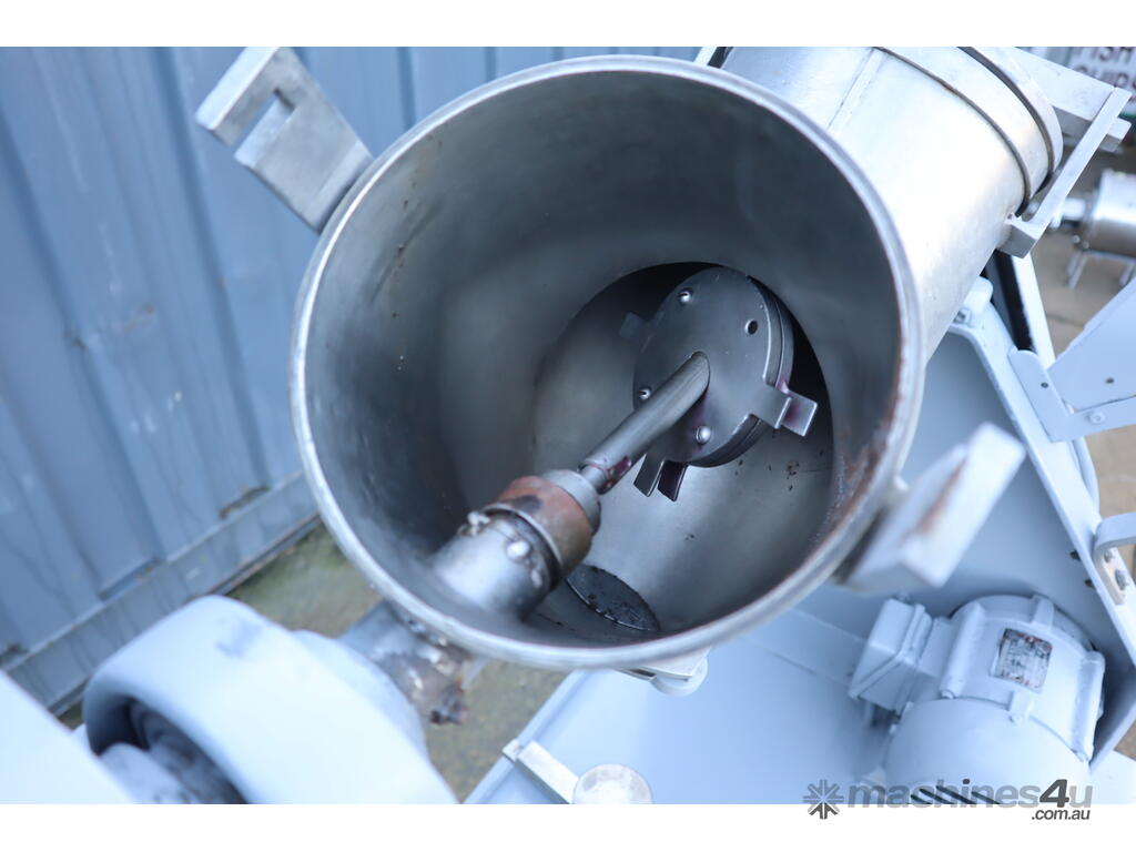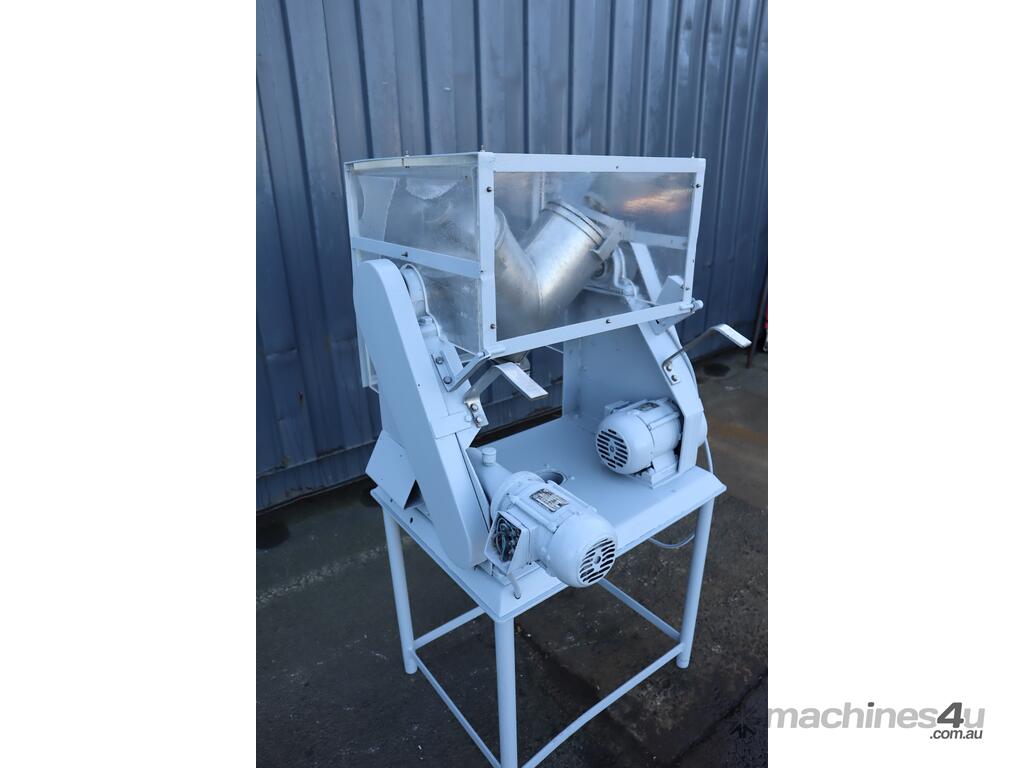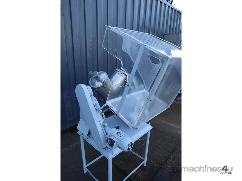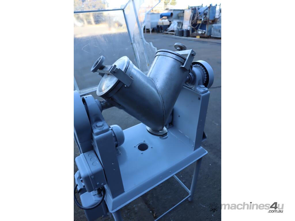 The V blender is stainless steel which is mounted on a painted steel frame.
