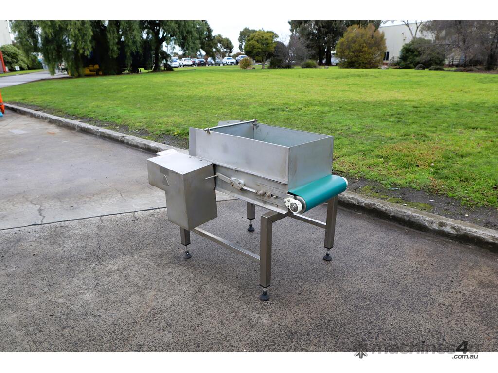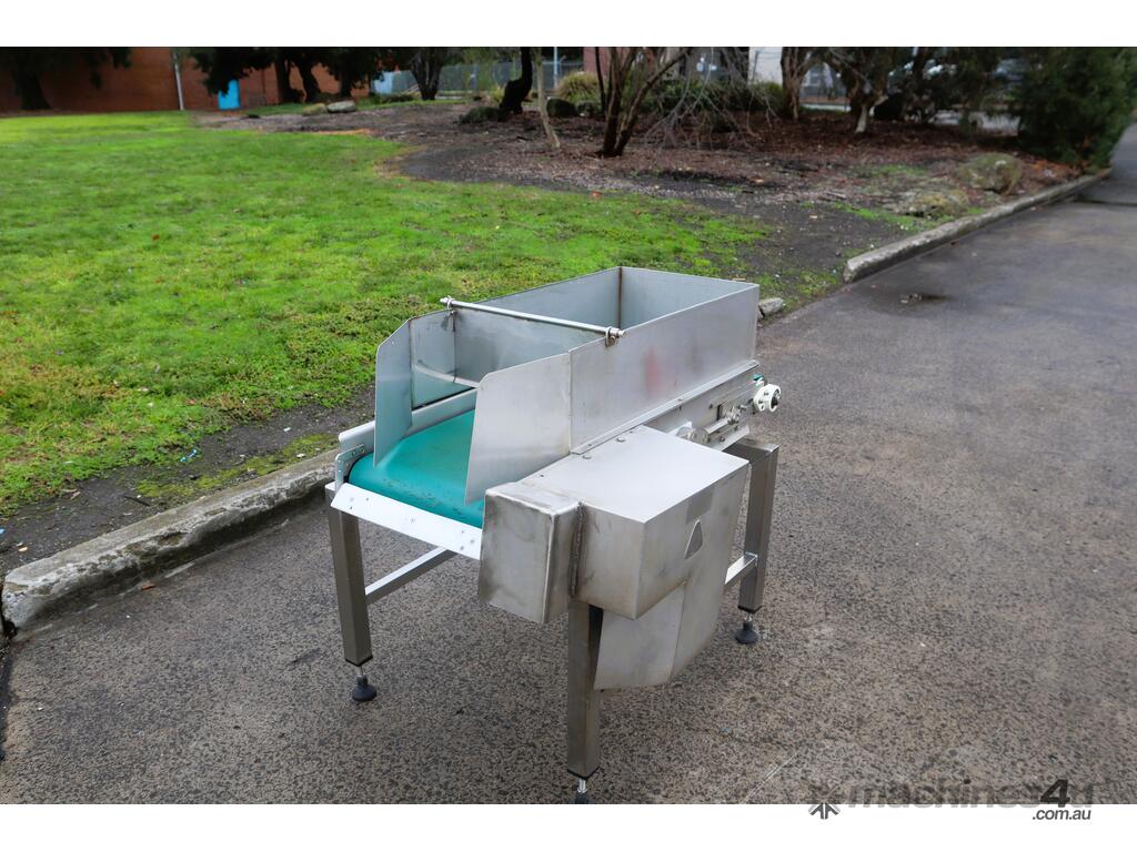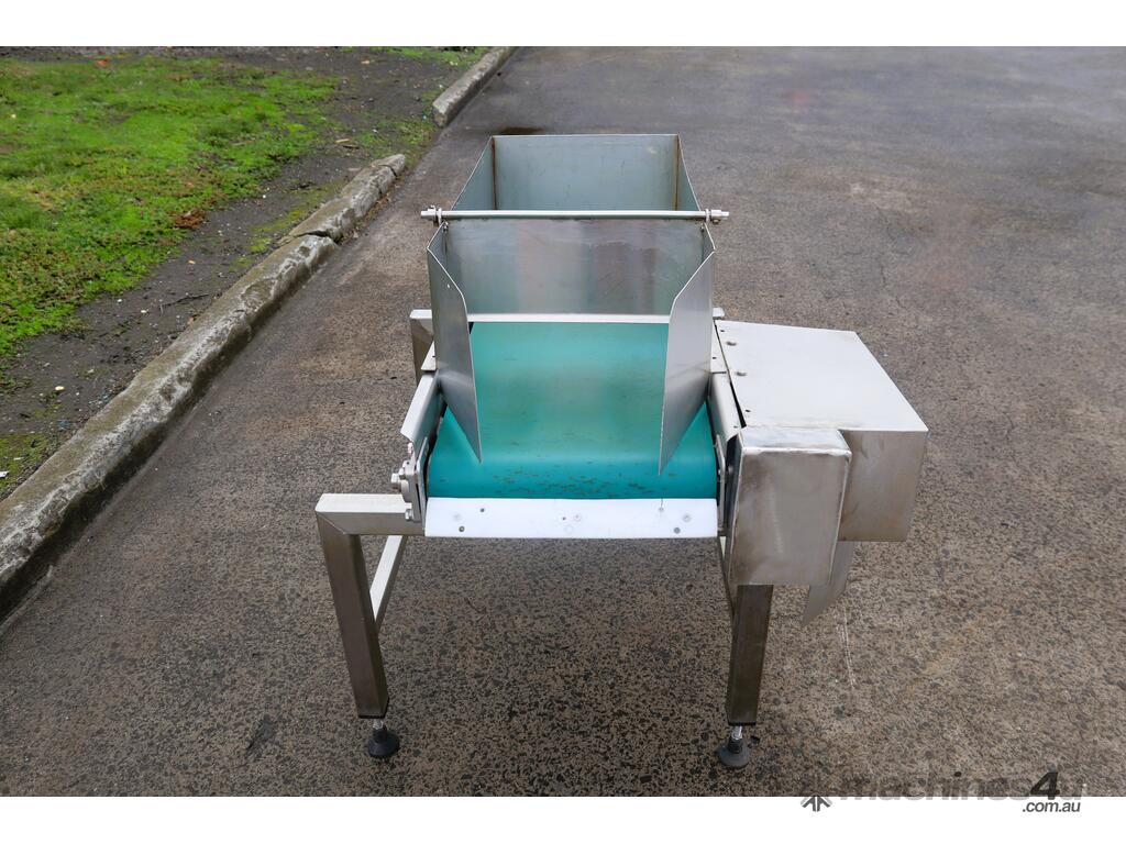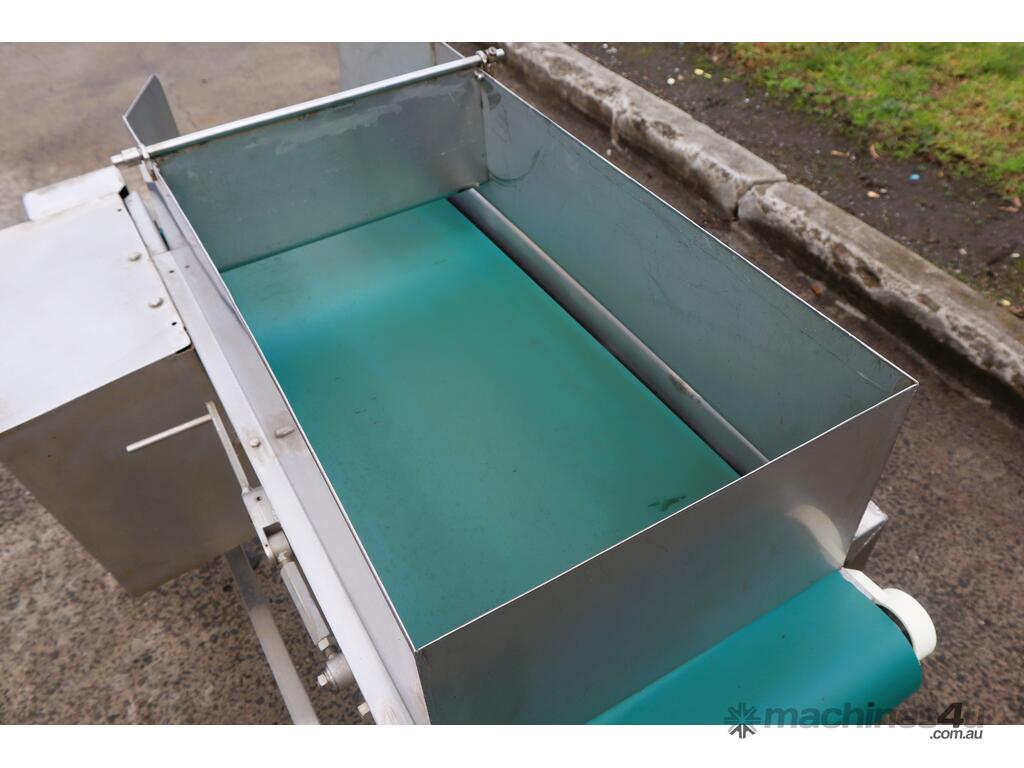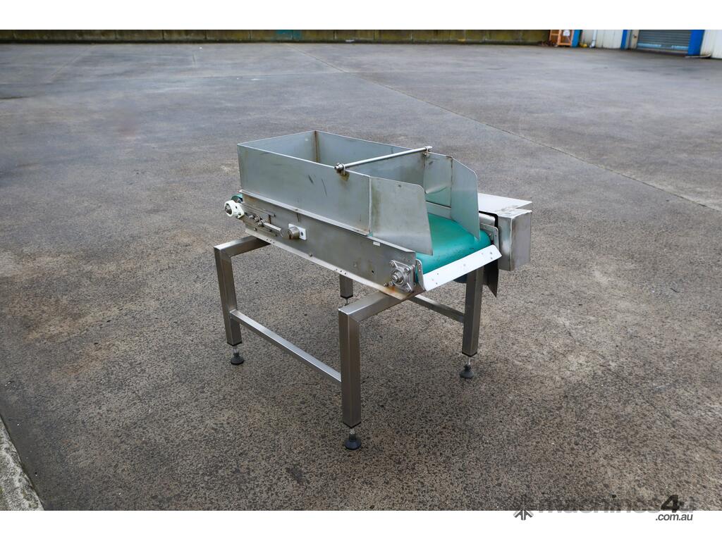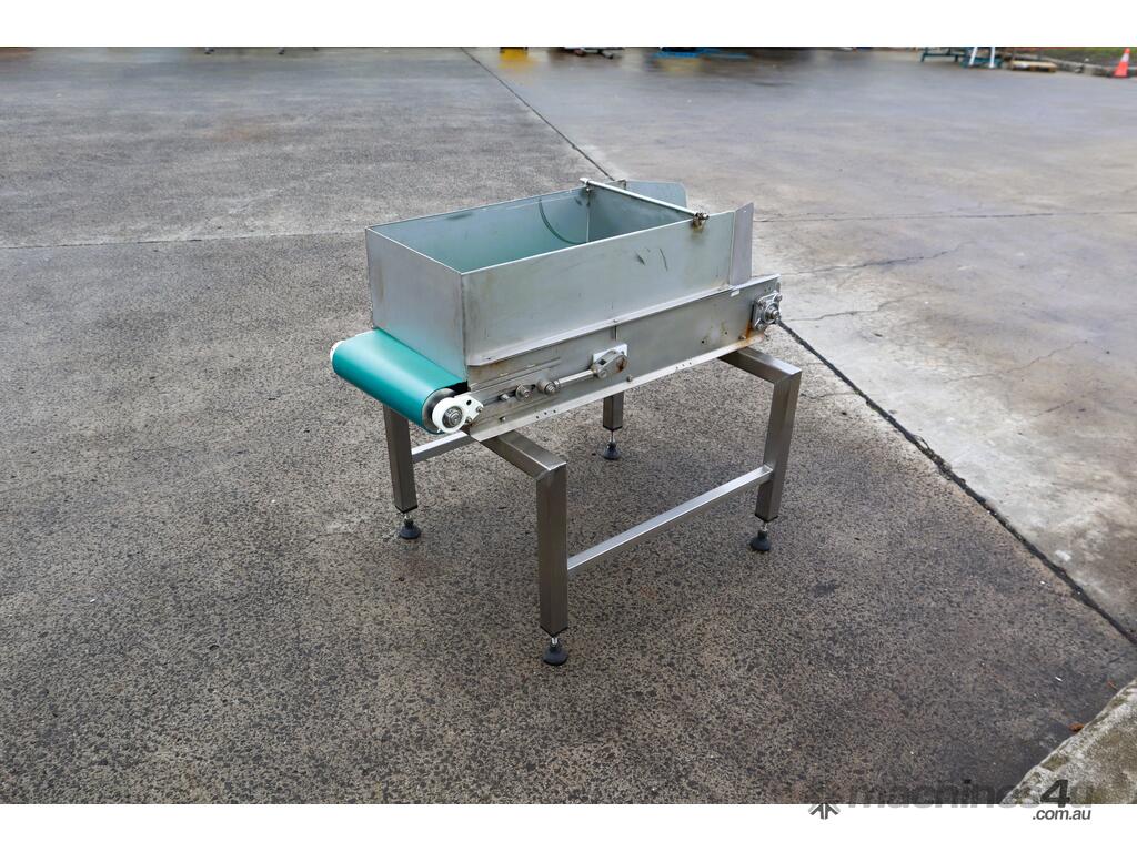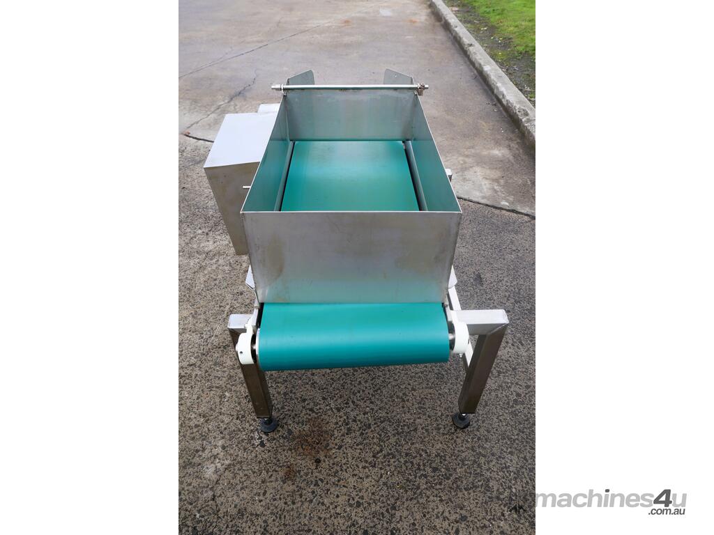 Compact belt conveyor in good condition. Small footprint and perfect for operation in limited floor spaces. Stainless steel framing and components with food grade belt.