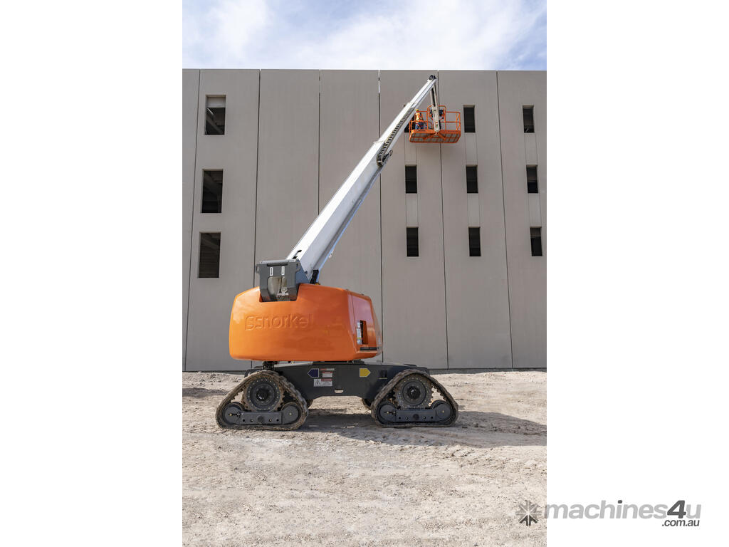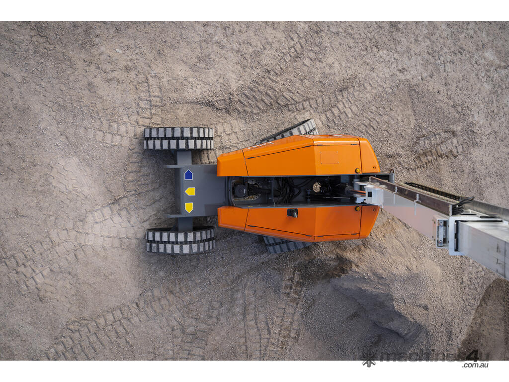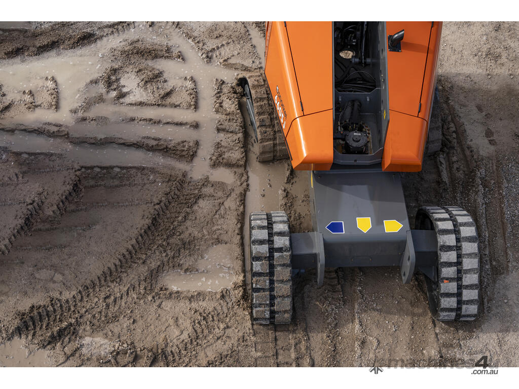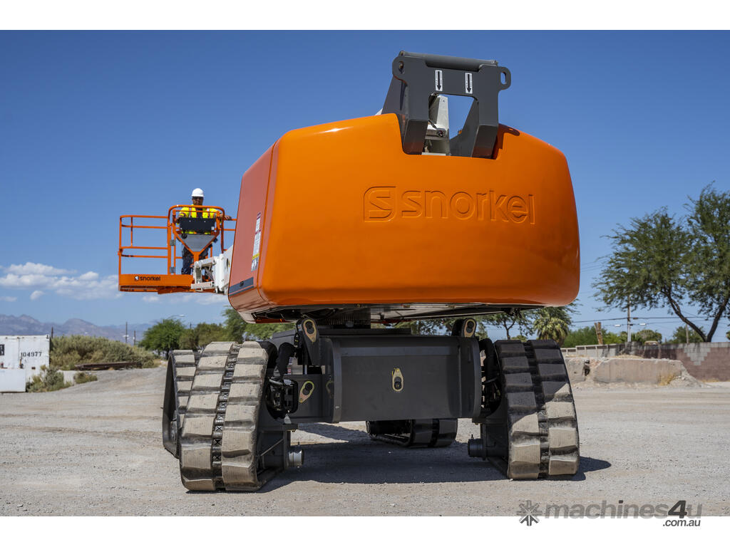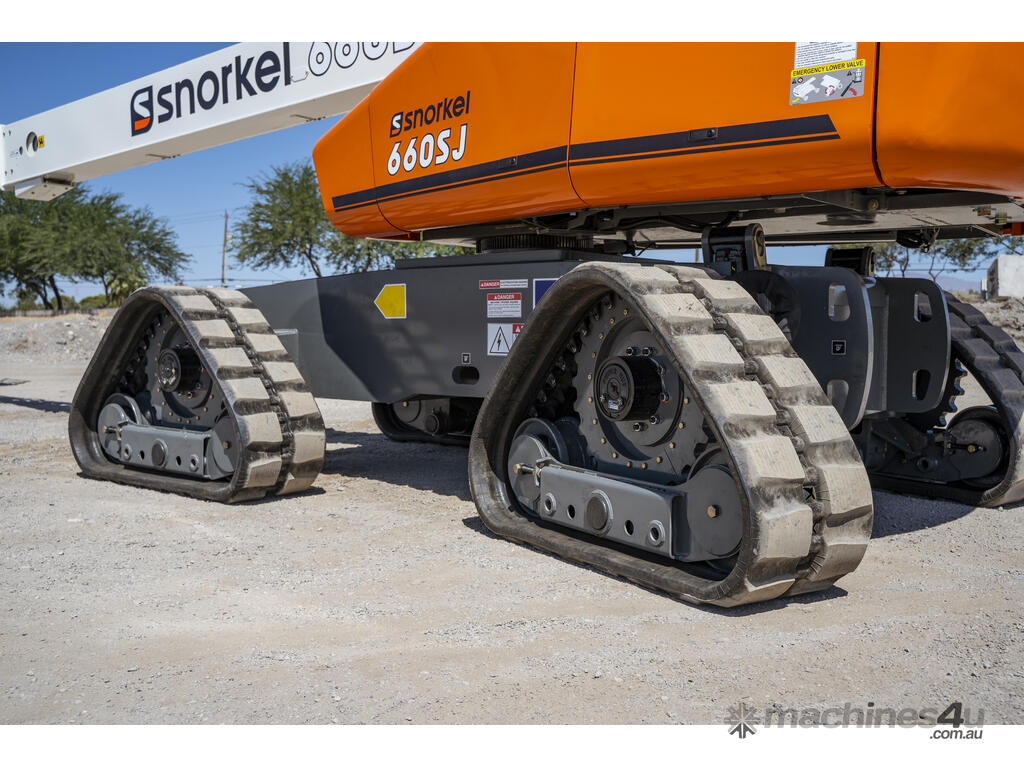 The Snorkel 660SJ All Terrain telescopic boom lift offers enhanced traction. Turf-friendly independent rubber tracks can traverse uneven terrain without sinking into loose sediment, soft soil, sand, snow and mud. Designed with full-time active oscillating axle, the 660SJ All Terrain delivers smooth performance and low ground pressure on sensitive environments.