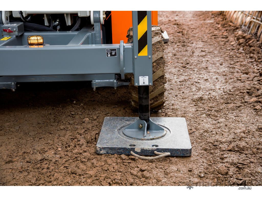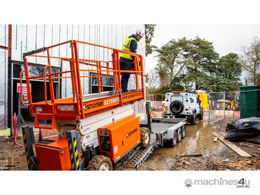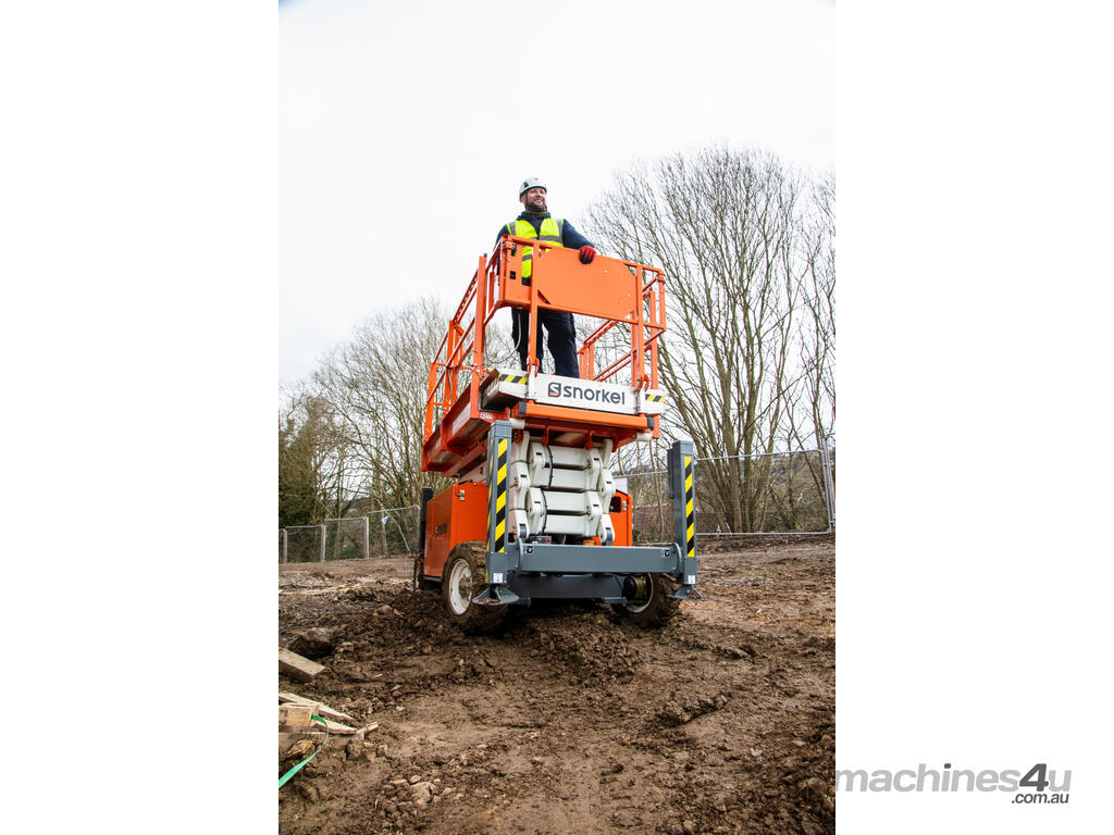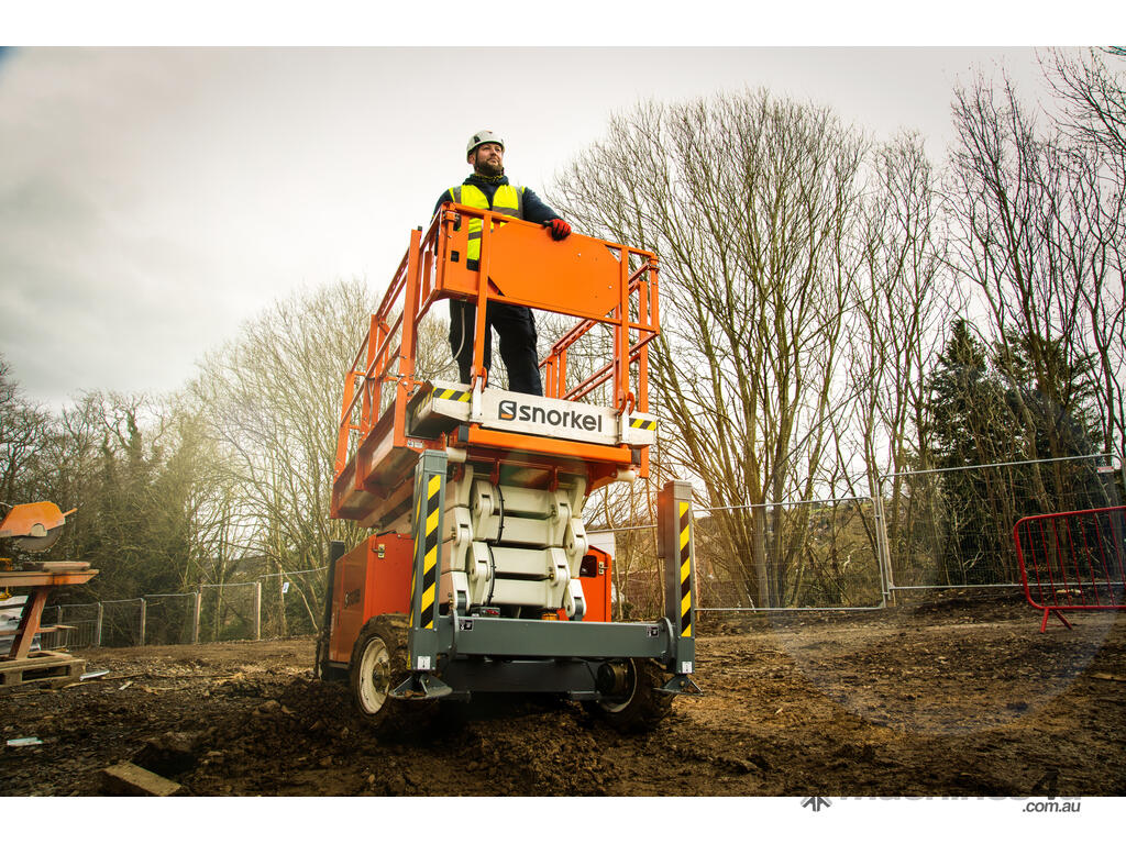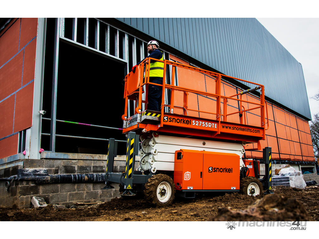 The Snorkel S2755RTE electric narrow scissor lift is designed to be ultra-compact for outdoor work in confined spaces. Long-lasting lithium batteries mean clean and quiet operation that can be used indoors or outdoors. Equipped with hydraulic outriggers as standard, the S2755RTE features automatic leveling on uneven ground with excellent off-road performance.