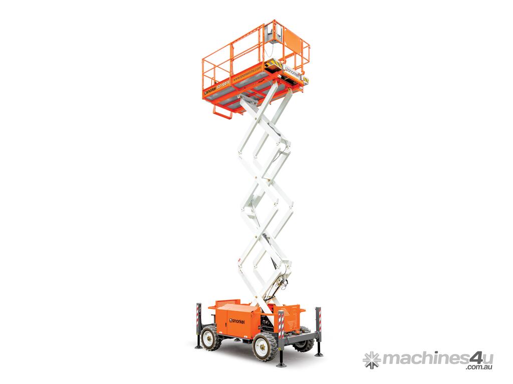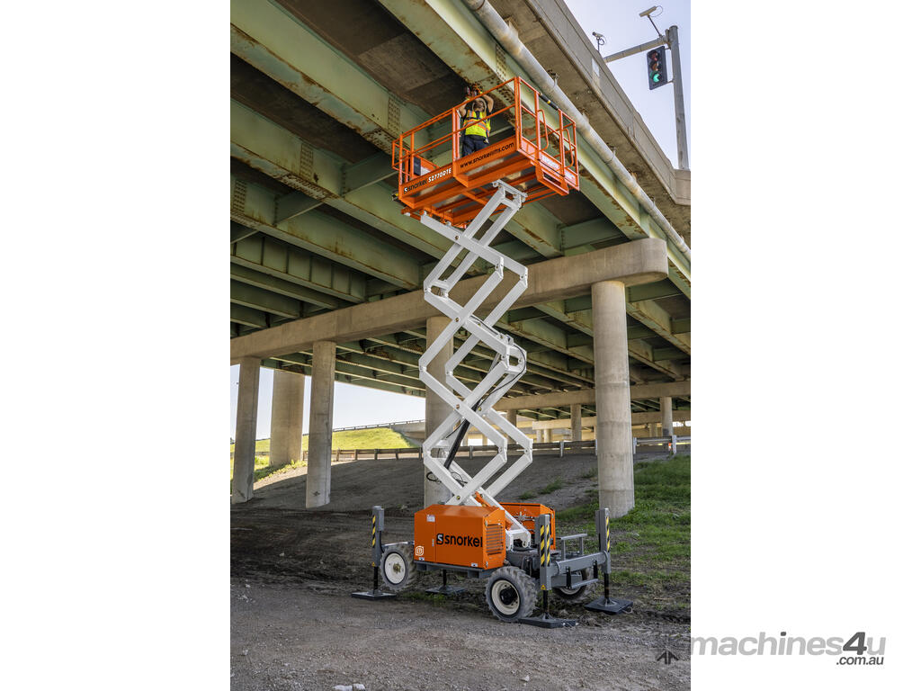 The Snorkel S2770RTE compact rough terrain electric scissor lift offers excellent maneuverability. Its robust 4-wheel drive is paired with a lightweight, compact design. The S2770RTE can handle rough terrain and work in confined spaces with ease. Powered by lithium-ion batteries, it provides long-lasting and quiet performance.