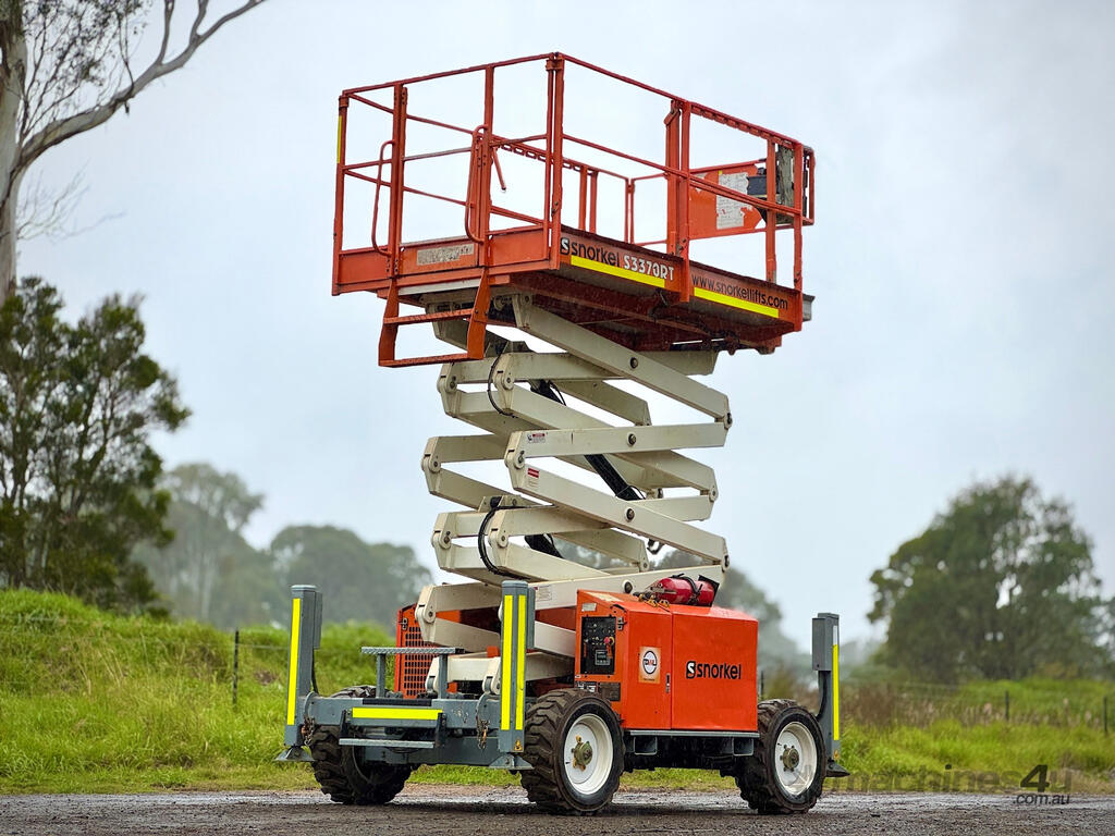 The Snorkel S3370BE is a compact scissor lift which can be operated on either its diesel engine, for outdoor rough terrain work, or switched to DC electric for working indoors. Fitted with high grip, non-marking types as....