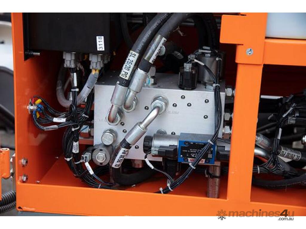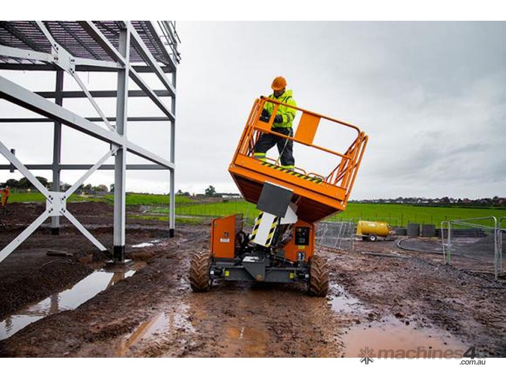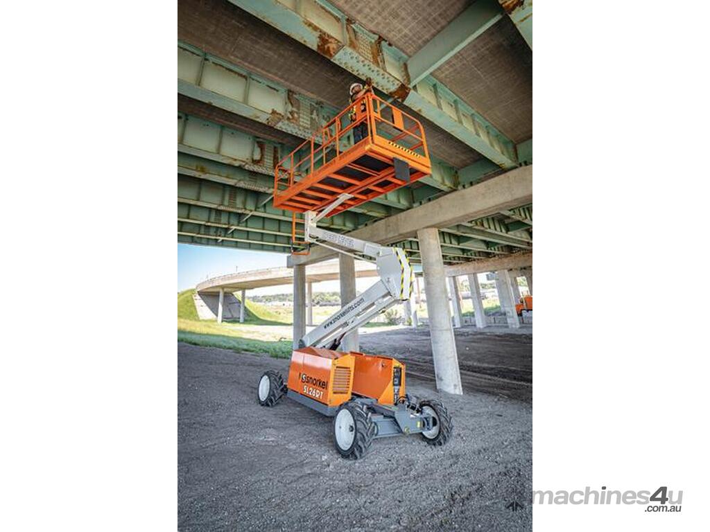 The Snorkel SL26RTE all-electric Speed Level is powered by long-lasting lithium batteries. Its quiet performance is balanced by automatic self-leveling capabilities, without outriggers. Equipped with a 3 ft. (0.91m) roll-out deck extension, the SL26RTE features a 5 ft. 8 in. x 15 ft. (1.72m x 4.6m) platform, when extended, able to lift up to five people with tools.
