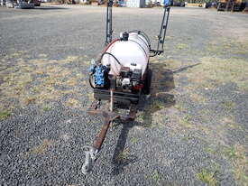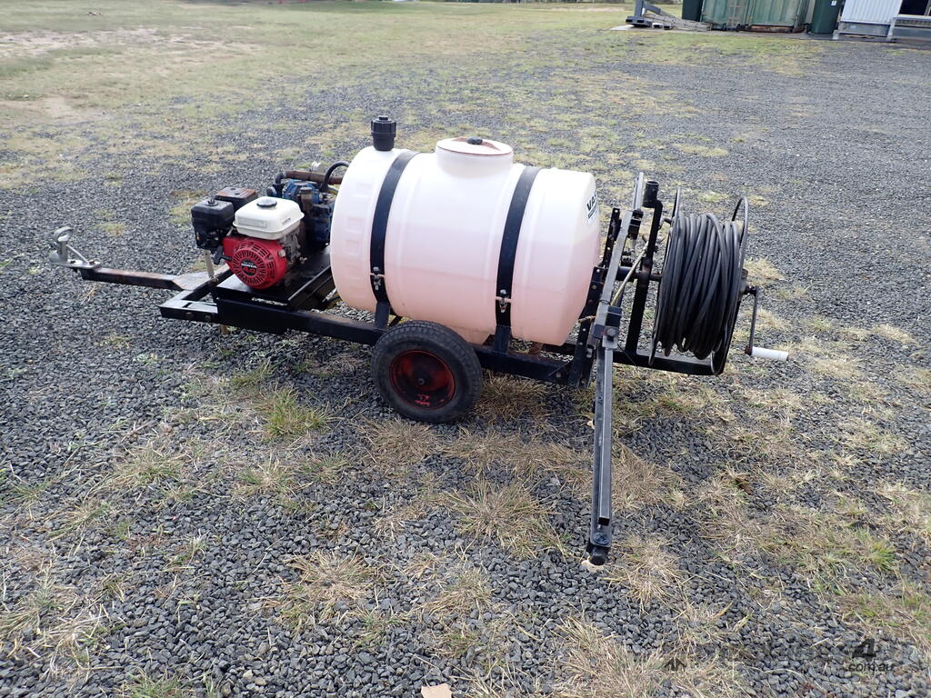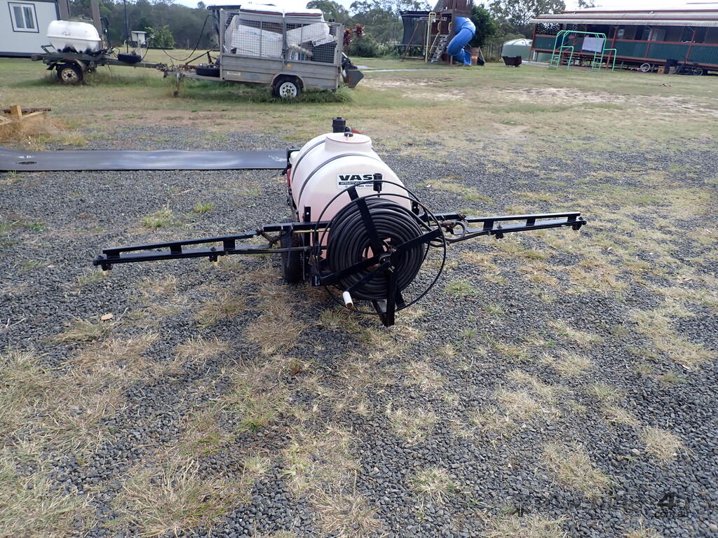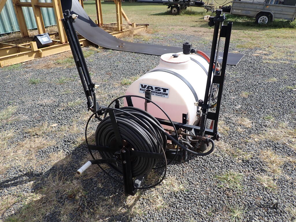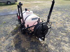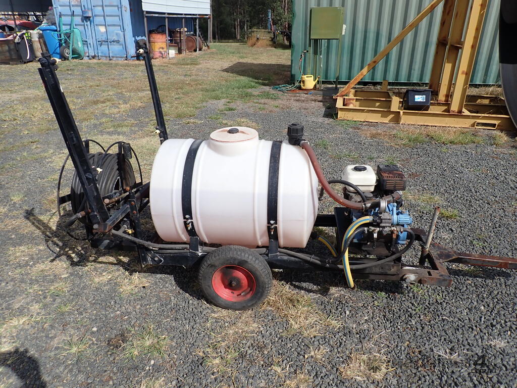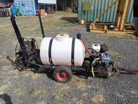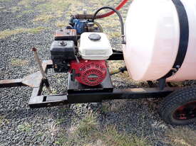 Spray unit trailer mounted, suit behind a quad or ride on mower or similar, suit weed spraying or fire fighting, Vast Spraying Equipment brand, 220L poly tank, Honda GX120 petrol engine pull start, Bertolini diaphragm pump, up to 65L/Min, maximum 15 BAR pressure, fold out boom sprays to 2.5m wide, long hose on reel with spray wand, starts and runs and sprays, tidy unit.