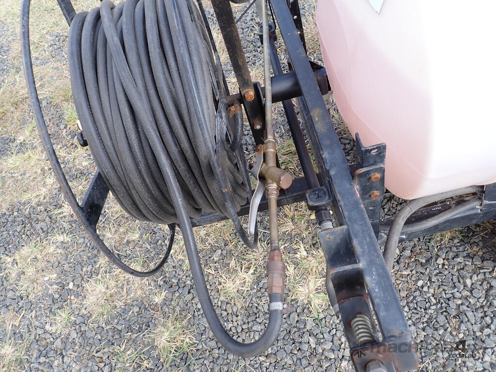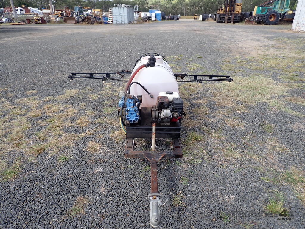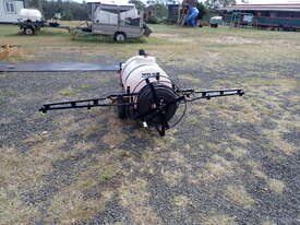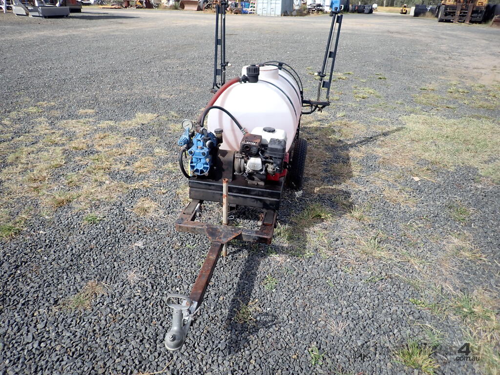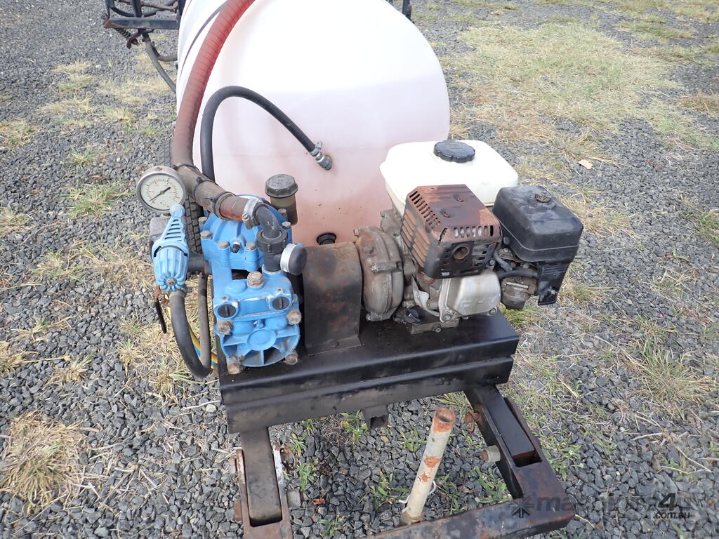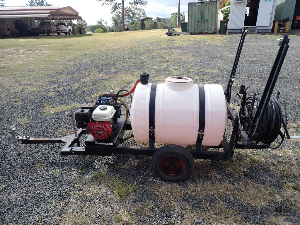 Spray unit trailer mounted, suit behind a quad or ride on mower or similar, suit weed spraying or fire fighting, Vast Spraying Equipment brand, 220L poly tank, Honda GX120 petrol engine pull start, Bertolini diaphragm pump, up to 65L/Min, maximum 15 BAR pressure, fold out boom sprays to 2.5m wide, long hose on reel with spray wand, starts and runs and sprays, tidy unit.