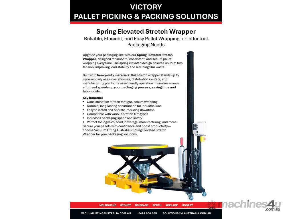 Tired of inconsistent wrapping and wasted film? The **Spring Elevated Stretch Wrapper** from **Vacuum Lifting Australia** delivers smooth, secure, and consistent pallet wrapping—**every time**. Its spring-elevated design automatically maintains optimal film tension, helping you improve load stability, reduce film usage, and eliminate rewraps.