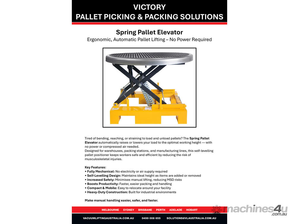 Contact **Vacuum Lifting Australia** today to learn how the **Spring Pallet Elevator** can improve safety and productivity in your operation. Expert advice, great pricing, and fast delivery across Australia.