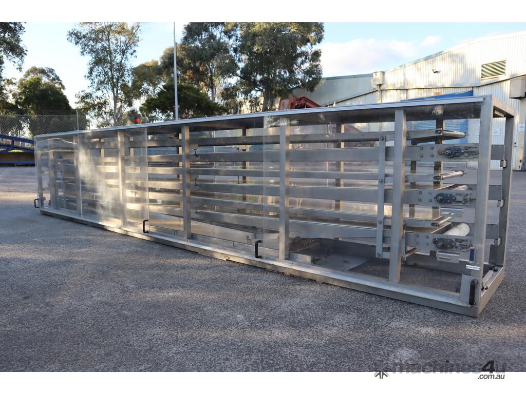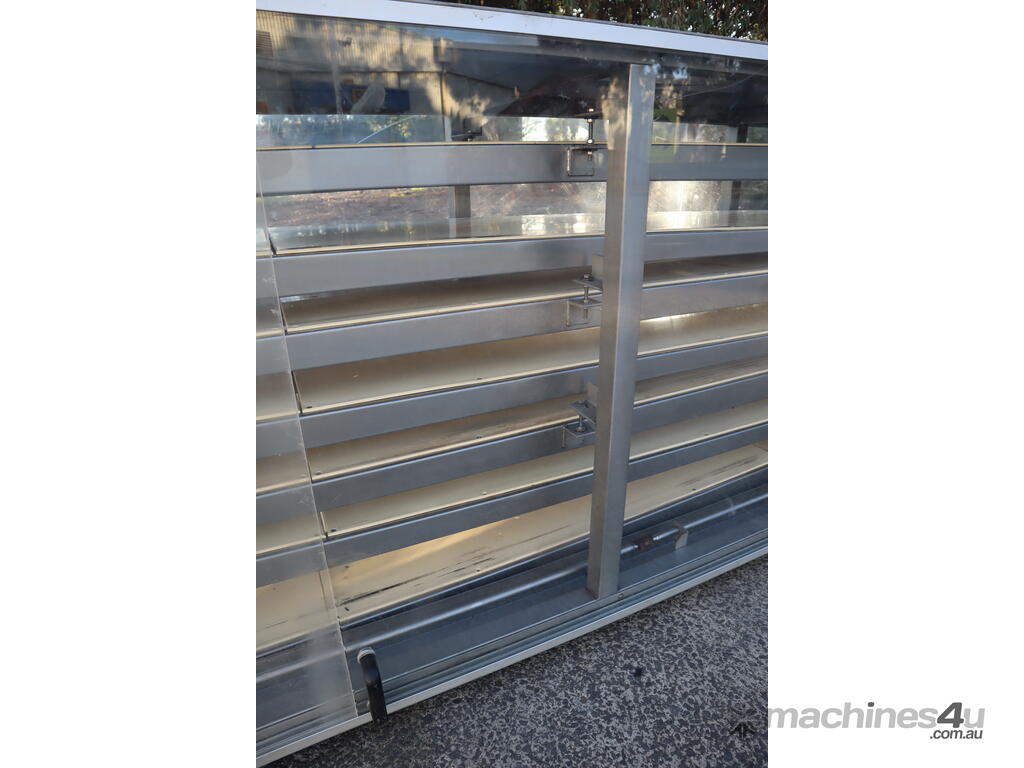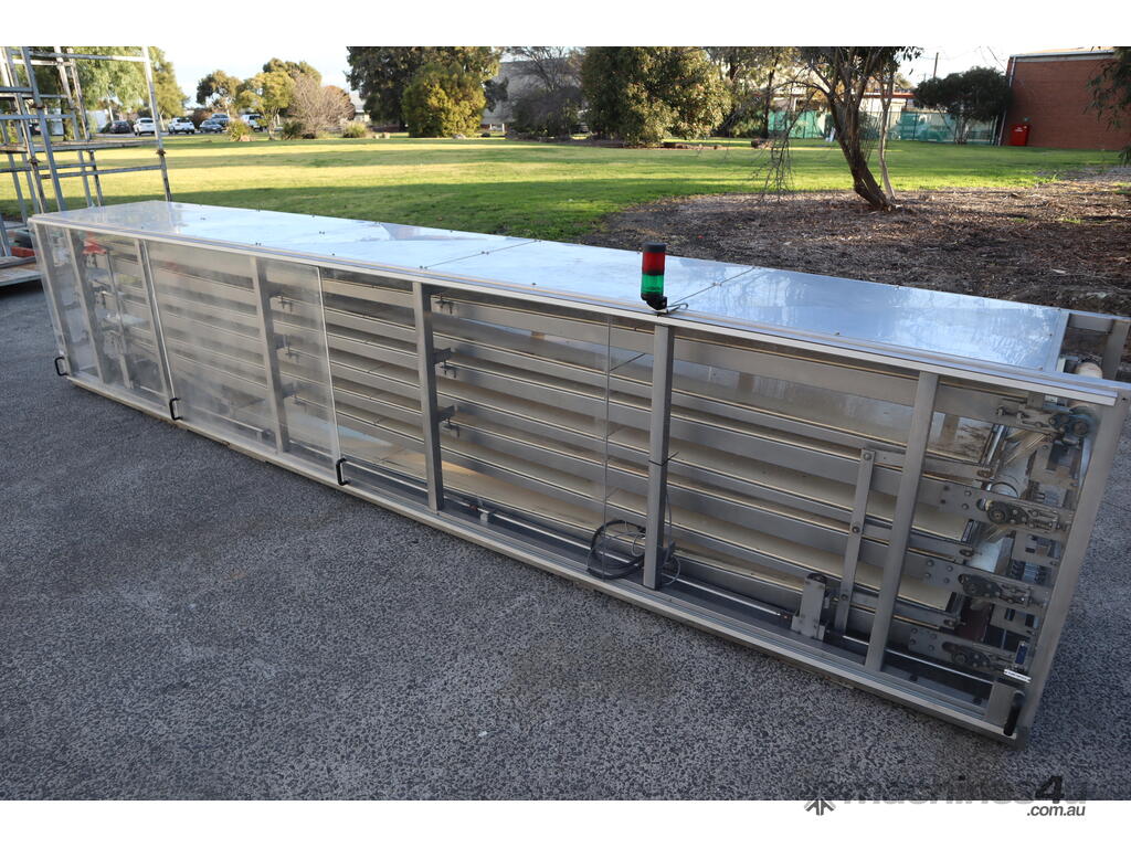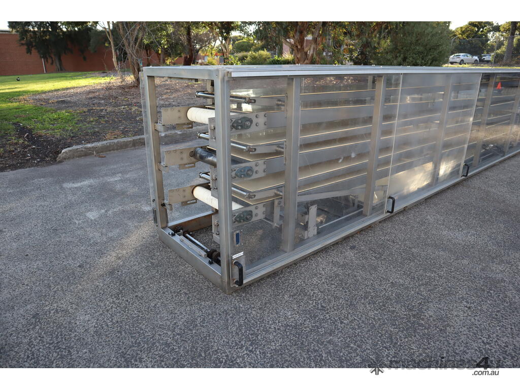 This cooling conveyor is in great condition. There are 7 lengths of conveyors inside a stainless frame with sliding acrylic panels.