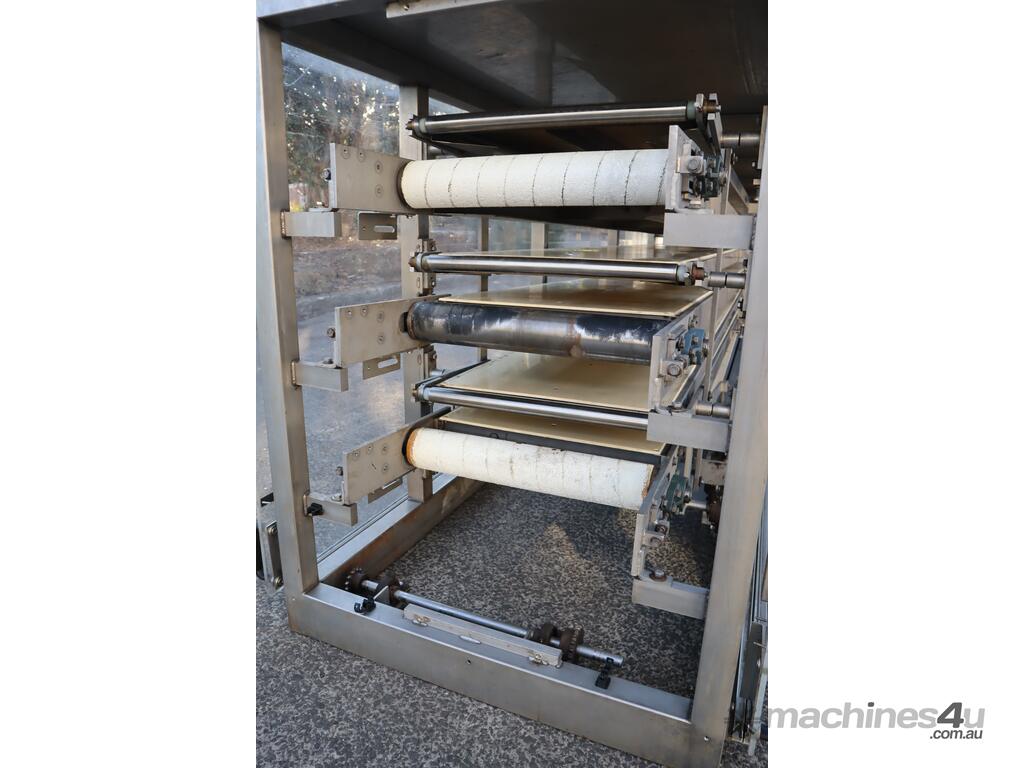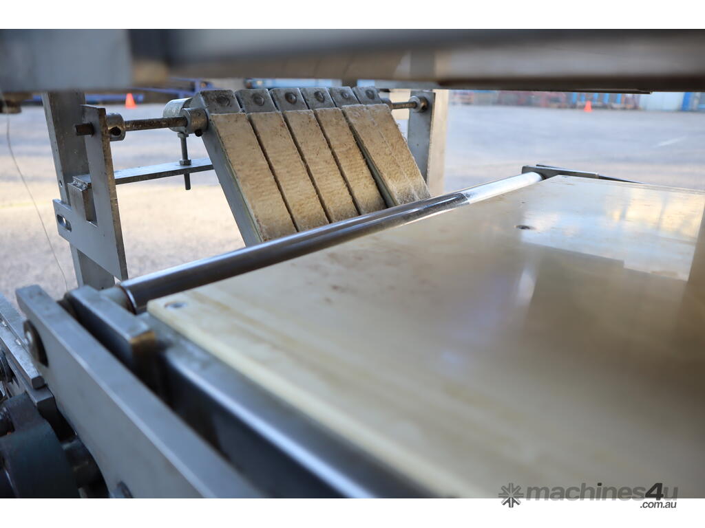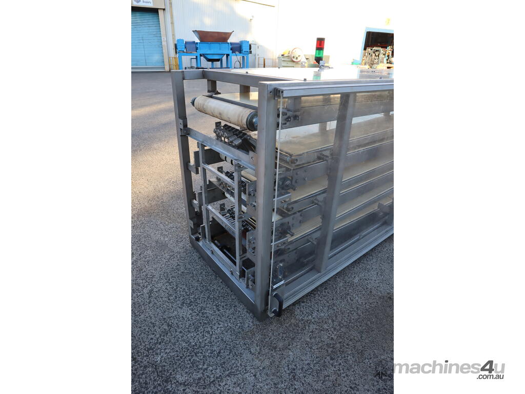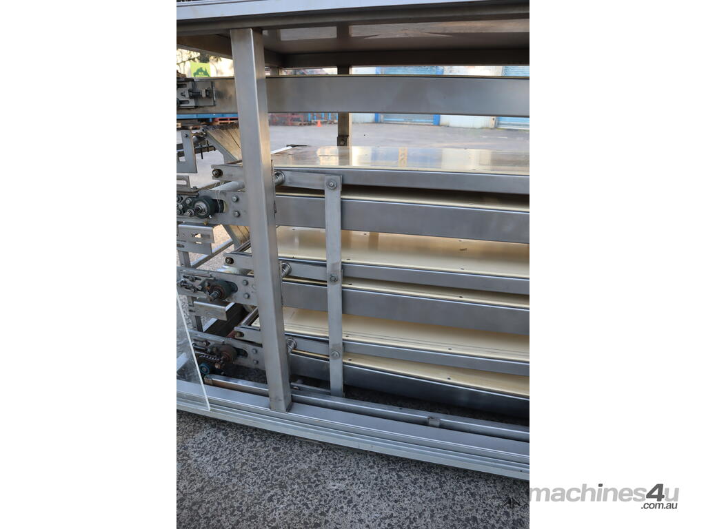 This cooling conveyor is in great condition. There are 7 lengths of conveyors inside a stainless frame with sliding acrylic panels.