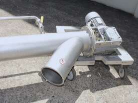 Stainless Steel Auger Screw, Mix Srl?, dimensions: 150mm dia x 4200 long, rectangular inlet size: 260 x 290mm and a 150mm dia outlet, driven by a three phase 1.1 kw 70rpm geared motor, provided with 4 x stainless steel interconnected valves to add liquid, complete stainless steel, overall length 4800 mm