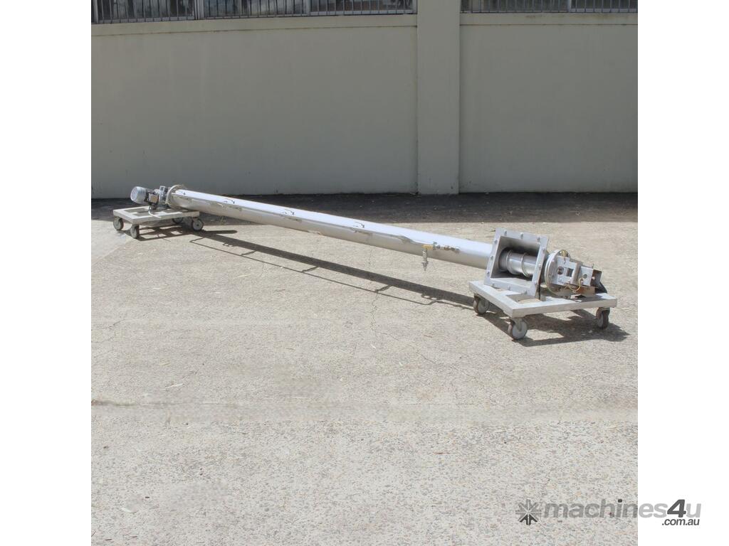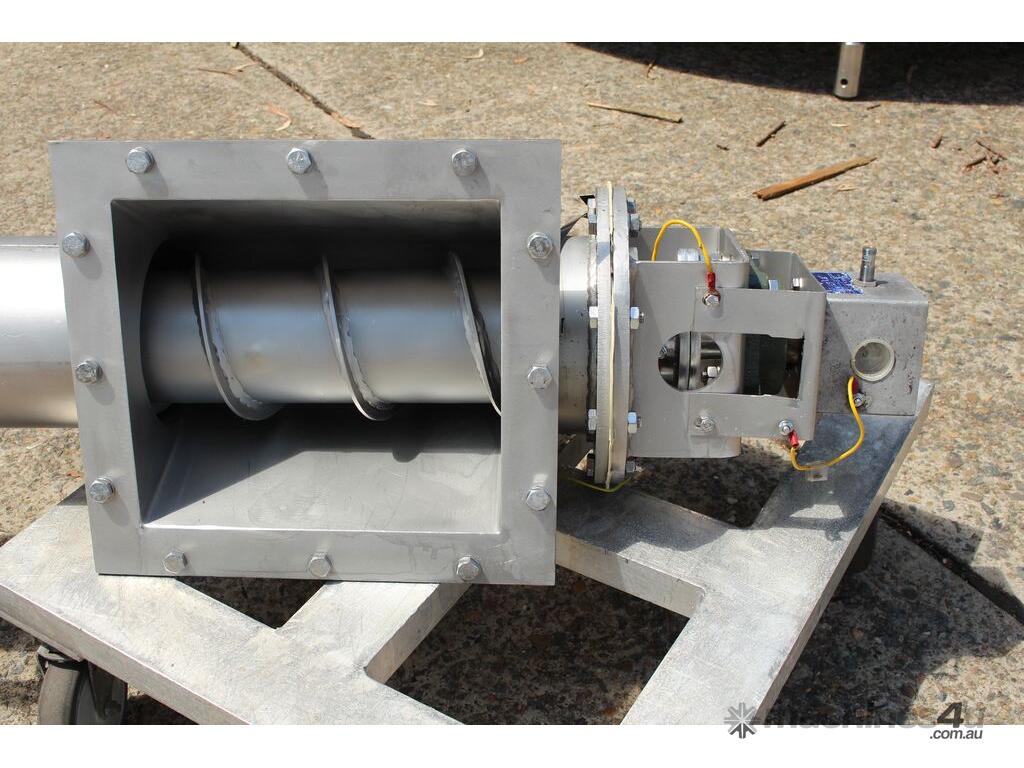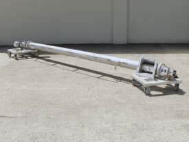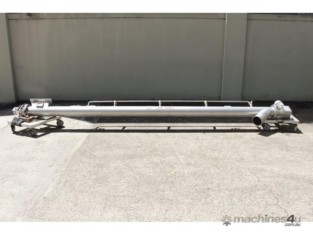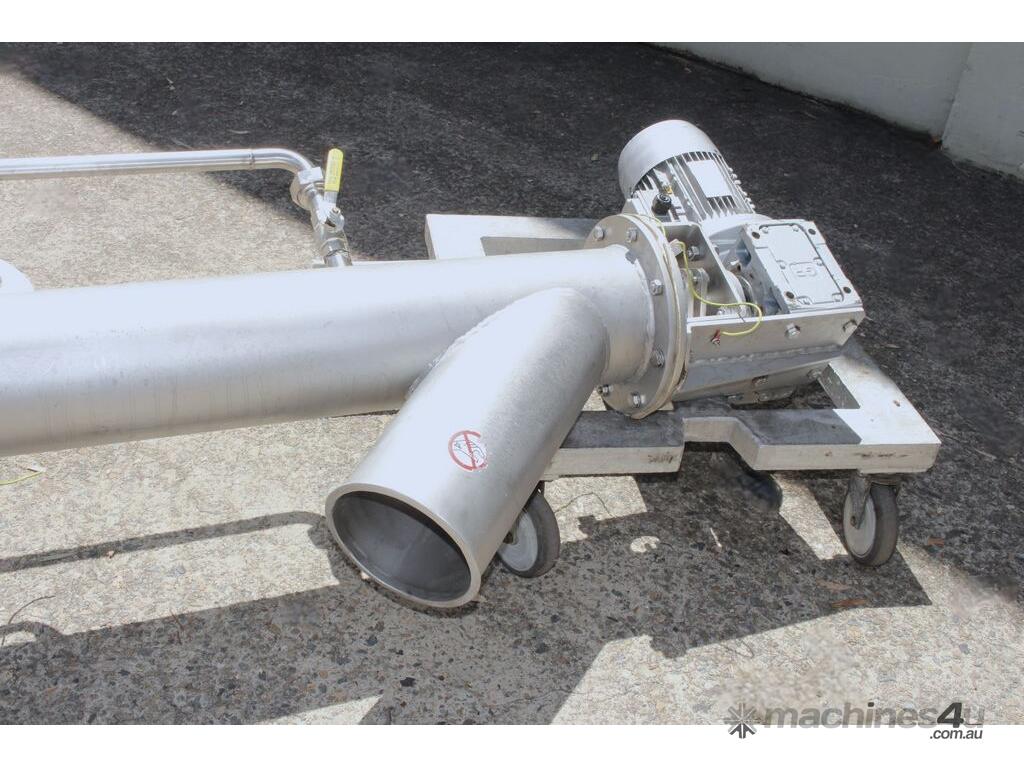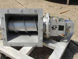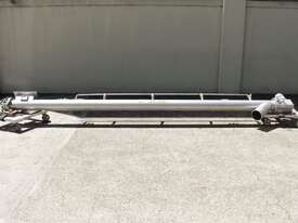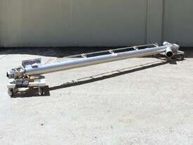 Stainless Steel Auger Screw, “Mix Srl”, dimensions: 150mm dia x 4200 long, rectangular inlet size: 260 x 290mm and a 150mm dia outlet, driven by a three phase 1.1 kw 70rpm geared motor, provided with 4 x stainless steel interconnected valves to add liquid, complete stainless steel, overall length 4800 mm