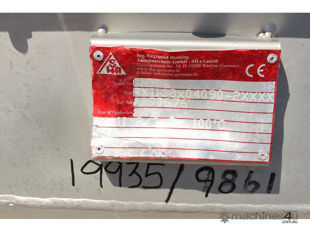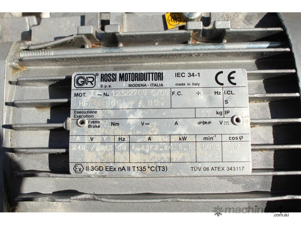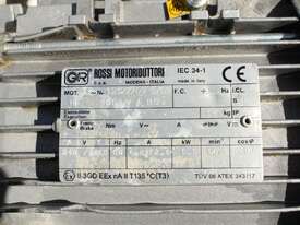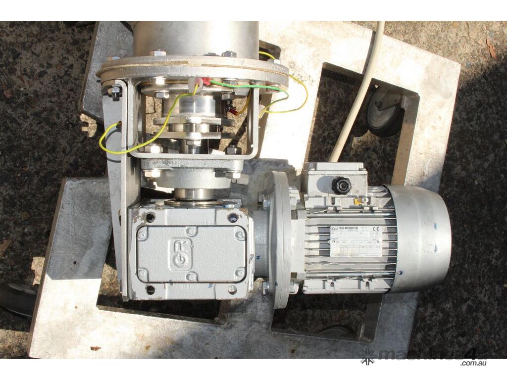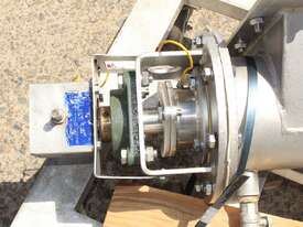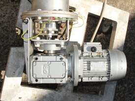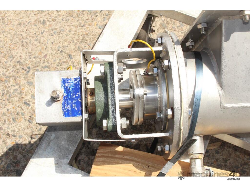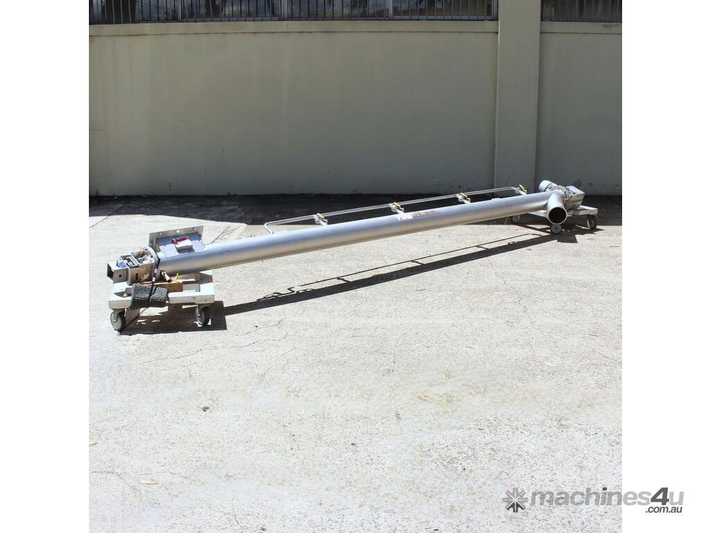 Stainless Steel Auger Screw, “Mix Srl”, dimensions: 150mm dia x 4200 long, rectangular inlet size: 260 x 290mm and a 150mm dia outlet, driven by a three phase 1.1 kw 70rpm geared motor, provided with 4 x stainless steel interconnected valves to add liquid, complete stainless steel, overall length 4800 mm