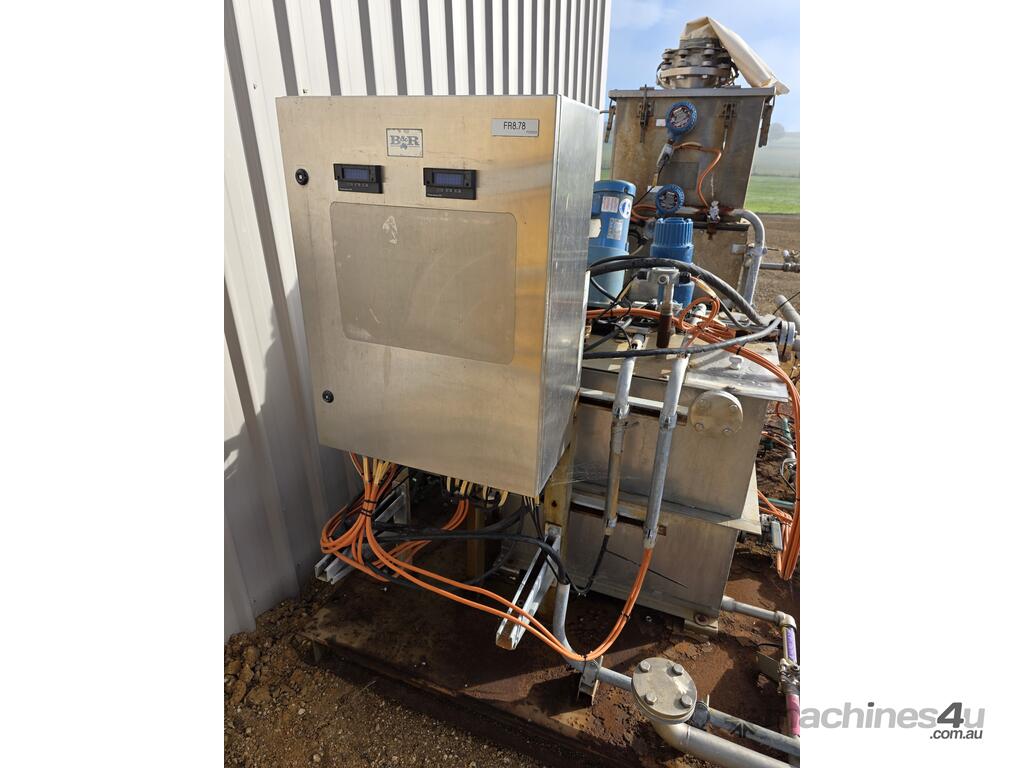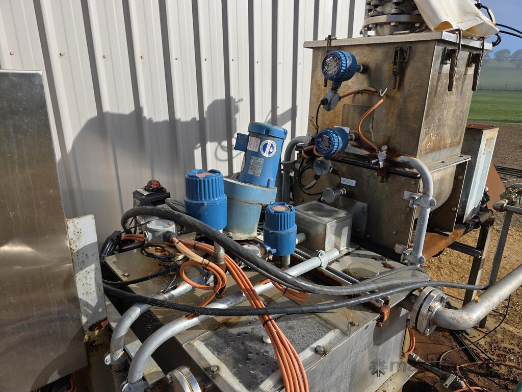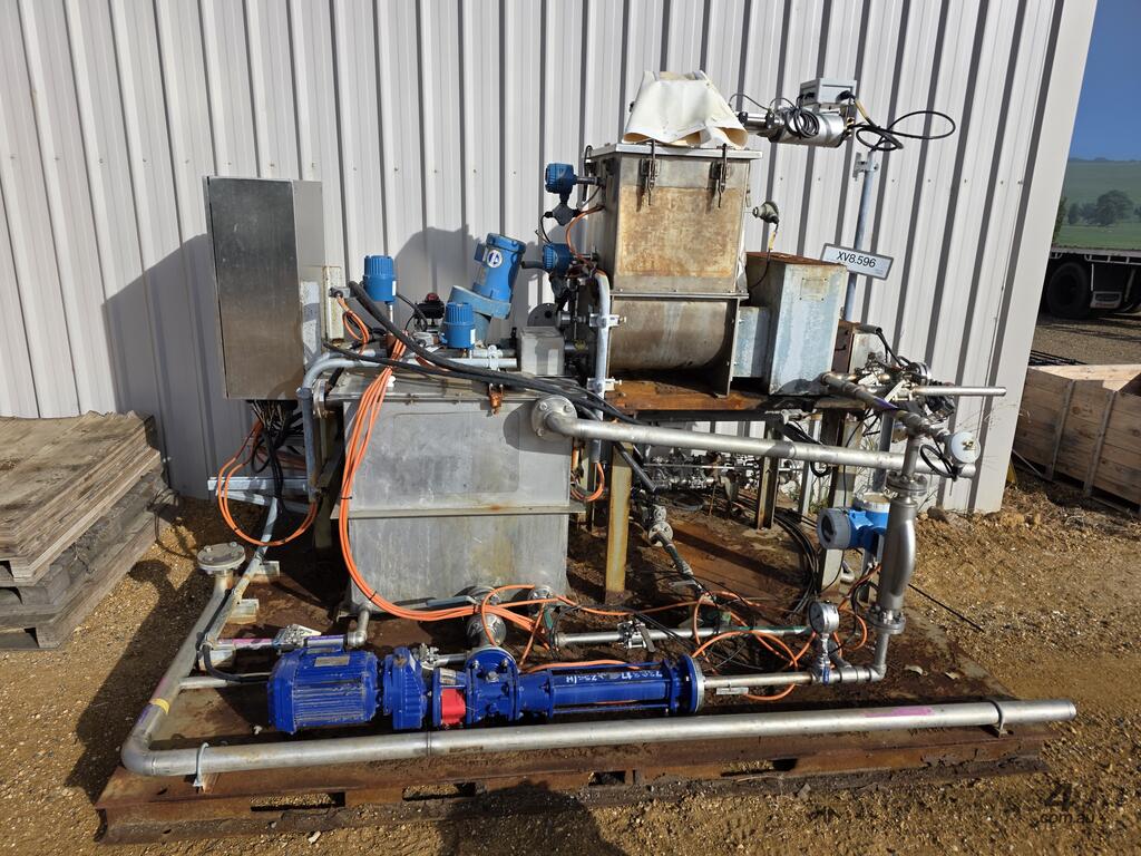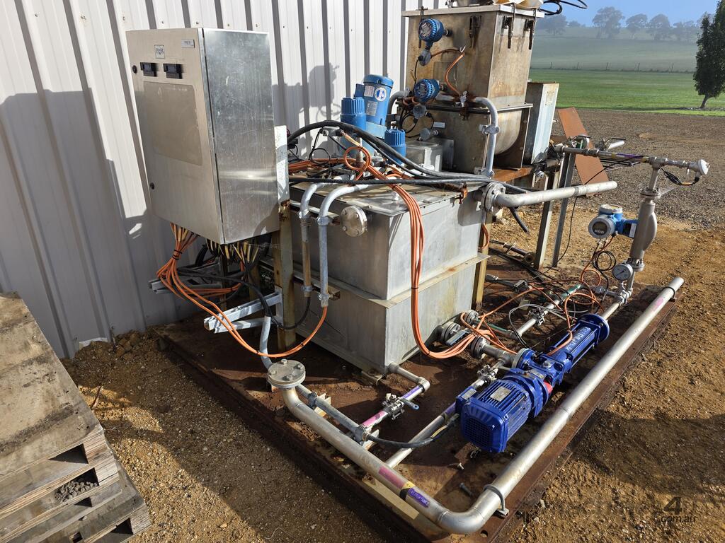 Industrial stainless steel chemical mixing and dosing plant mounted on heavy-duty skid frame. suitable for industrial process dosing, water treatment, chemical batching, or custom plant modification.