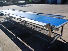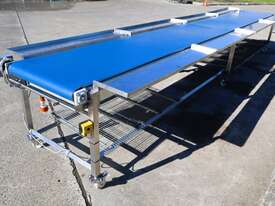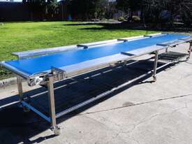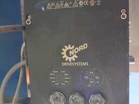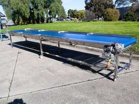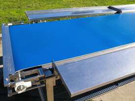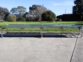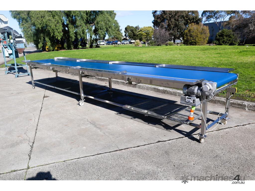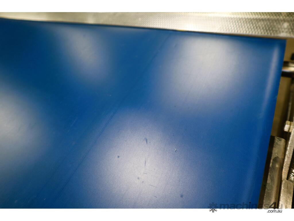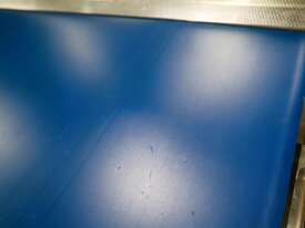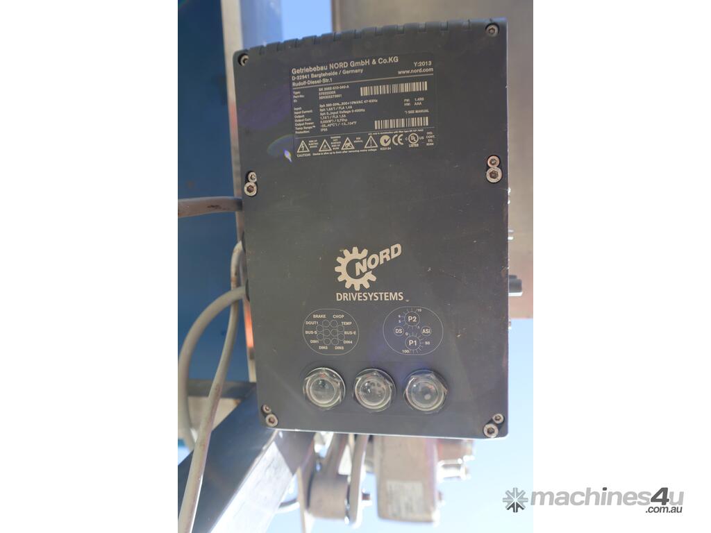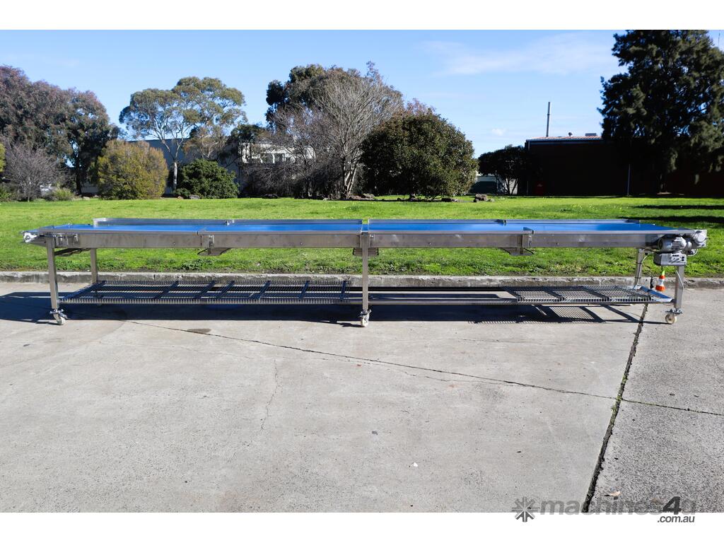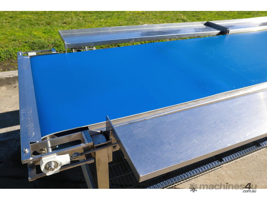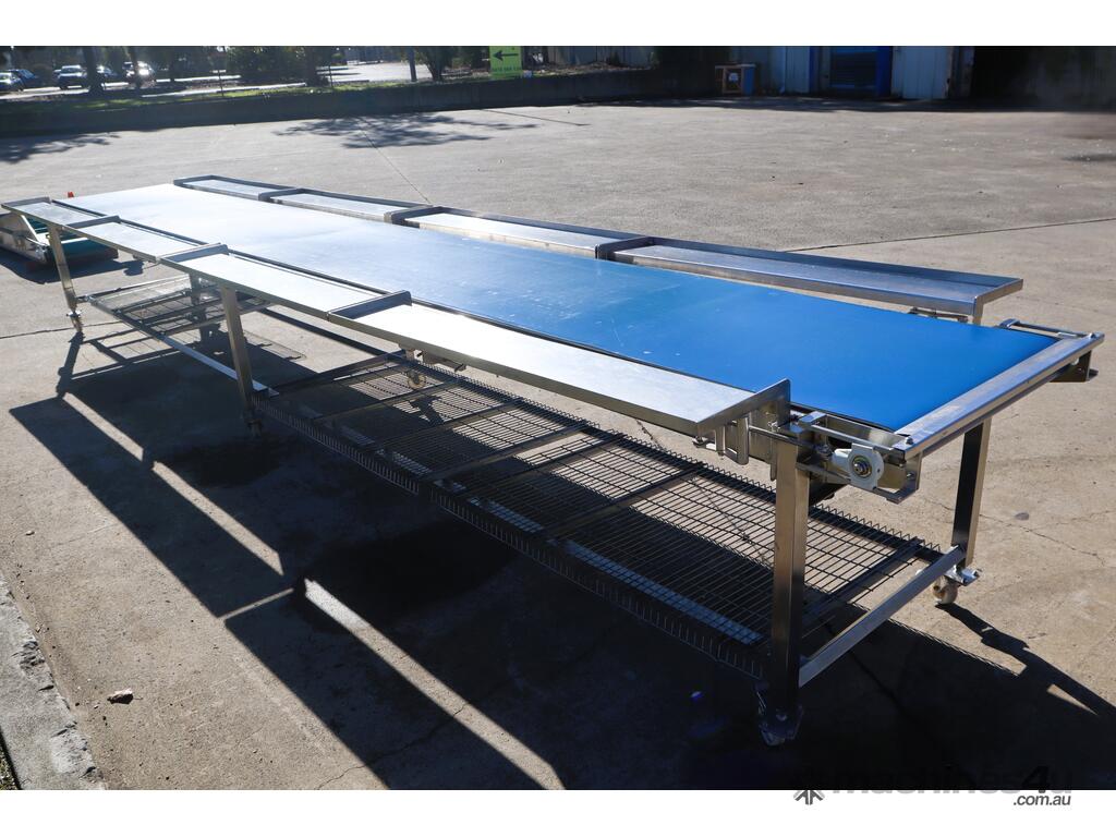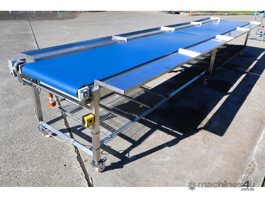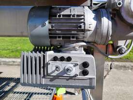 Motorised and with a stainless steel frame, this conveyor is in excellent condition. It comes with stainless steel trays that can be mounted on the sides and has a VSD installed.