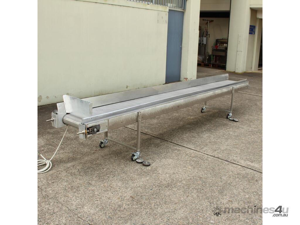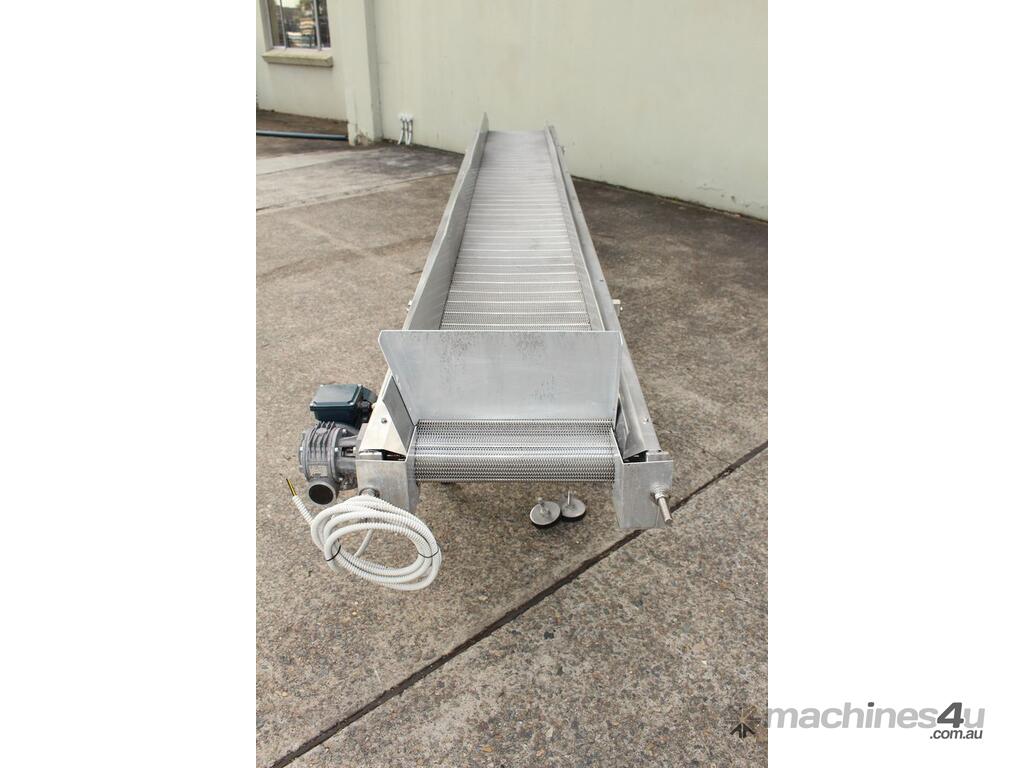 Stainless Steel Link Chain Conveyor, size: 400mm wide x 3900mm long x 530mm high, stainless steel belt, driven by 3 phase geared motor, with side guide rails