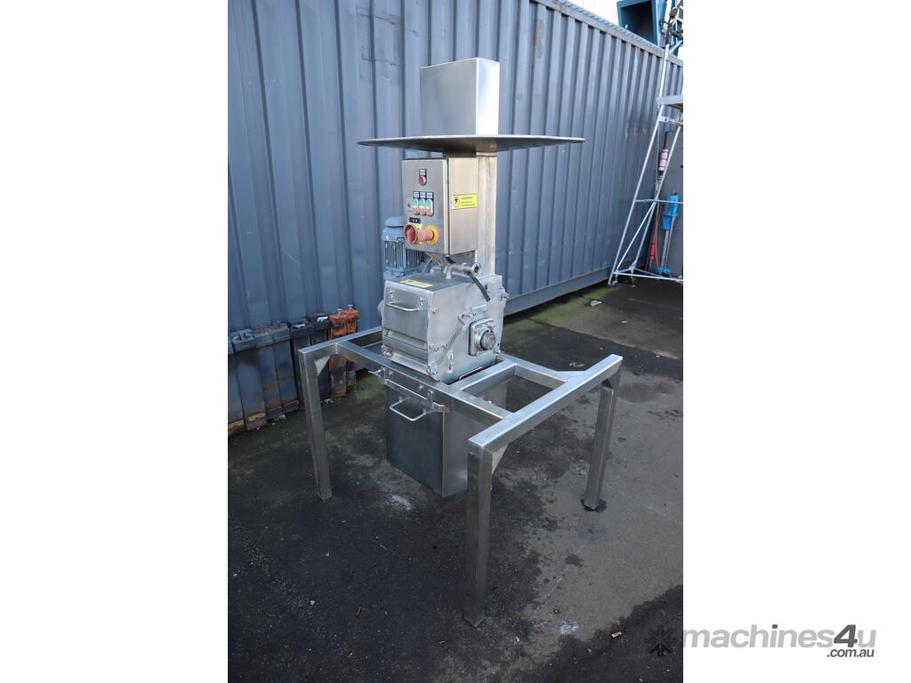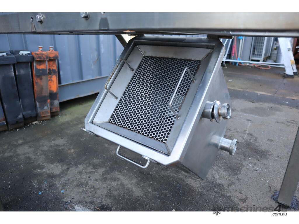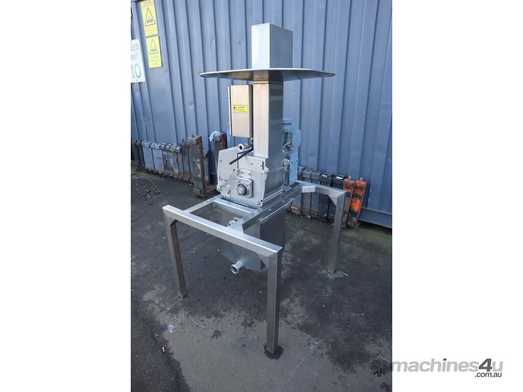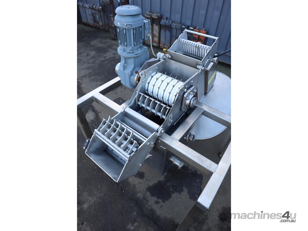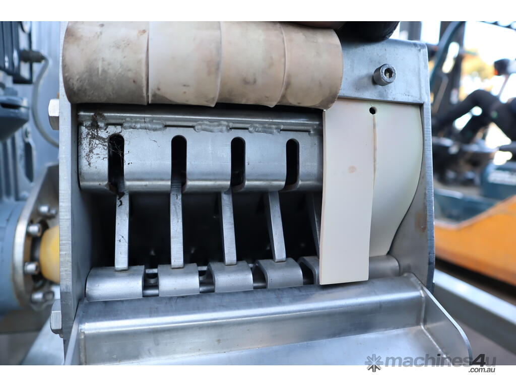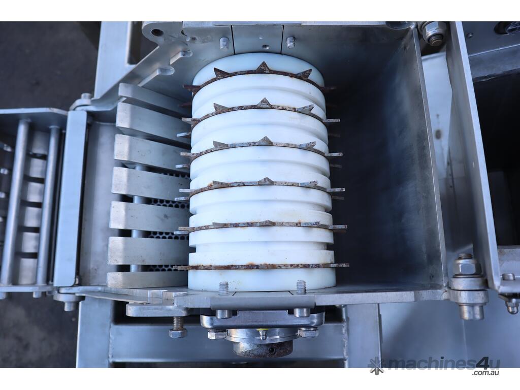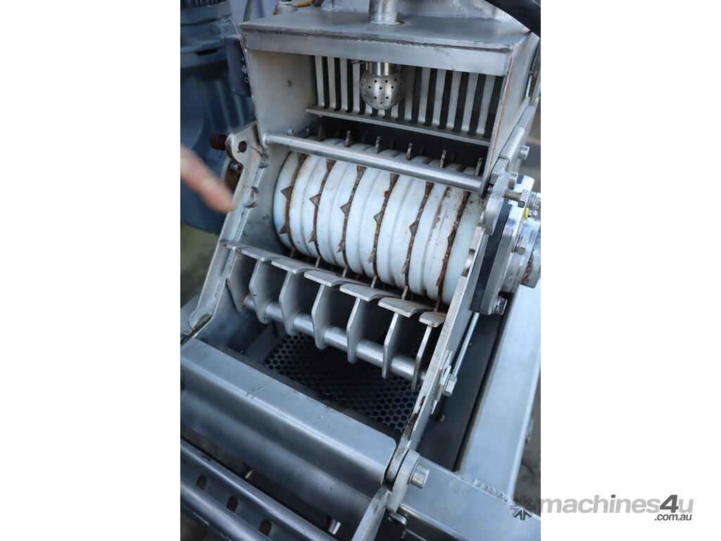 Designed to shred and break apart bottles and cans, the liquid contents fall through into the tank and the solids are ejected through the side.