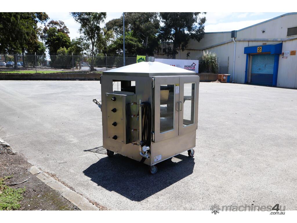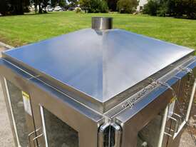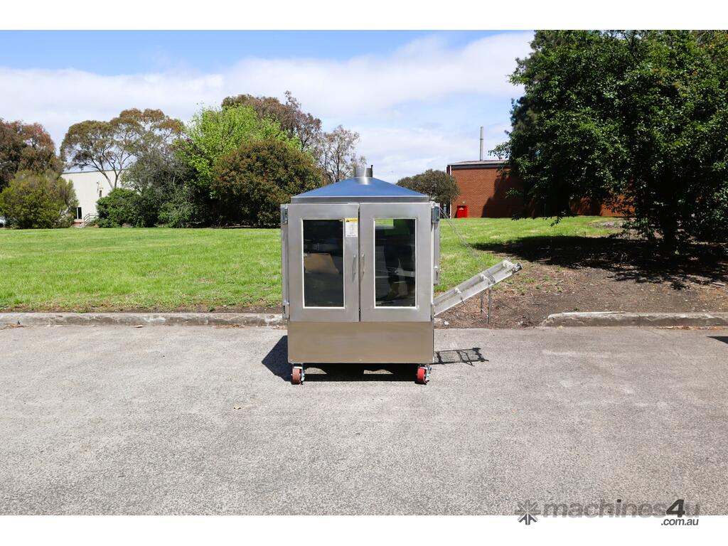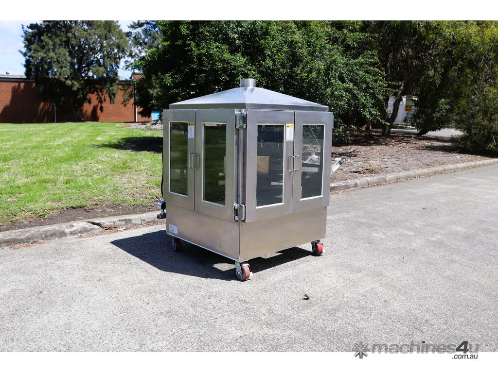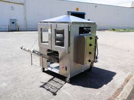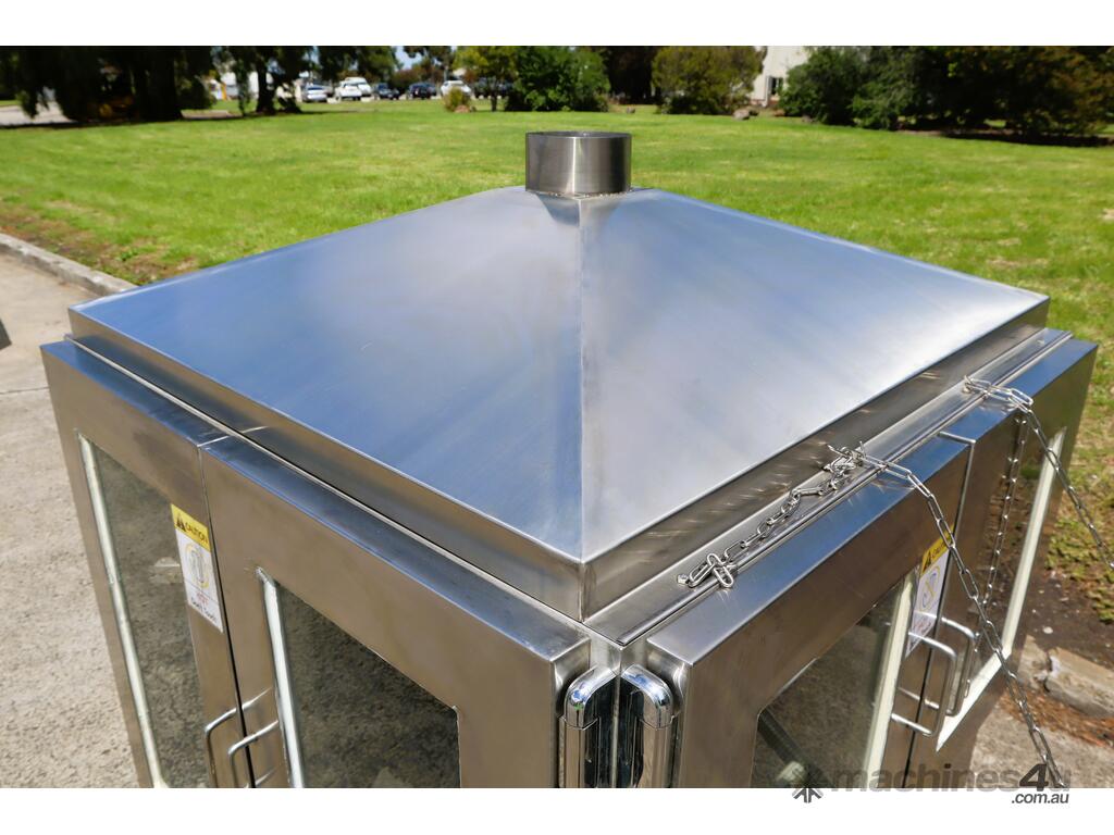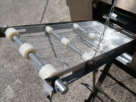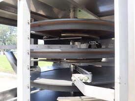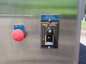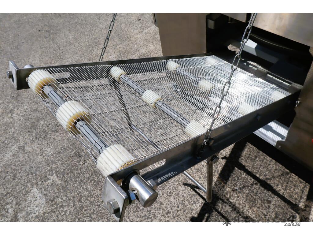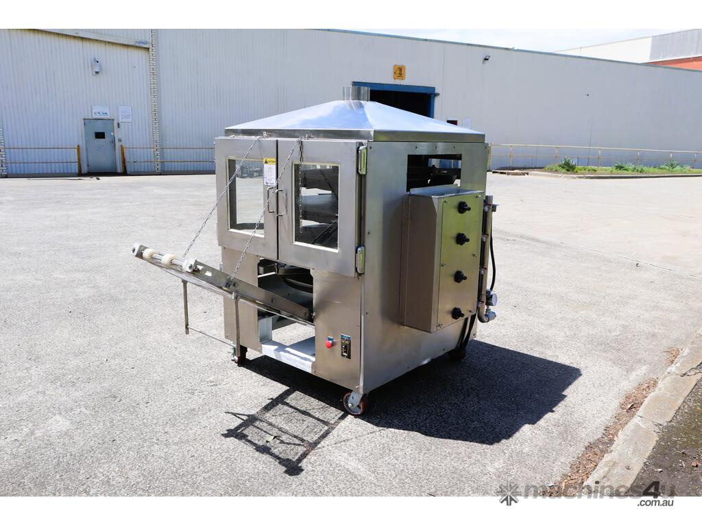 Industrial tortilla oven in excellent condition designed for continuous baking of tortillas as part of a commercial production line. Full stainless steel construction with viewing panels allows for consistent baking and monitoring during operation.