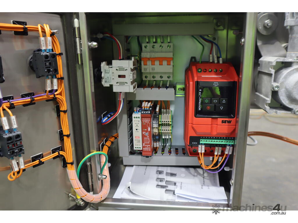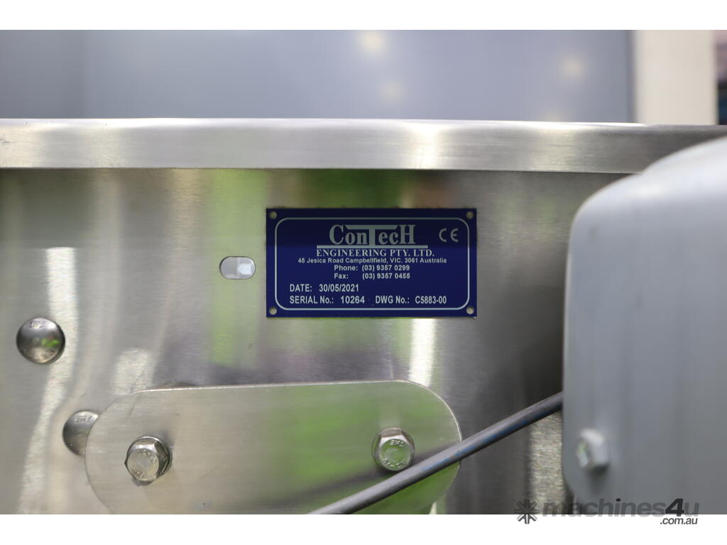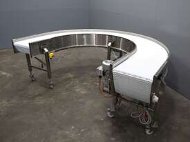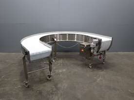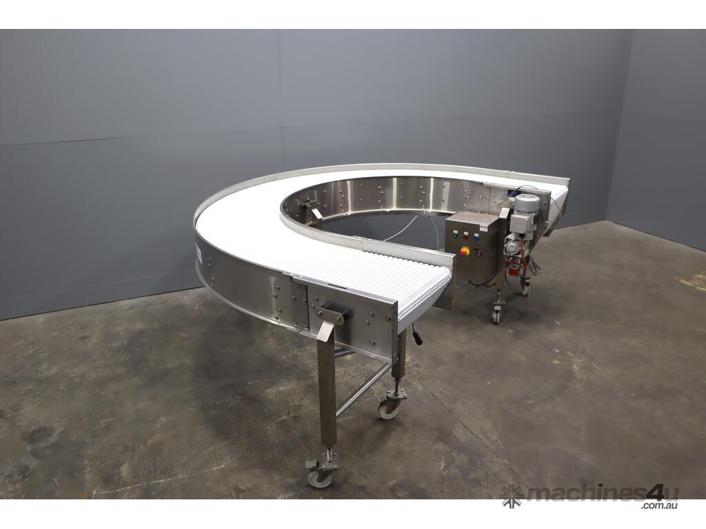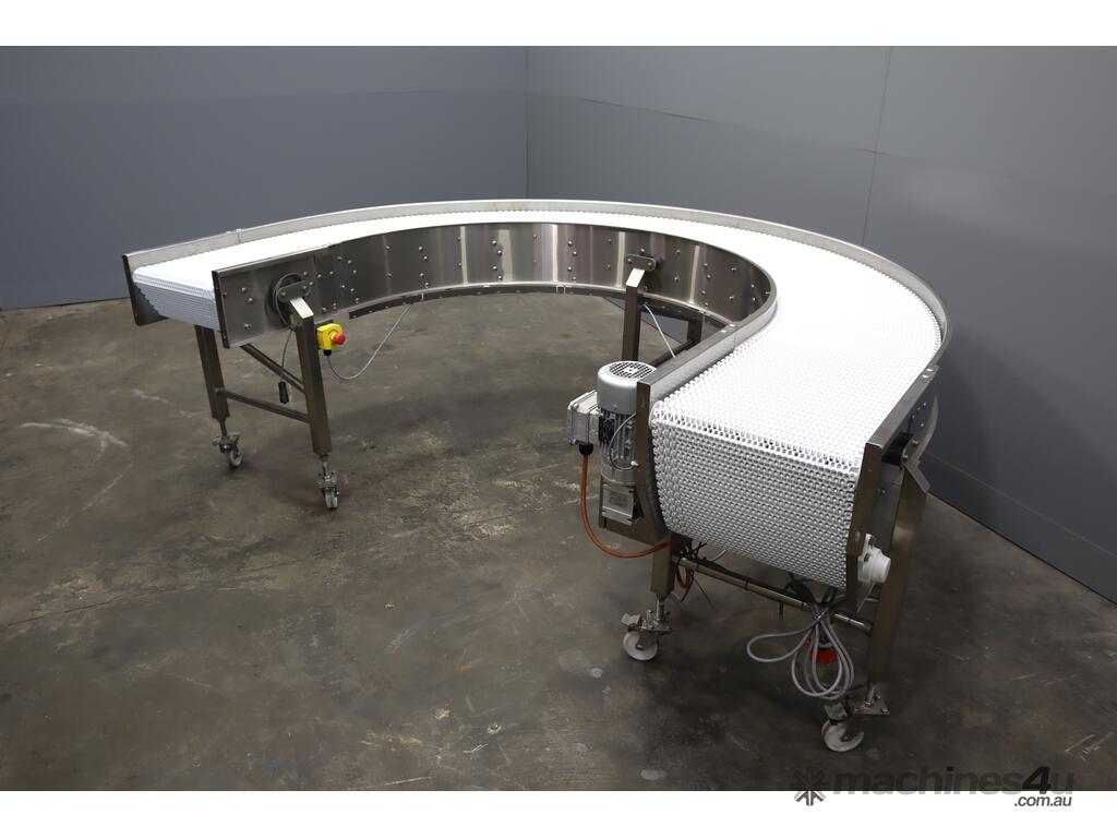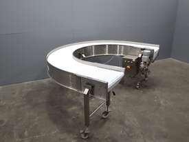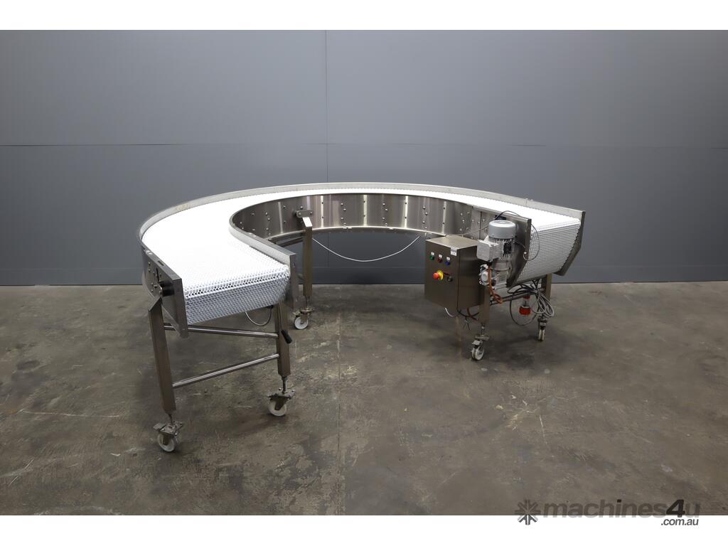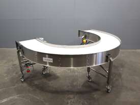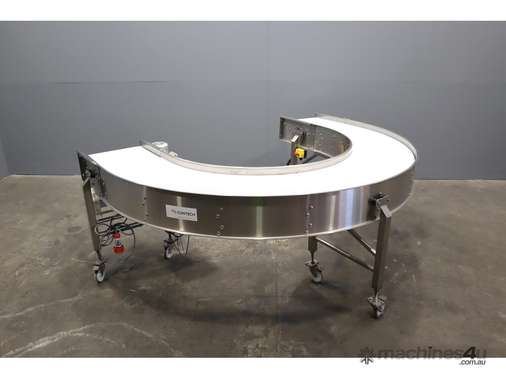 2021 Contech 180 degree curved conveyor in excellent condition. Designed to smoothly transfer product around a compact footprint and radius to bring it back along the line.