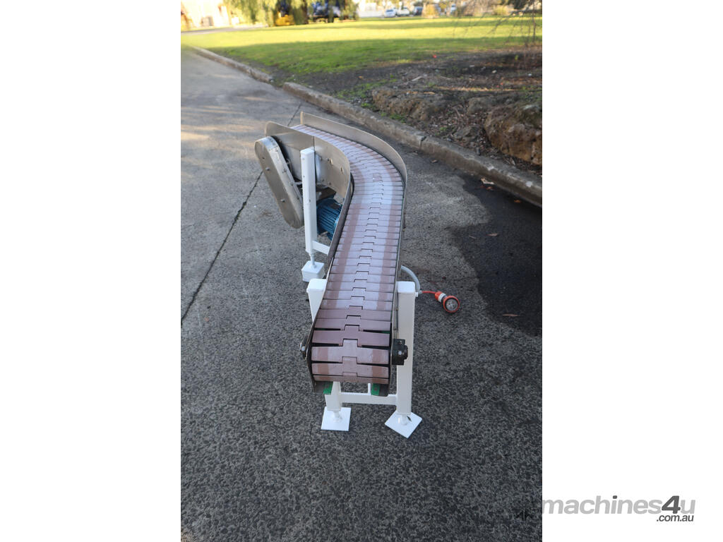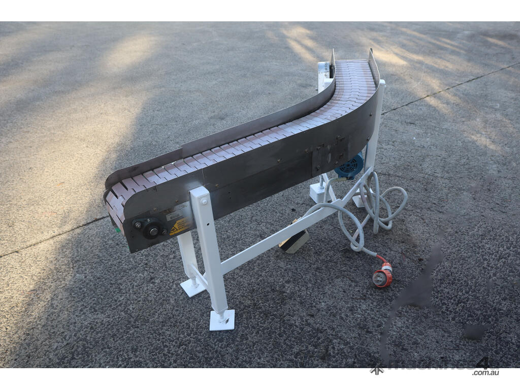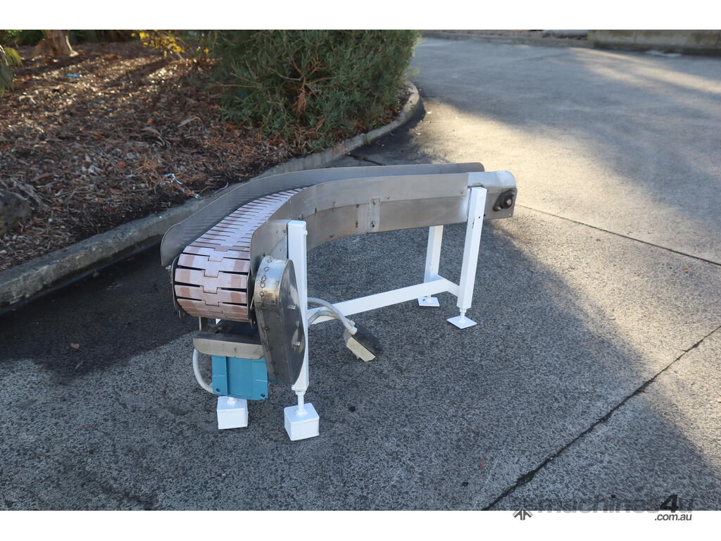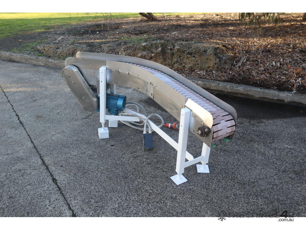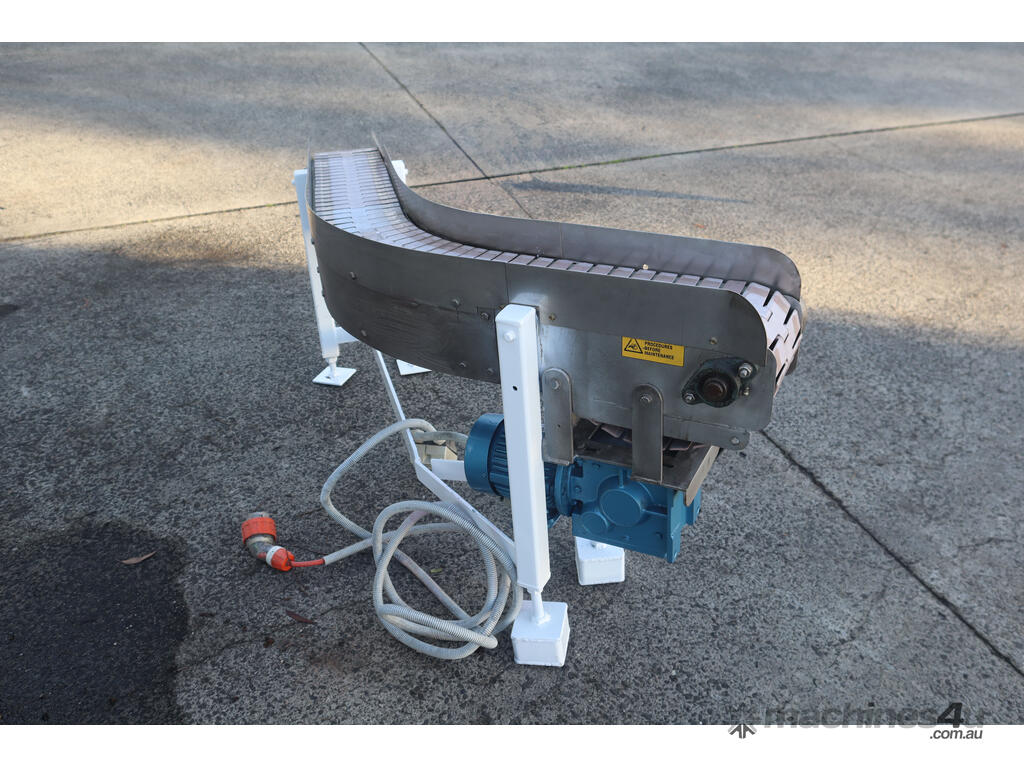 This conveyor is in good condition. The frame is made out of stainless steel and the belt is of a slatted design. The leg heights can be manually adjusted.