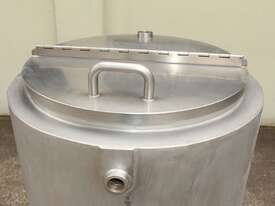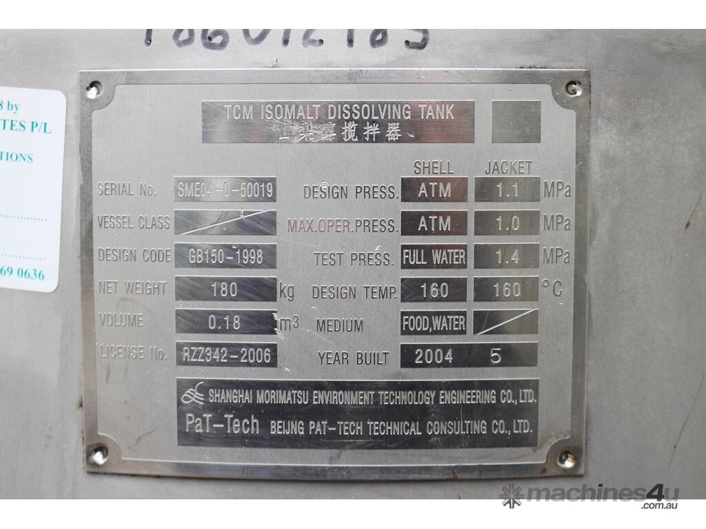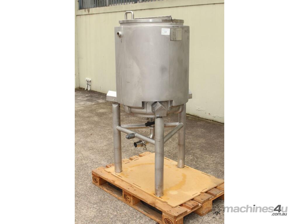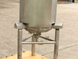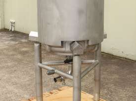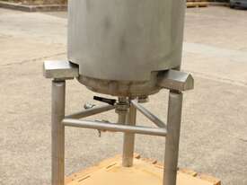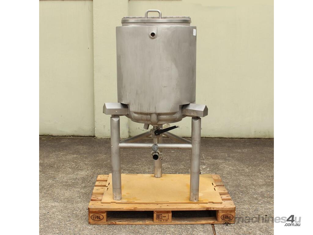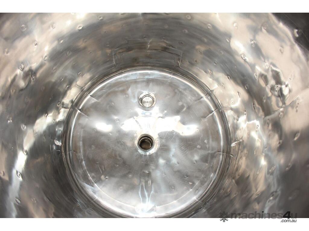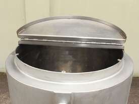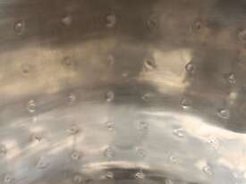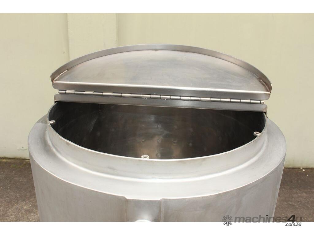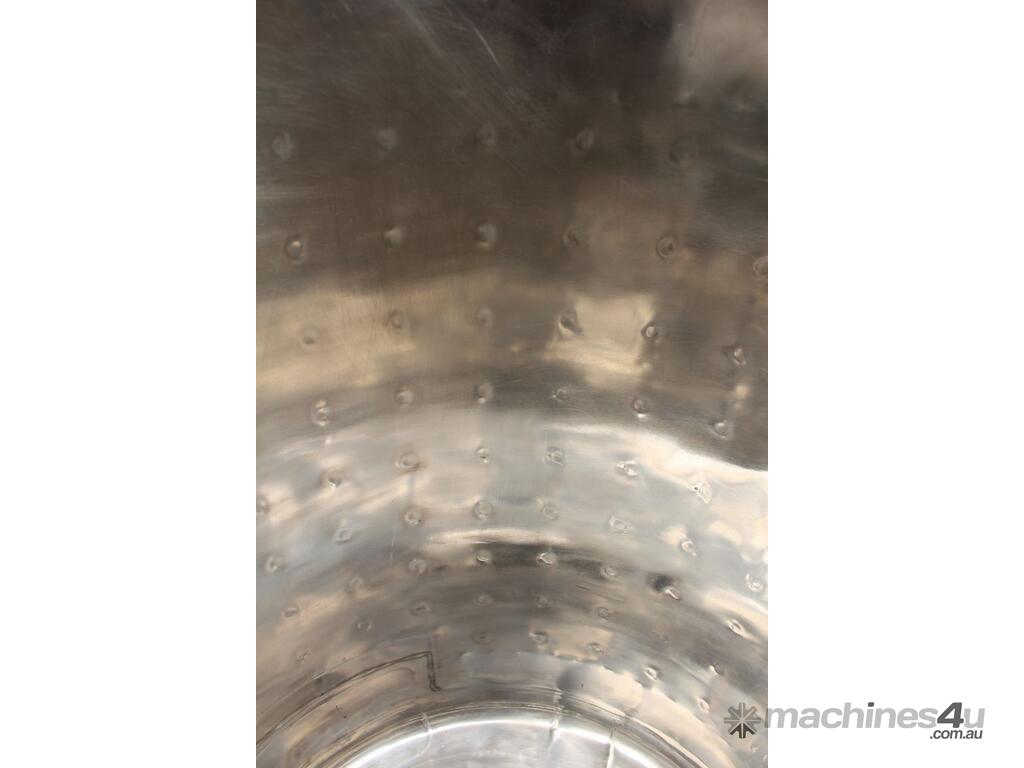 Stainless Steel Dimple Jacketed/Insulated Tank, "Pat Tech", S/N SME, 180L capacity, 550mm dia x 780mm deep, grade 316, jacketing on sides and cone with insulation with fully welded sheathing, open top with hinged lid, conical bottom with 60mm centre bottom outlet, stainless steel tube legs, max jacket pressure 1.0MPa, max temp 160 degC, built 2004