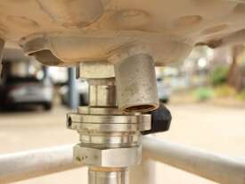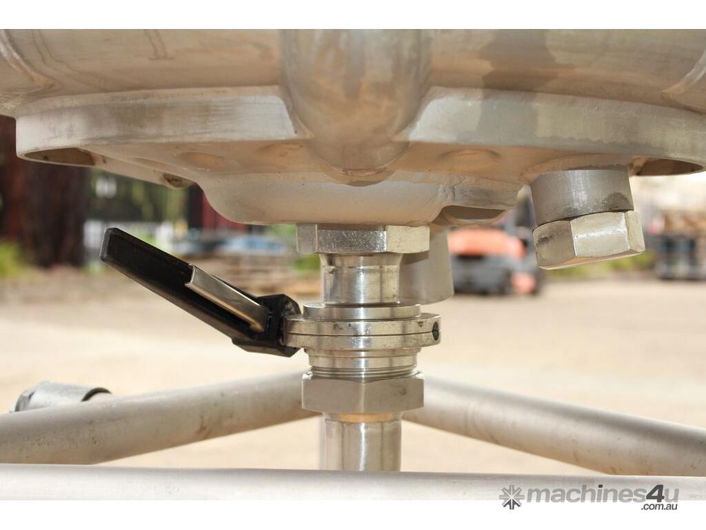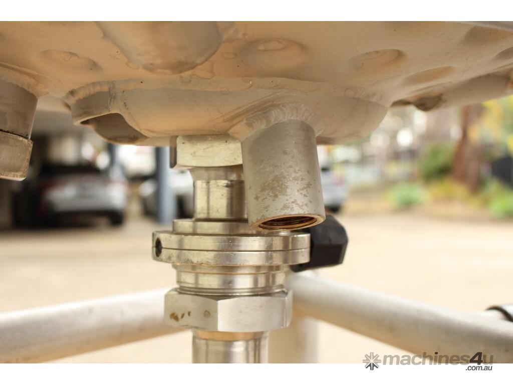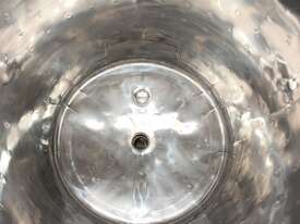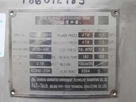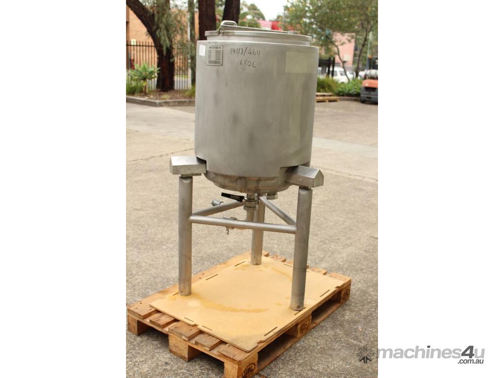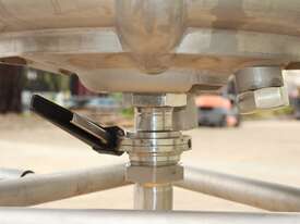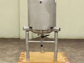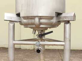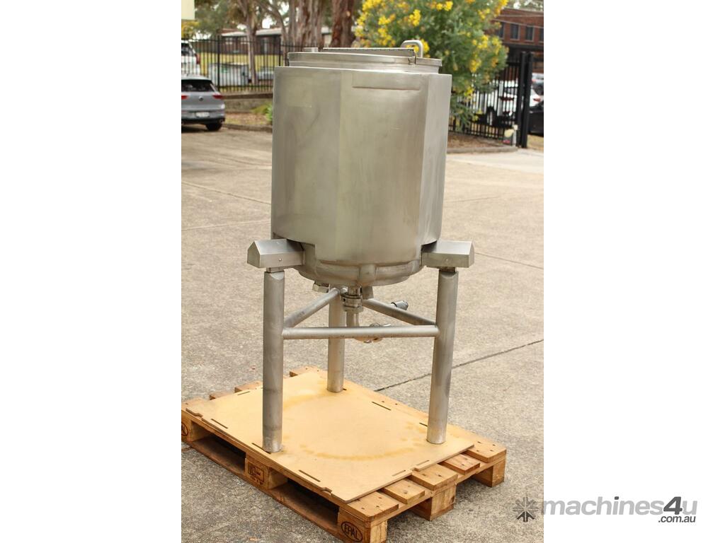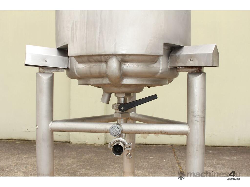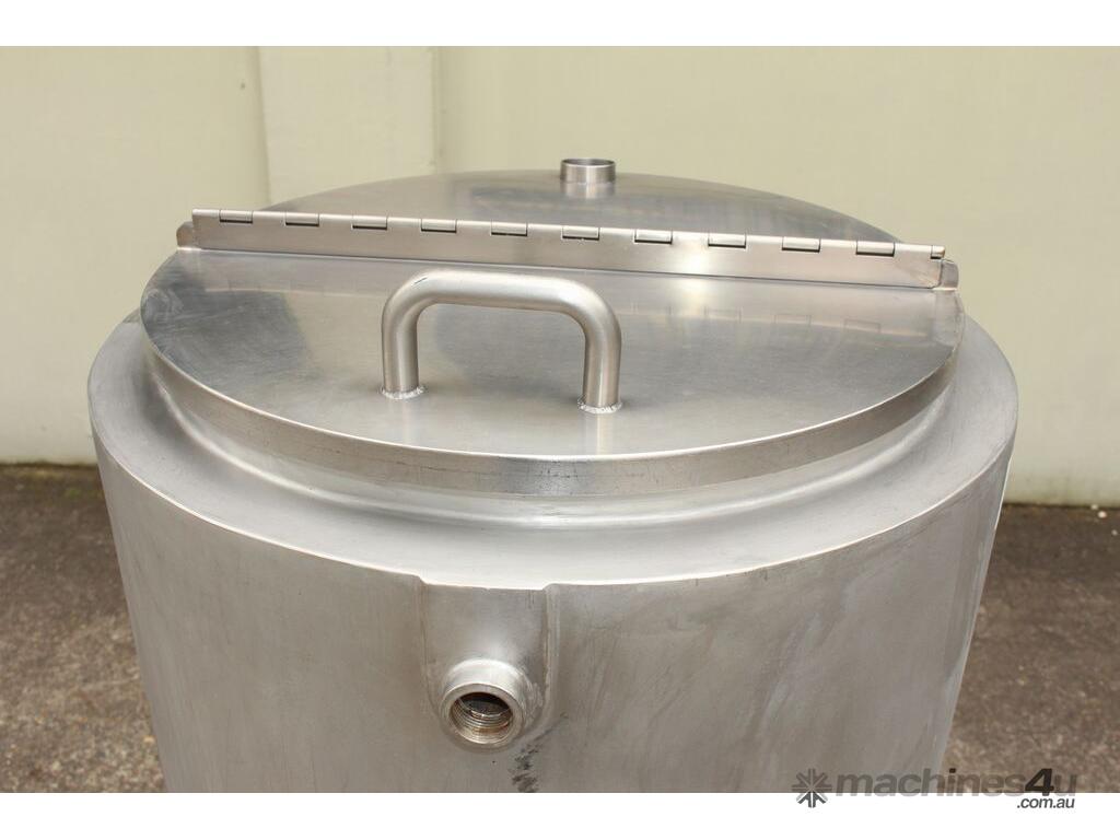 Stainless Steel Dimple Jacketed/Insulated Tank, "Pat Tech", S/N SME, 180L capacity, 550mm dia x 780mm deep, grade 316, jacketing on sides and cone with insulation with fully welded sheathing, open top with hinged lid, conical bottom with 60mm centre bottom outlet, stainless steel tube legs, max jacket pressure 1.0MPa, max temp 160 degC, built 2004
