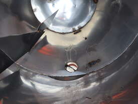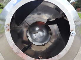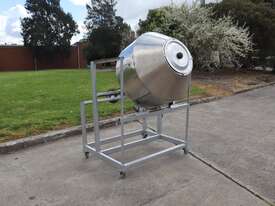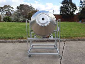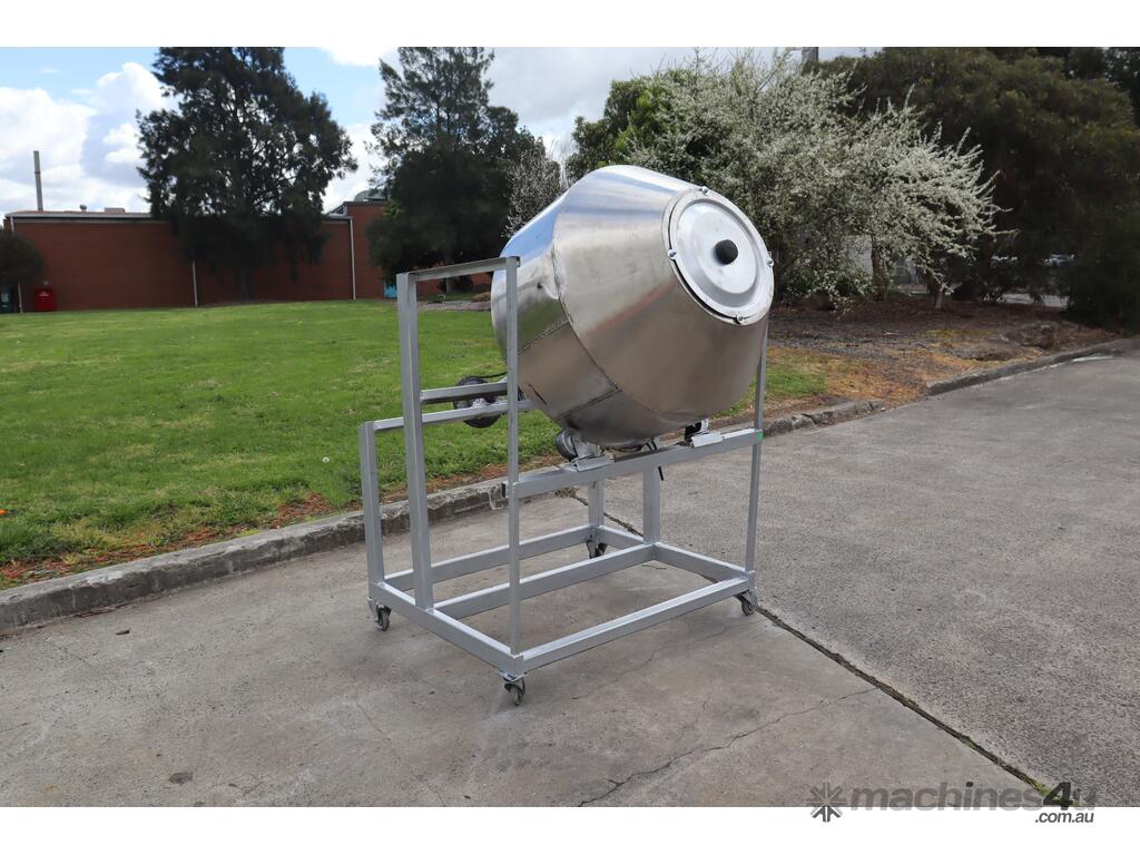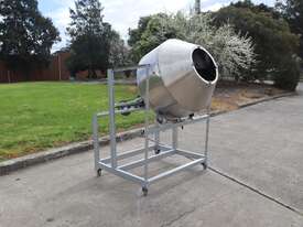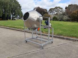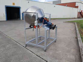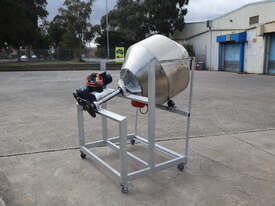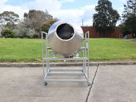 Stainless steel drum mixer/tumbler mounted on a wheeled support frame. Fitted with internal blades and powered by an electric motor drive. This machine provides consistent tumbling and blending of bulk materials. The stainless steel construction ensures hygiene, durability, and easy cleaning.