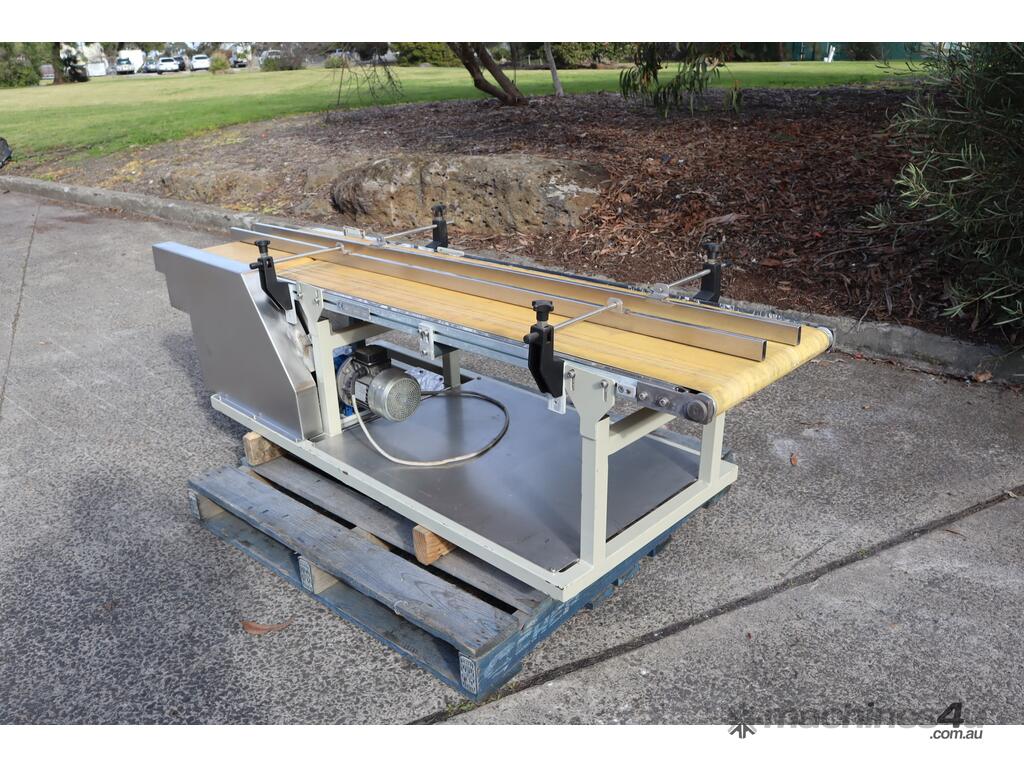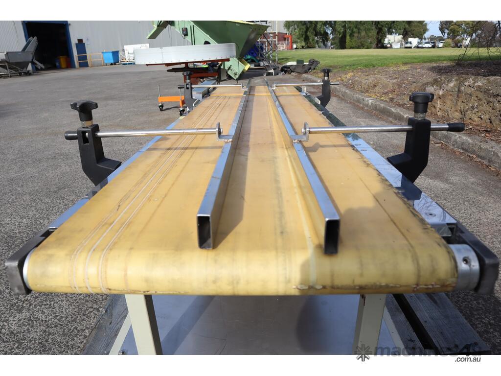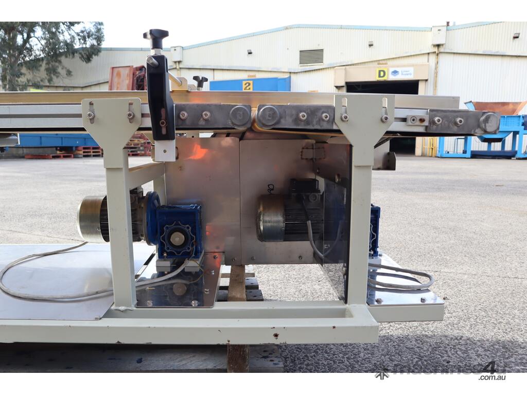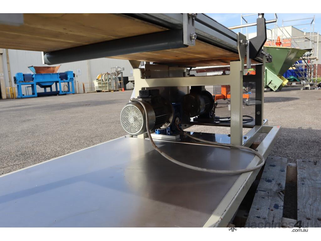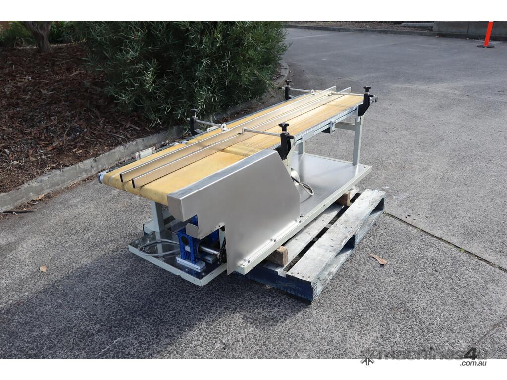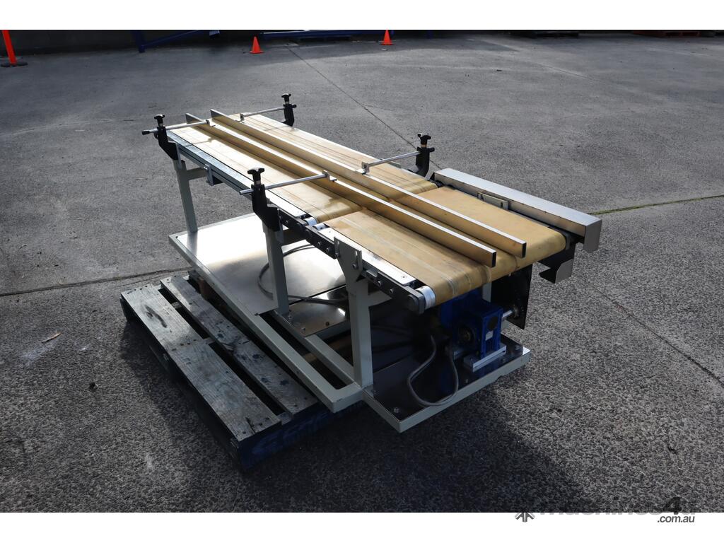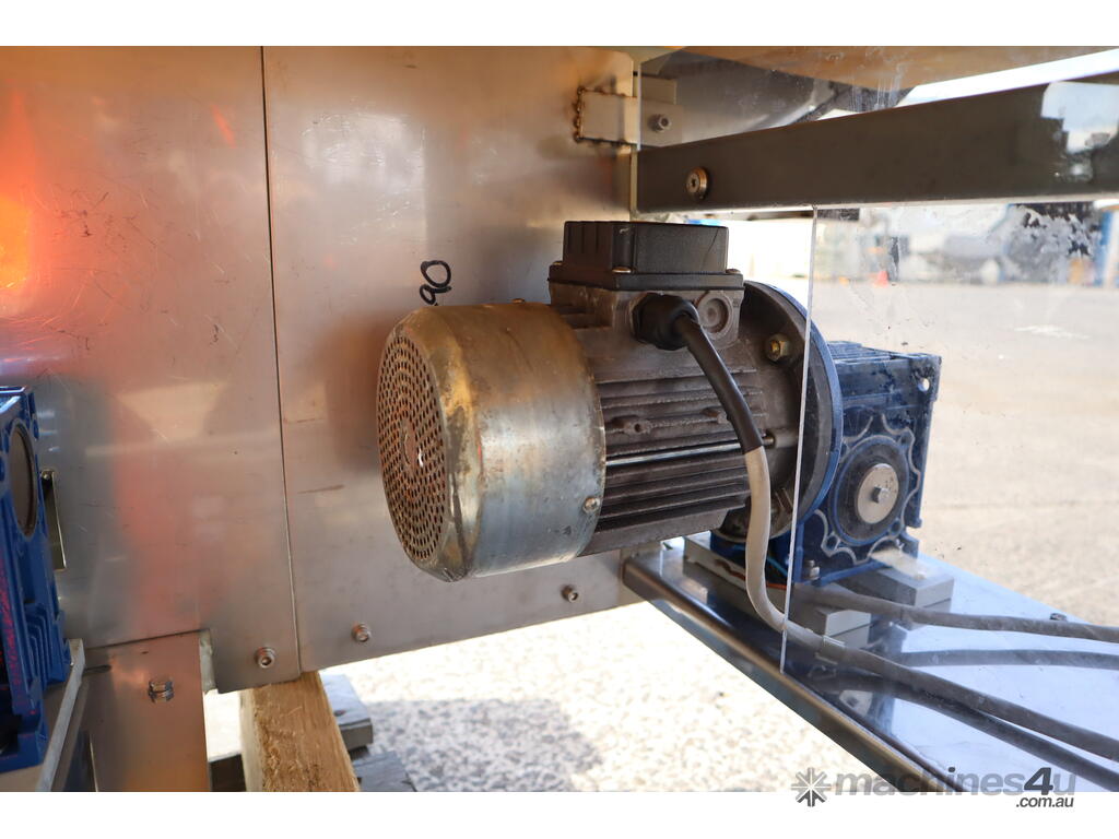 "This custom-made stainless steel dual-belt conveyor system is designed for industrial applications requiring high efficiency and hygiene, such as food processing, packaging, or pharmaceuticals. The system is driven by two Motovario motors and gearboxes, providing robust and reliable power for handling a variety of materials on two separate conveyor belts. The adjustable guide rails and durable construction make this conveyor ideal for businesses looking to streamline their production processes."