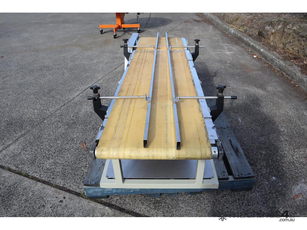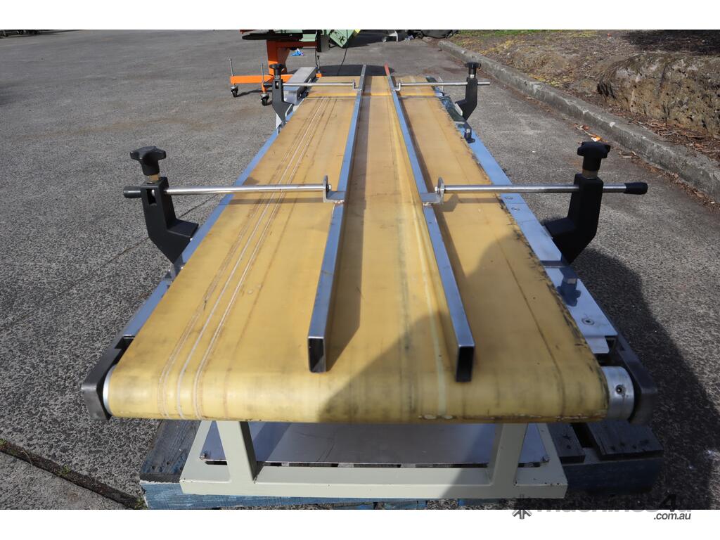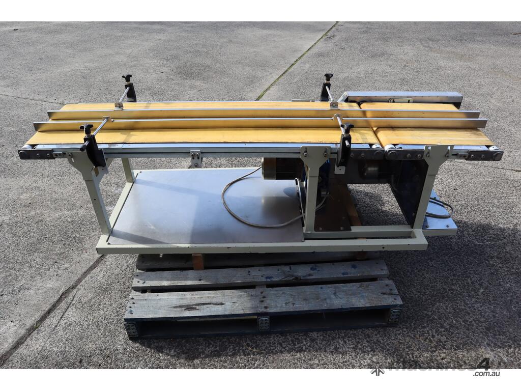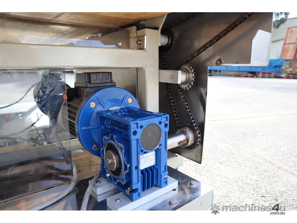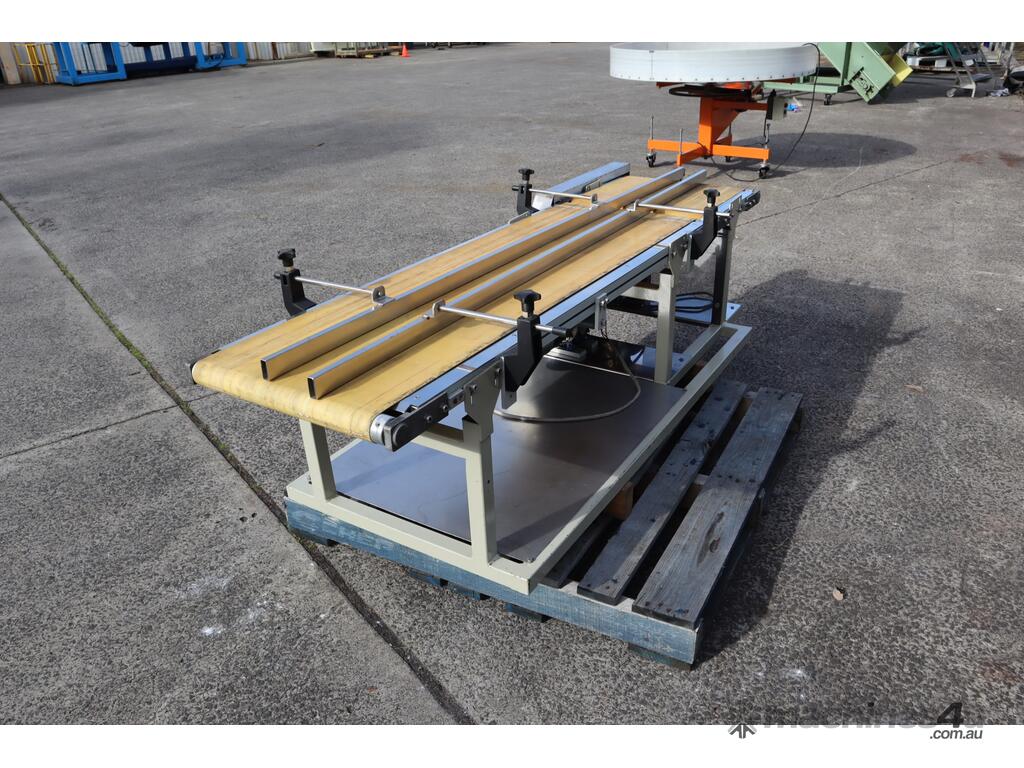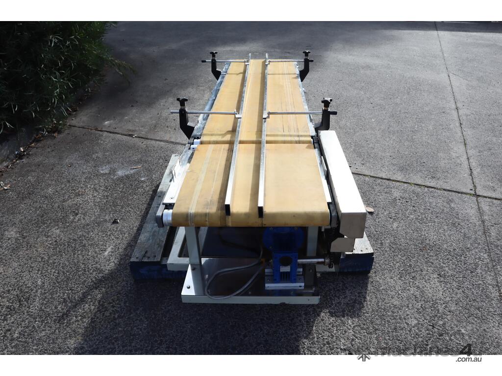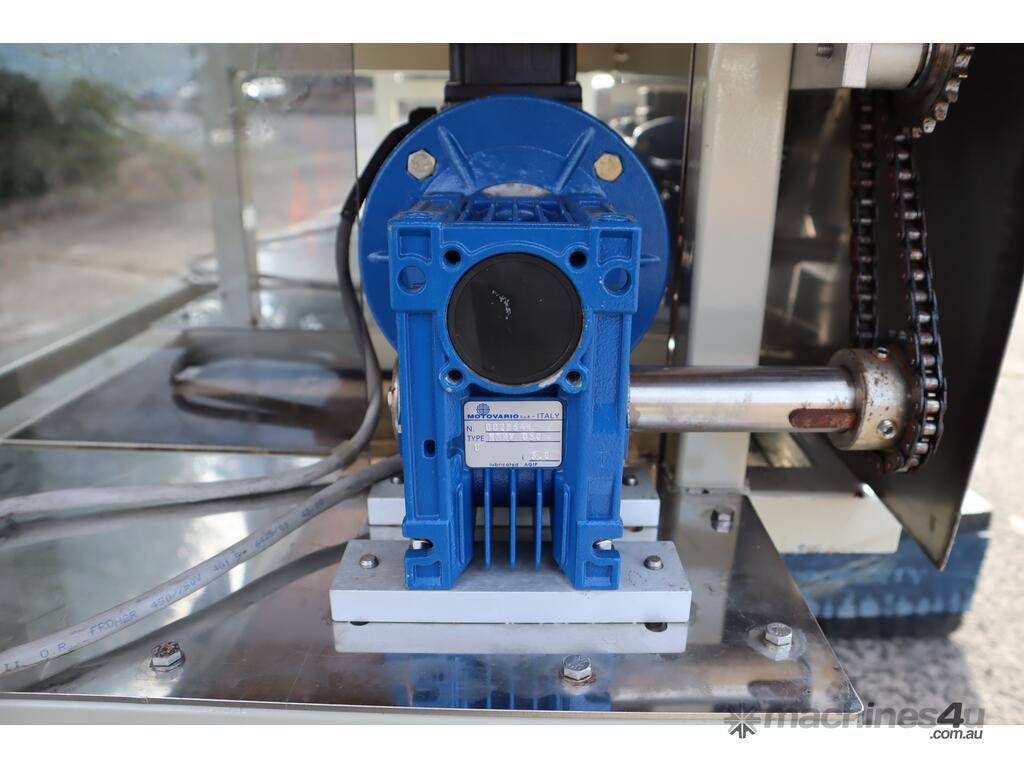 "This custom-made stainless steel dual-belt conveyor system is designed for industrial applications requiring high efficiency and hygiene, such as food processing, packaging, or pharmaceuticals. The system is driven by two Motovario motors and gearboxes, providing robust and reliable power for handling a variety of materials on two separate conveyor belts. The adjustable guide rails and durable construction make this conveyor ideal for businesses looking to streamline their production processes."