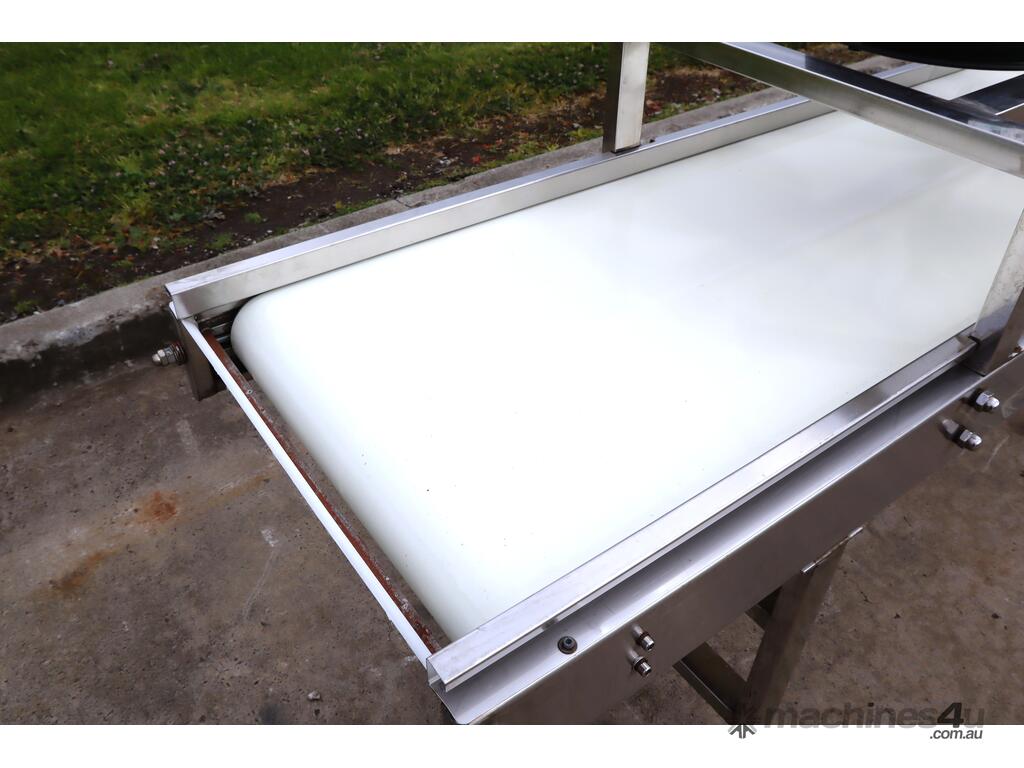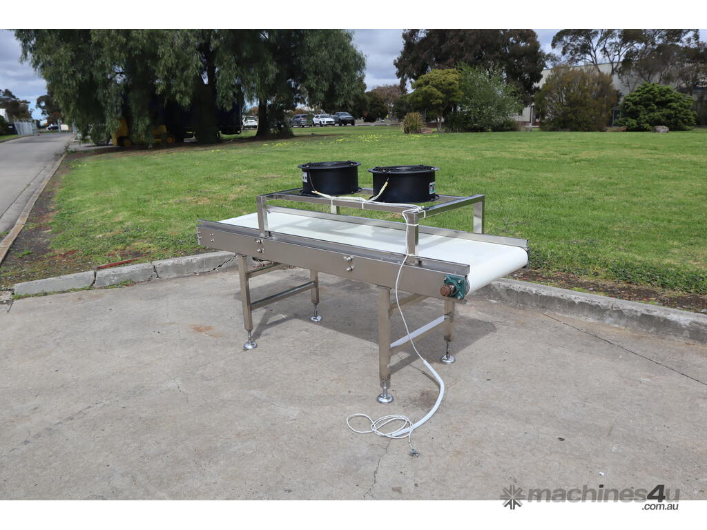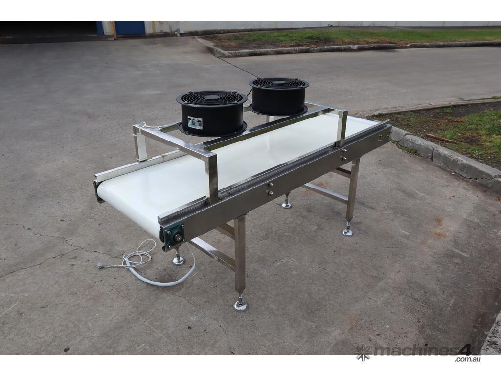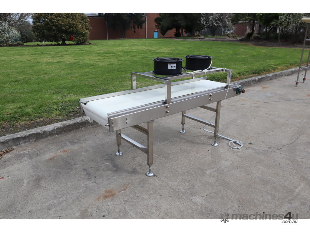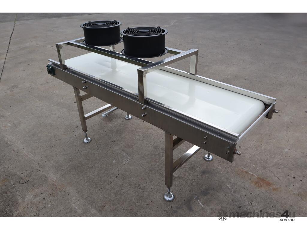 Stainless steel belt conveyor fitted with two overhead mounted fans to blow ambient air across product as it travels. Designed for inline cooling between process steps. The stainless frame and legs with adjustable leveling feet and white flat belt make it a practical, easy to clean addition to food, packaging, or general manufacturing lines etc. Side rails help keep products on track.