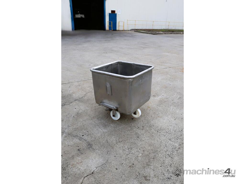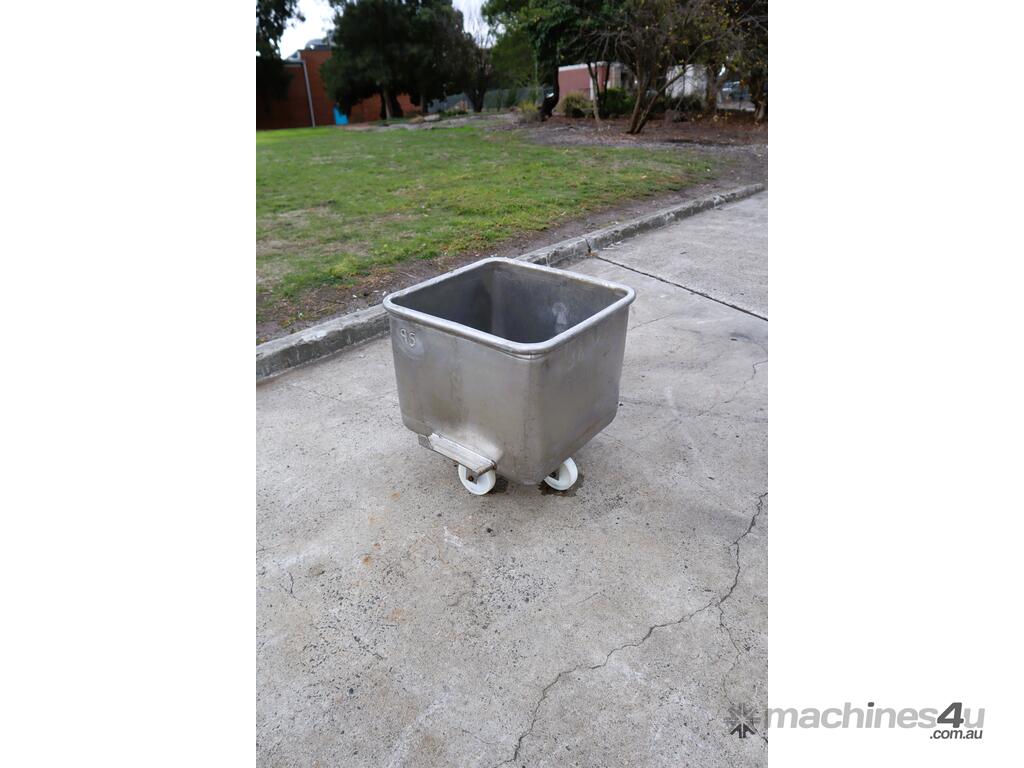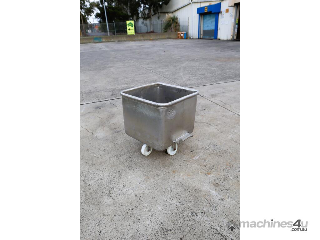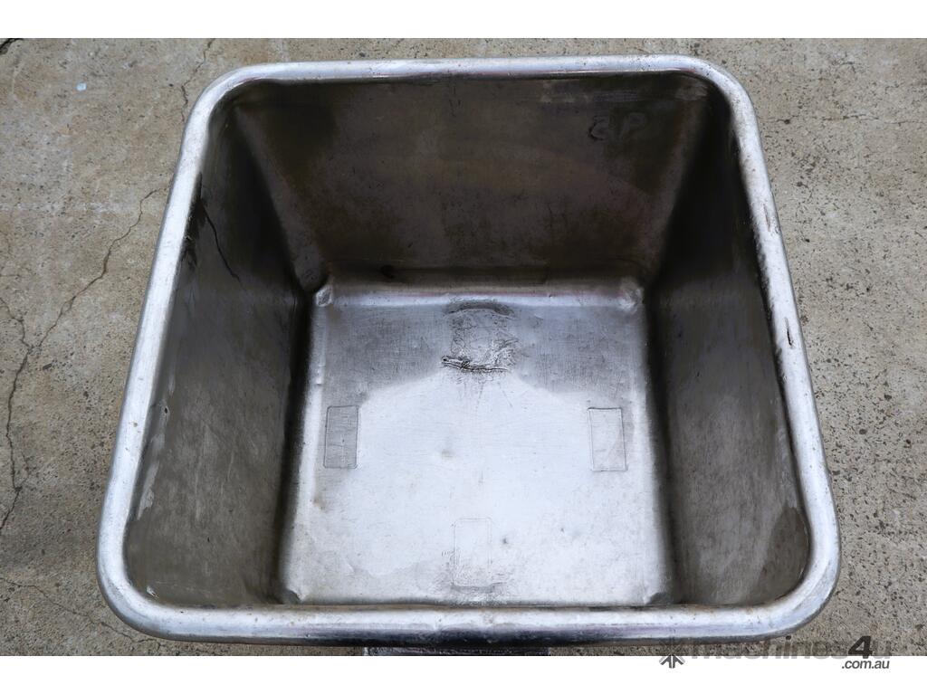This stainless steel bin tub trolley is in good condition. It's equipped with side tracks for bin lifters to easily handle and castors for mobility. It's compact form and small footprint makes it versatile for a range of usage applications.