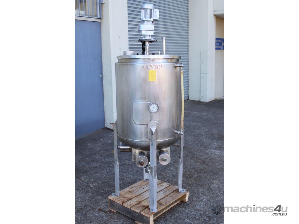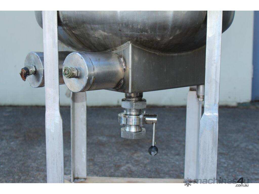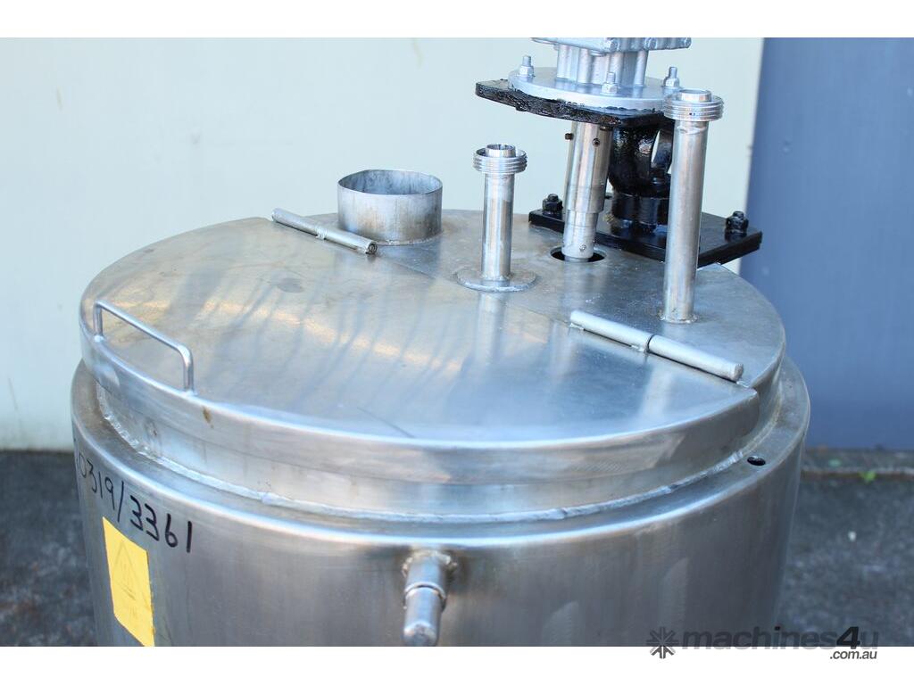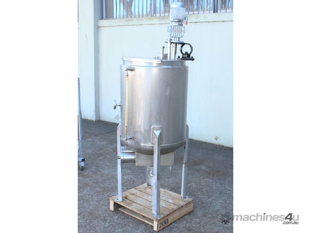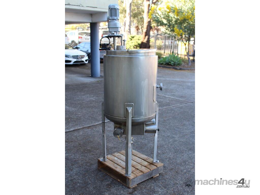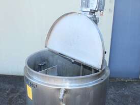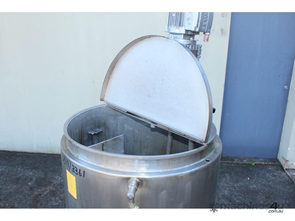 Stainless Steel Electrically Heated Jacketed Mixing Tank, capacity 150L, internal dimensions 550mm dia x 700mm deep, open top with 1/3 fixed and 2/3 hinged lid, dished bottom with 50mm dia bottom outlet with s/s valve, offset top entry mixer with 3 phase 0.25kw 386rpm geared motor and 3 blade prop, fitted with three heating element at bottom, one baffle, and tube level gauge