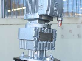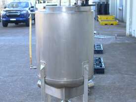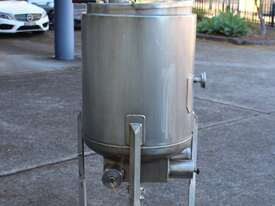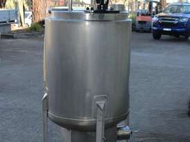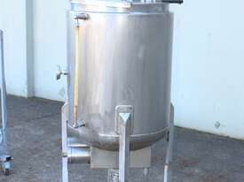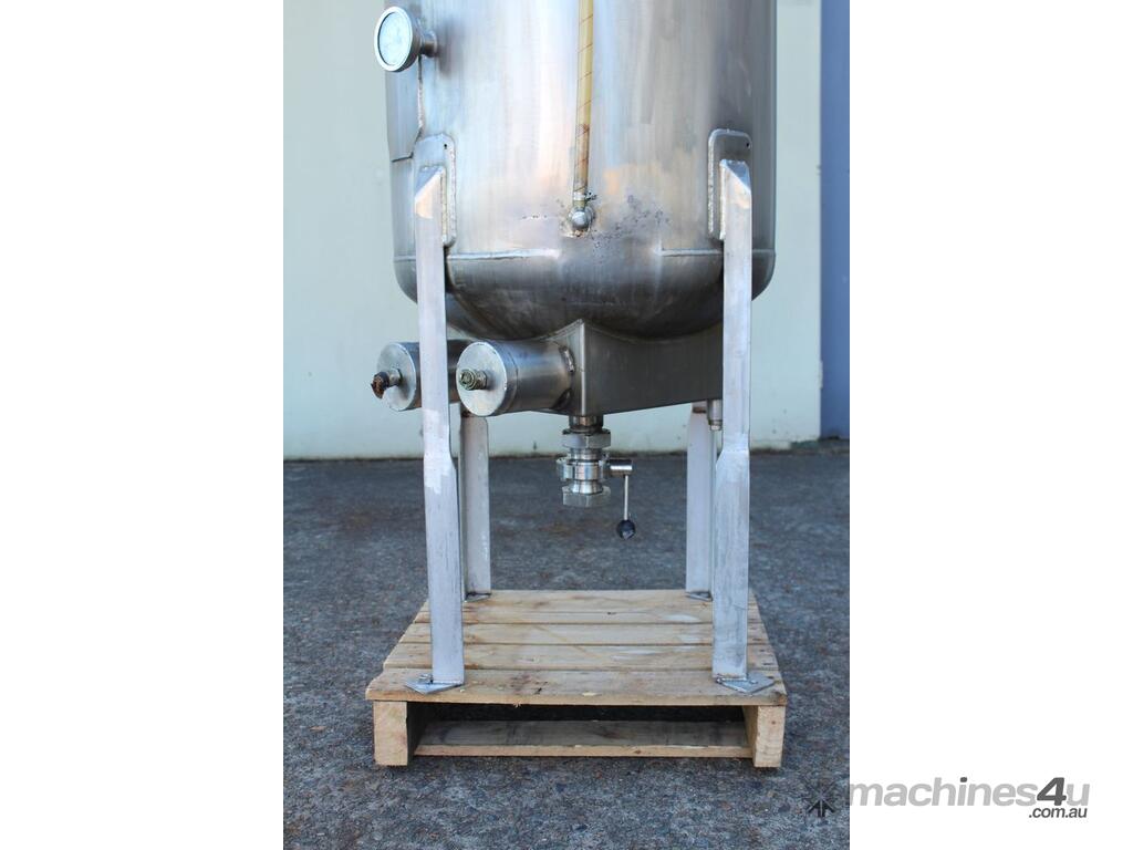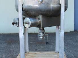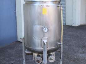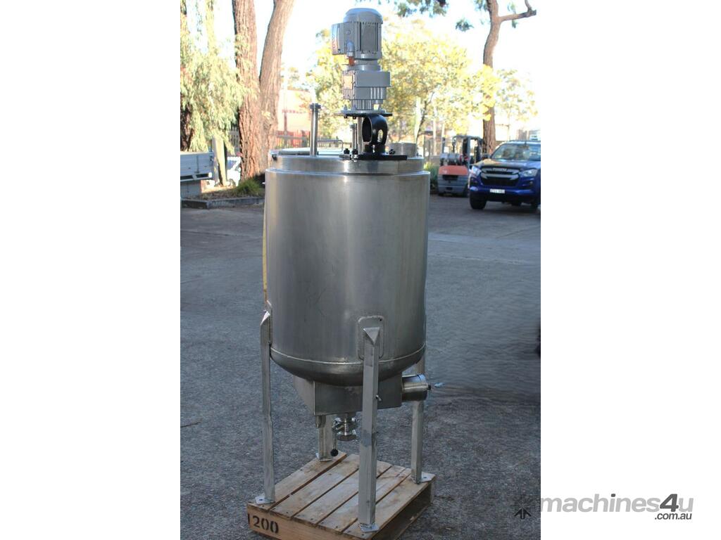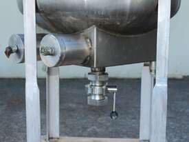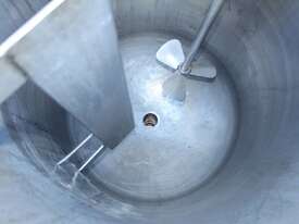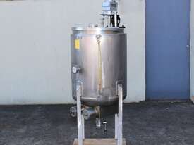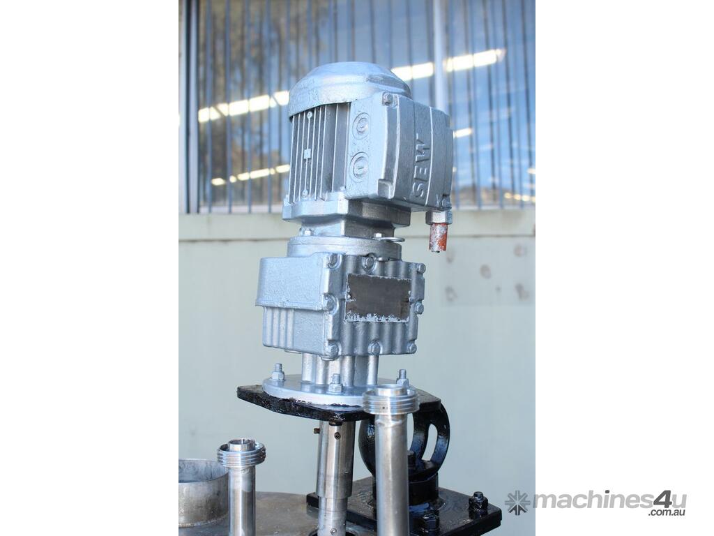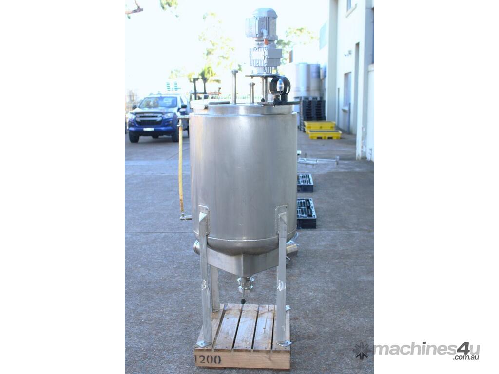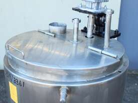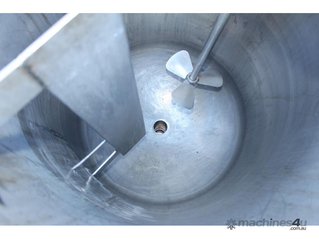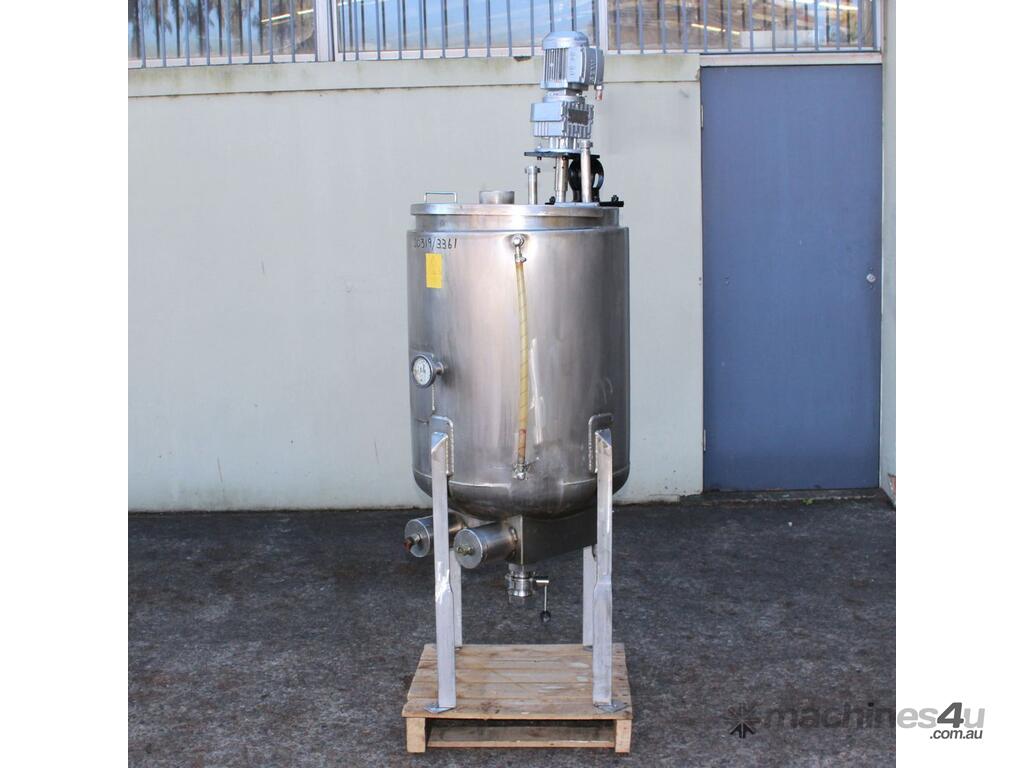 Stainless Steel Electrically Heated Jacketed Mixing Tank, capacity 150L, internal dimensions 550mm dia x 700mm deep, open top with 1/3 fixed and 2/3 hinged lid, dished bottom with 50mm dia bottom outlet with s/s valve, offset top entry mixer with 3 phase 0.25kw 386rpm geared motor and 3 blade prop, fitted with three heating element at bottom, one baffle, and tube level gauge