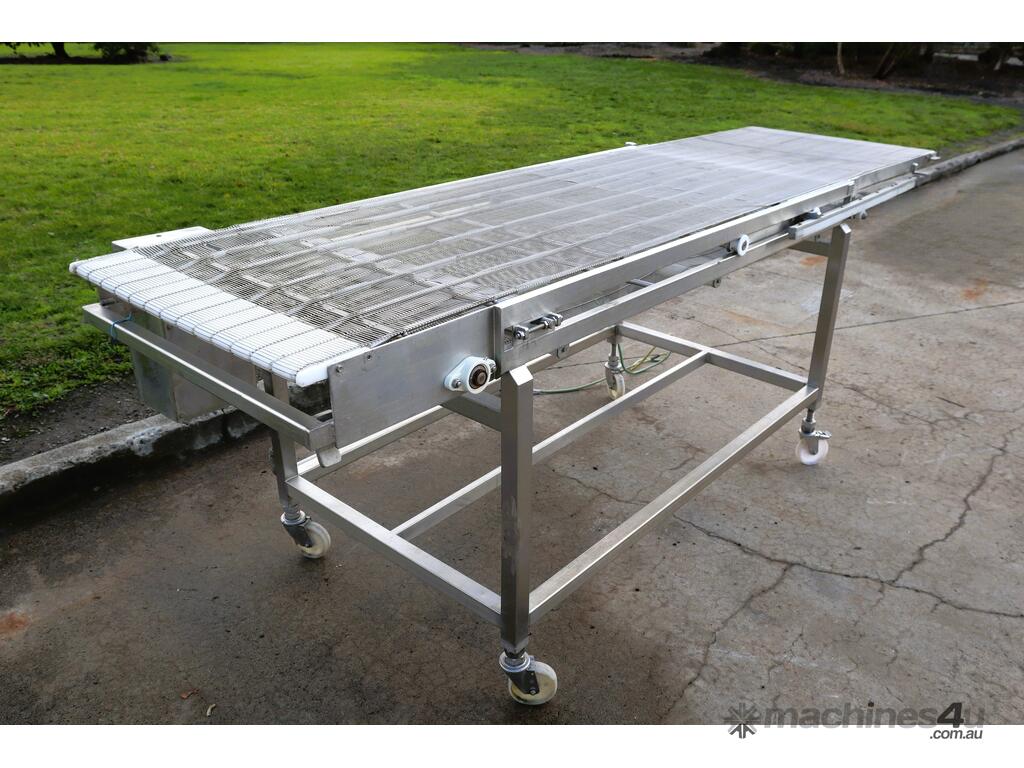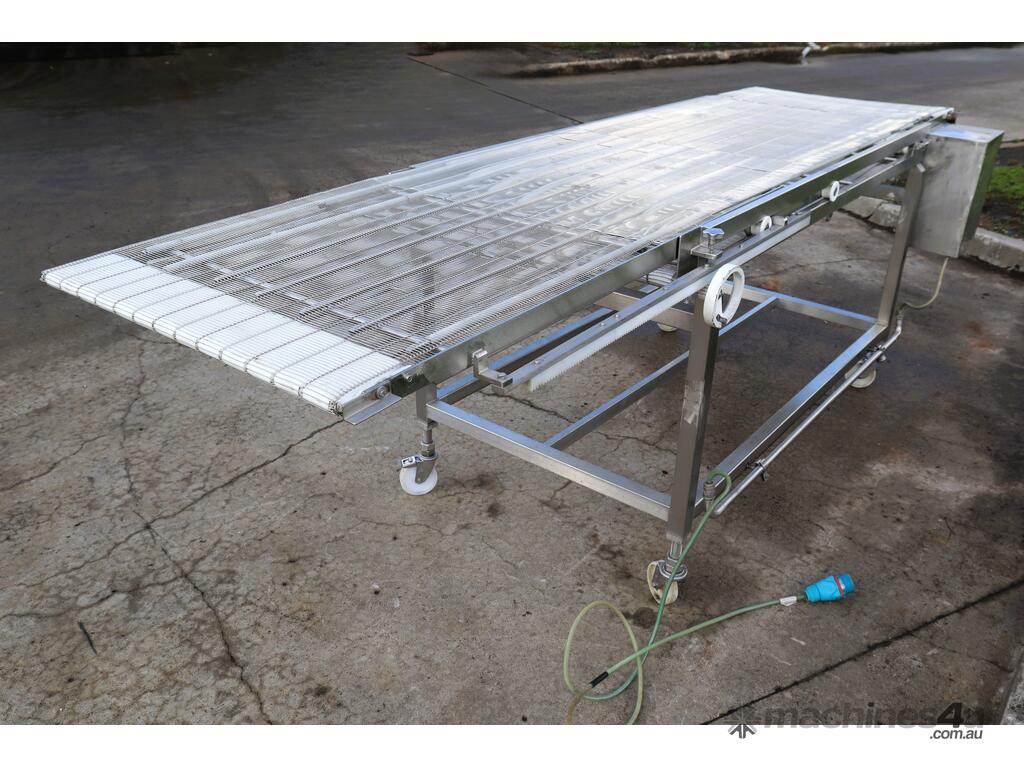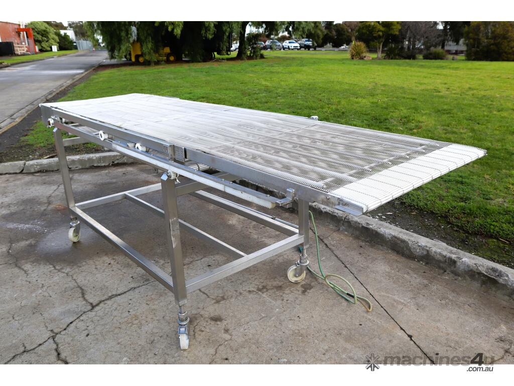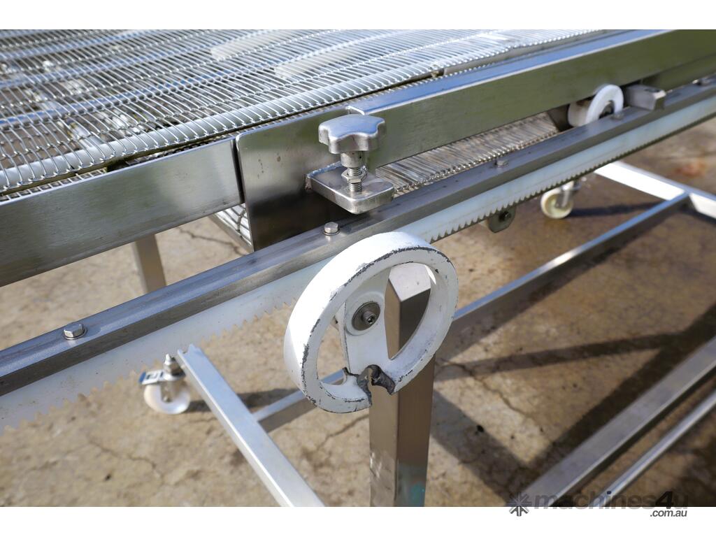 This conveyor is in great working condition. The travel length of the conveyor can be extended manually and the belt is made out of stainless steel chain links.