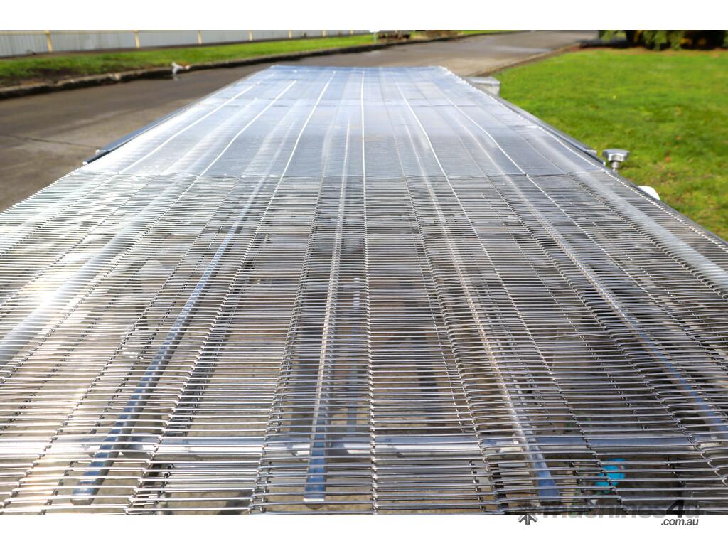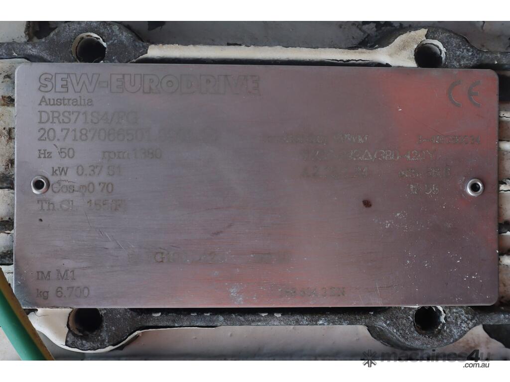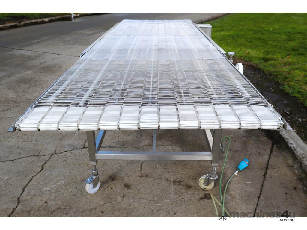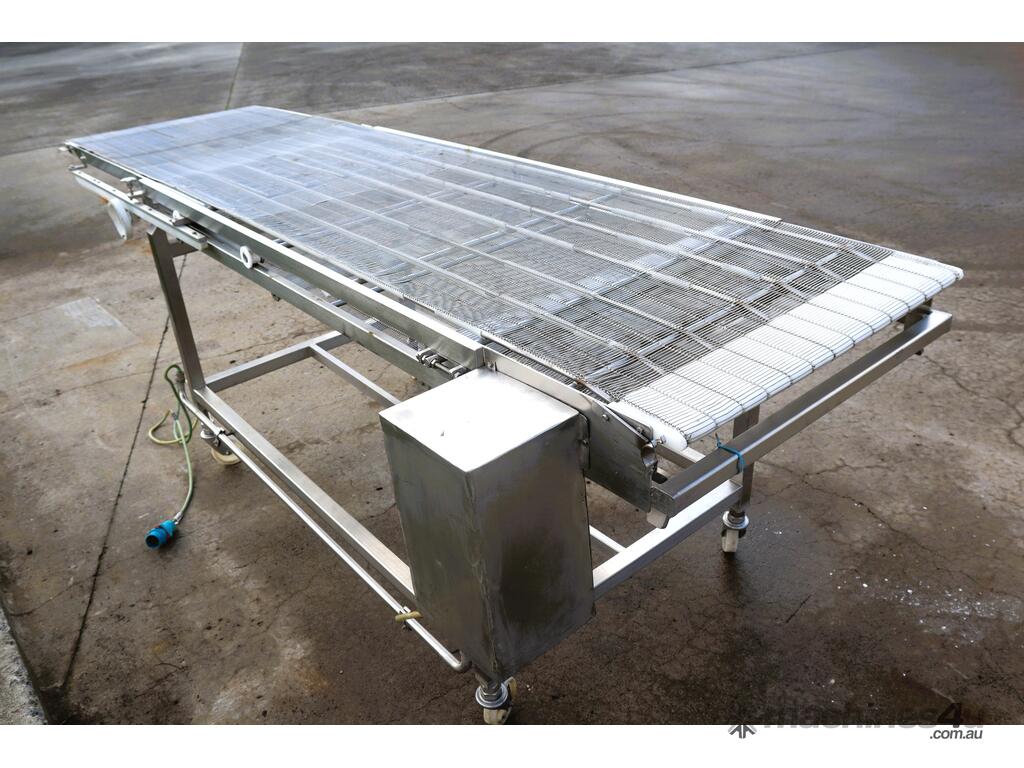 This conveyor is in great working condition. The travel length of the conveyor can be extended manually and the belt is made out of stainless steel chain links.
