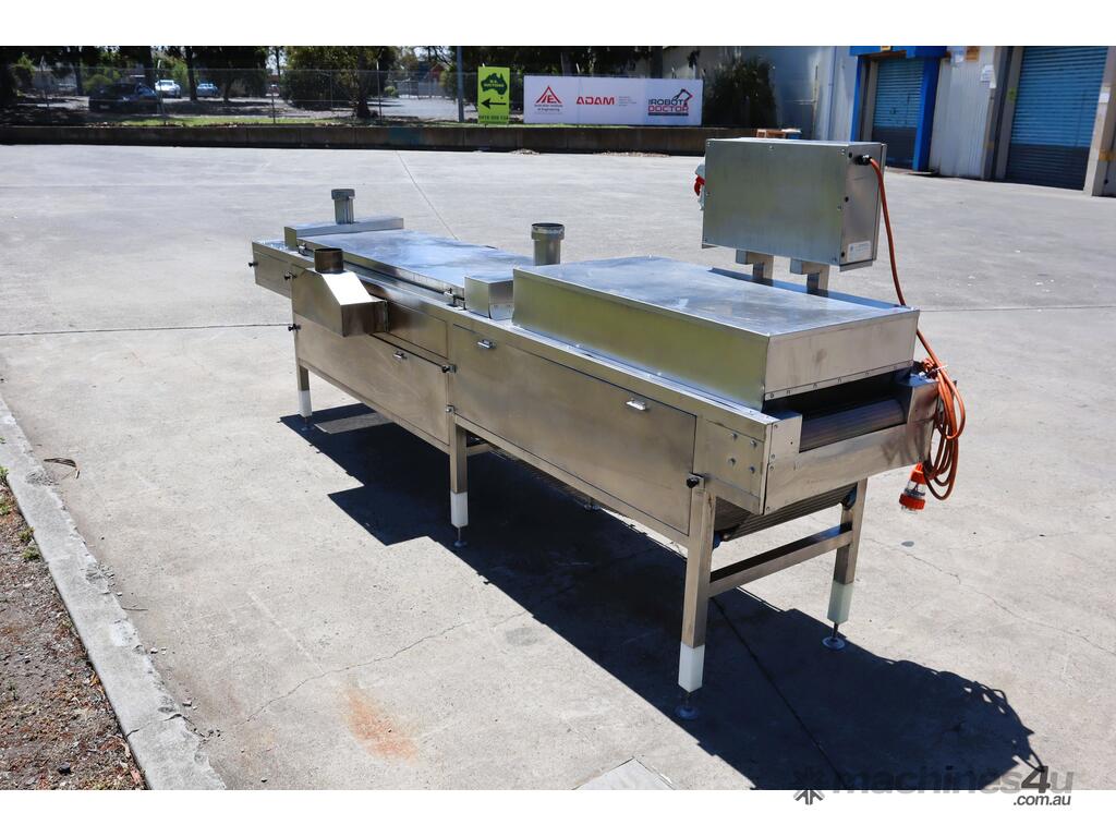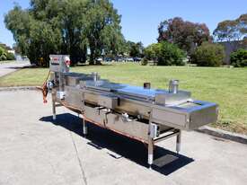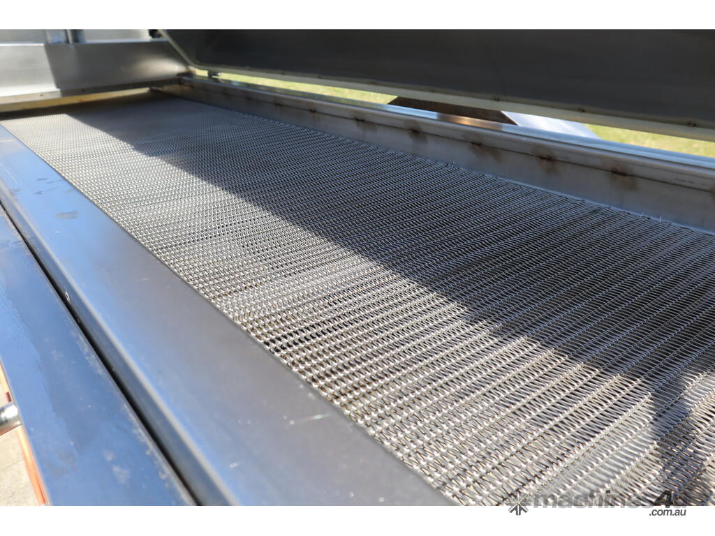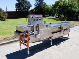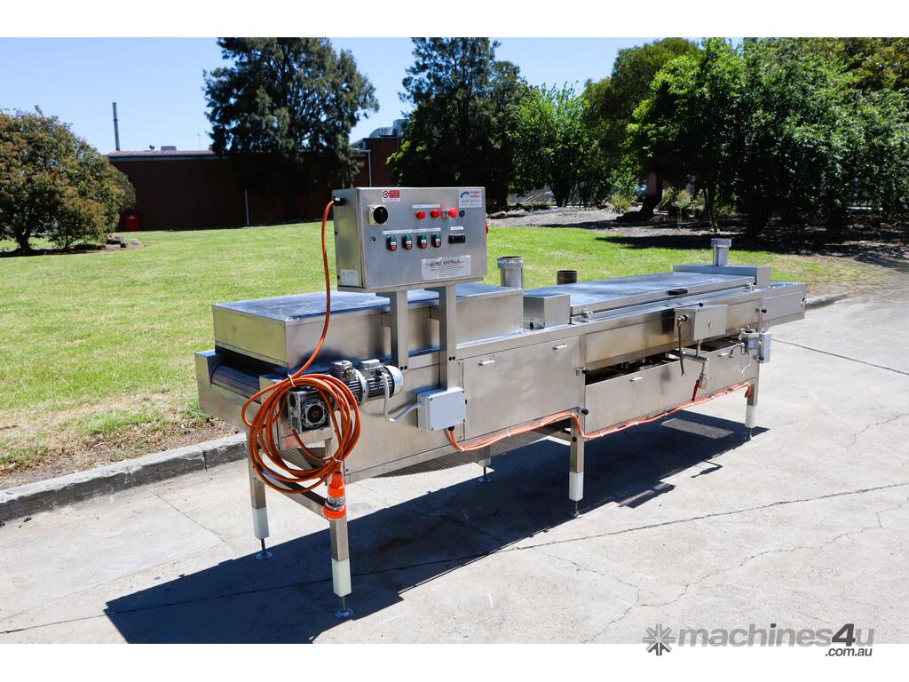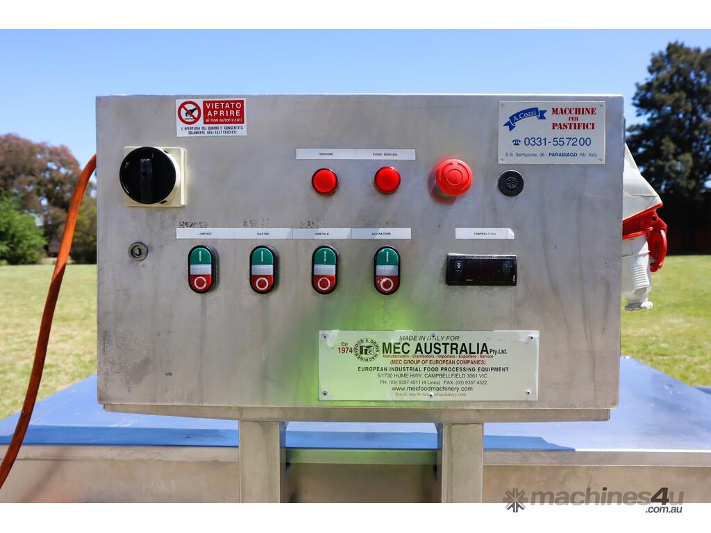 Stainless steel continuous steam pasteuriser for pasta by A. Cozzi (Italy). Provides thermal pasteurisation of fresh pasta products using steam. The machine features a mesh conveyor belt running through an enclosed tunnel, where water in a shallow reservoir is heated by a gas fired system. This was supplied in Australia by MEC Australia, and is built for continuous operation.