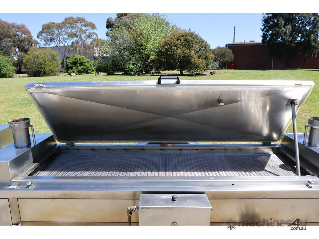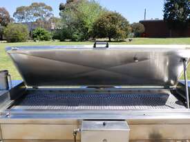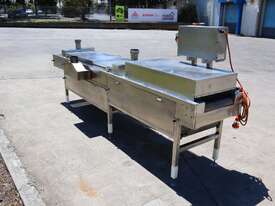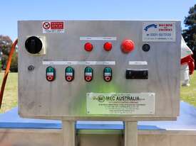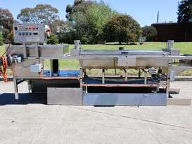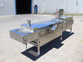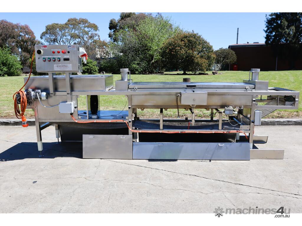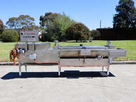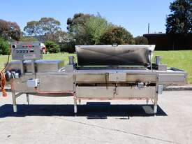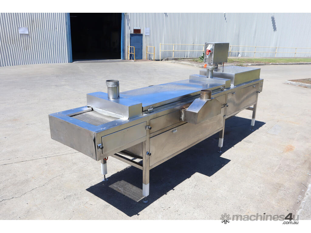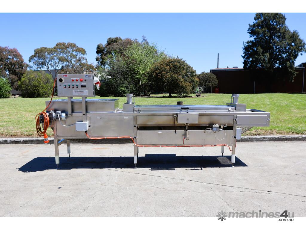 Stainless steel continuous steam pasteuriser for pasta by A. Cozzi (Italy). Provides thermal pasteurisation of fresh pasta products using steam. The machine features a mesh conveyor belt running through an enclosed tunnel, where water in a shallow reservoir is heated by a gas fired system. This was supplied in Australia by MEC Australia, and is built for continuous operation.