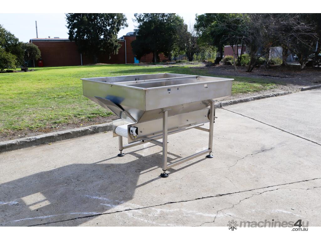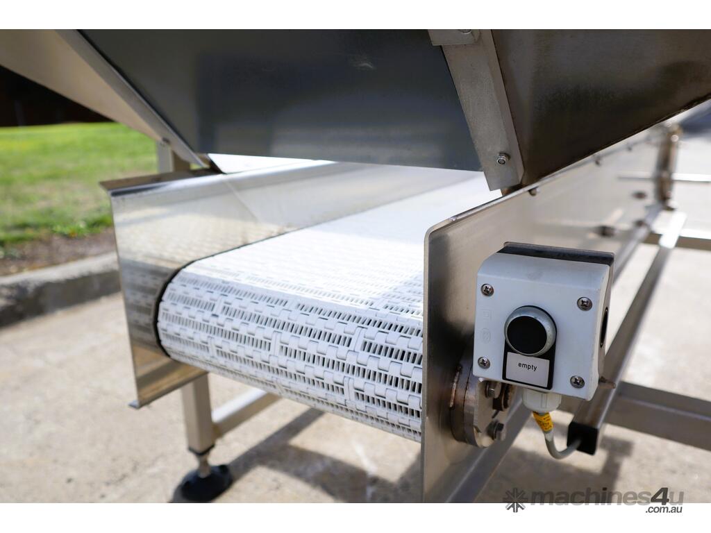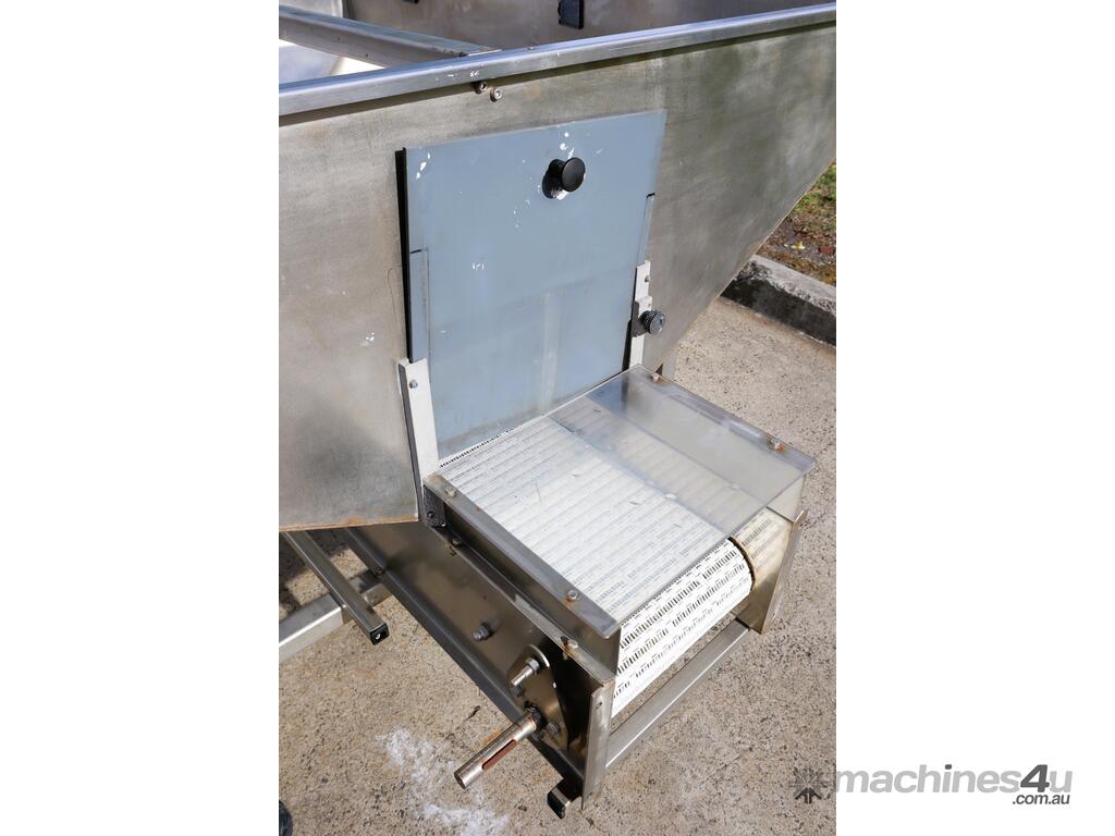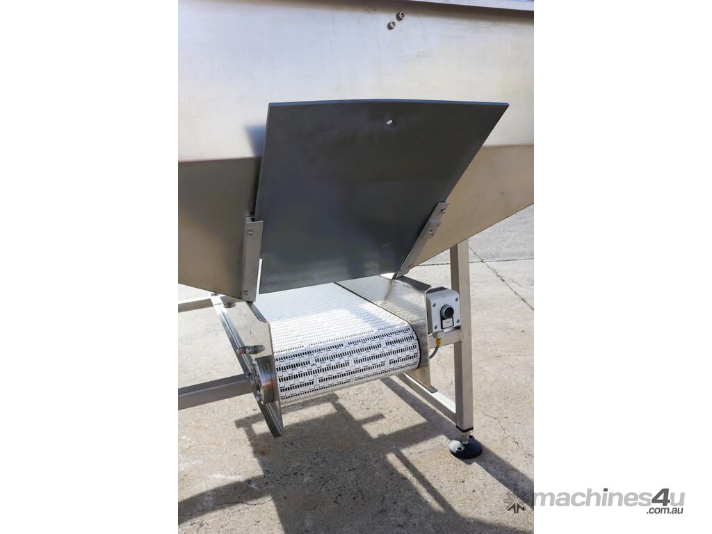This conveyor is in great condition. The unit features a large stainless steel hopper feeder to help funnel products onto the conveyor line. The belt is a plastic modular belt and the line has two sliding doors to control flow and discharge of desired height/s.