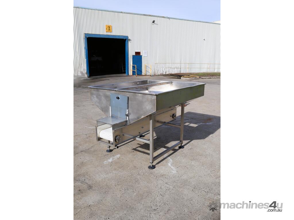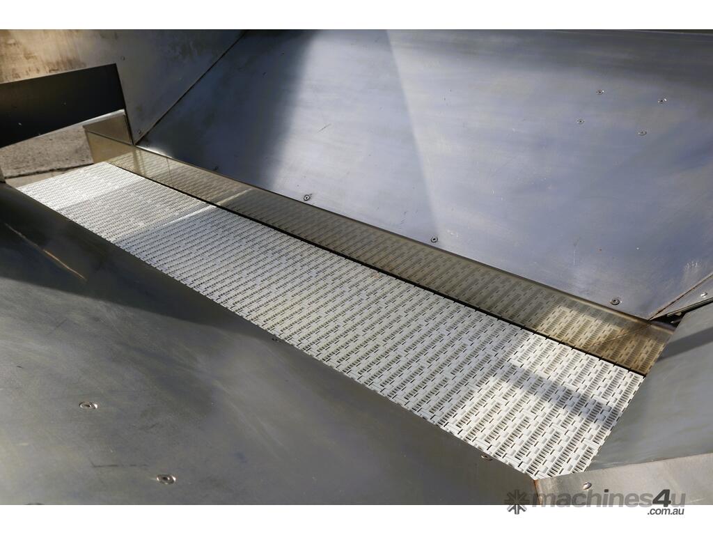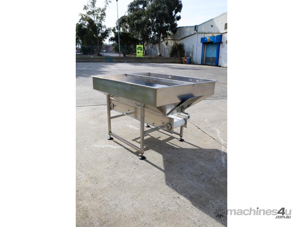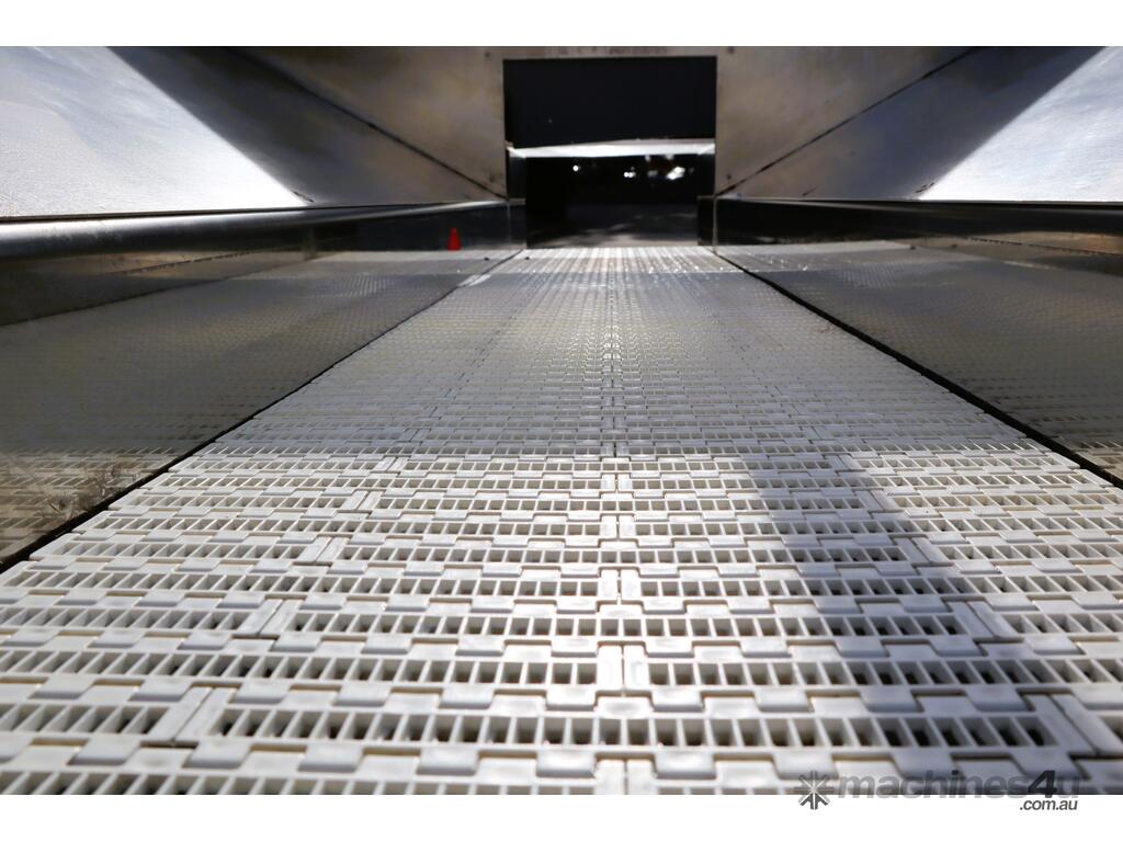 This conveyor is in great condition. The unit features a large stainless steel hopper feeder to help funnel products onto the conveyor line. The belt is a plastic modular belt and the line has two sliding doors to control flow and discharge of desired height/s.