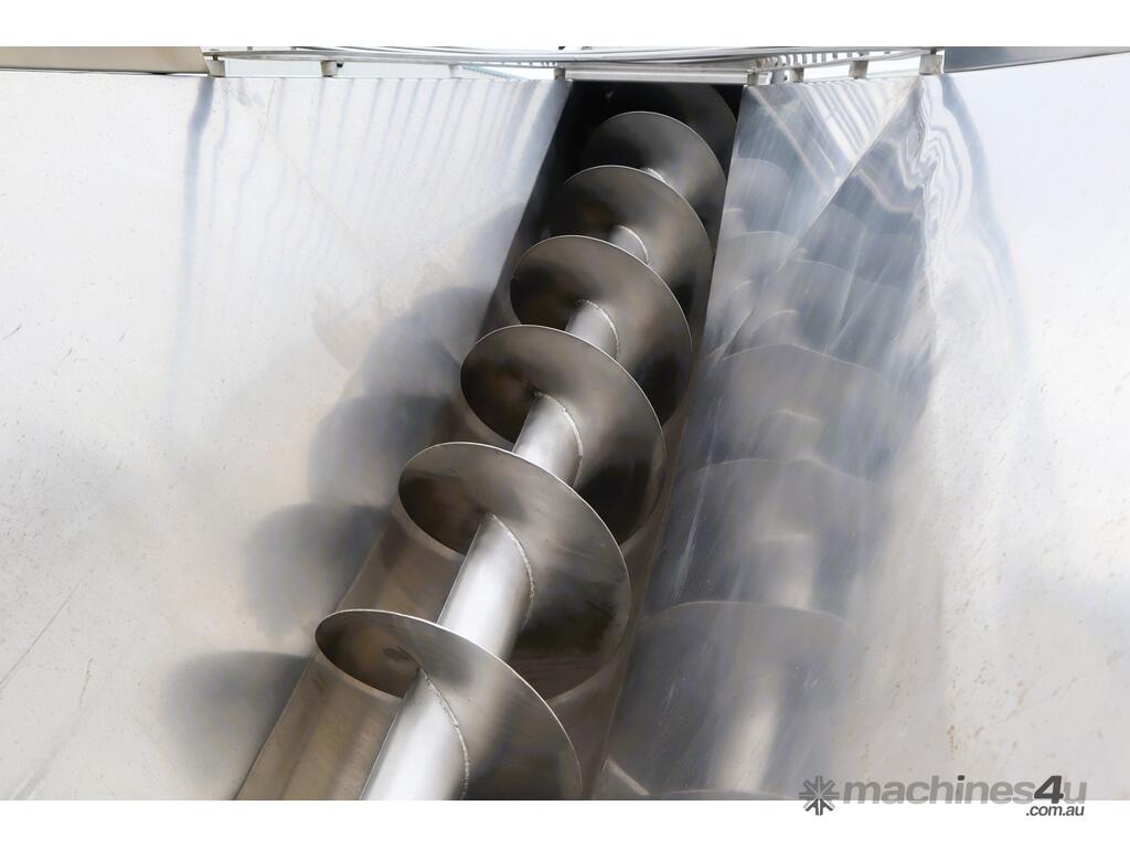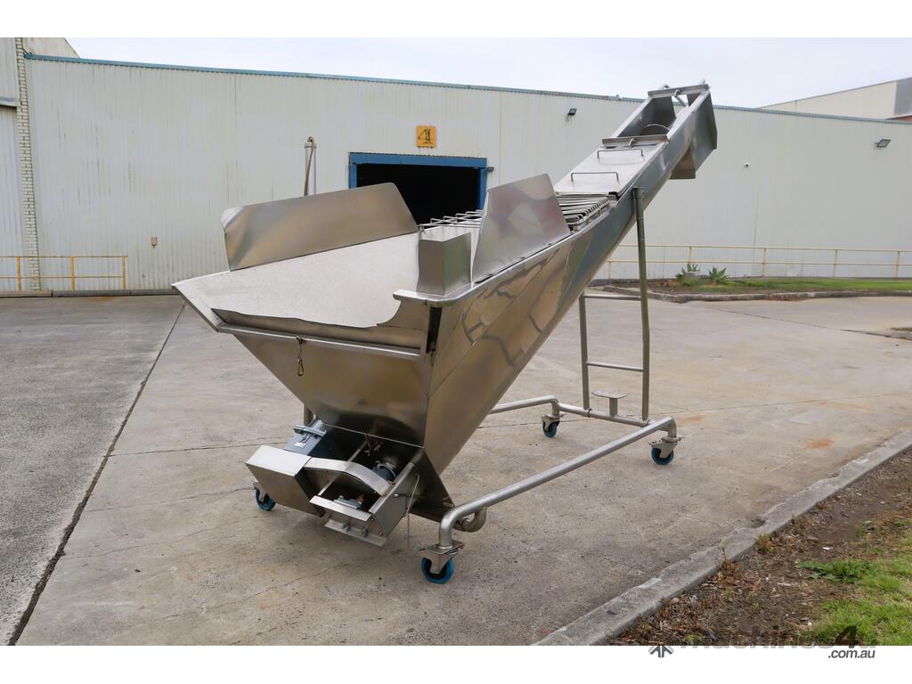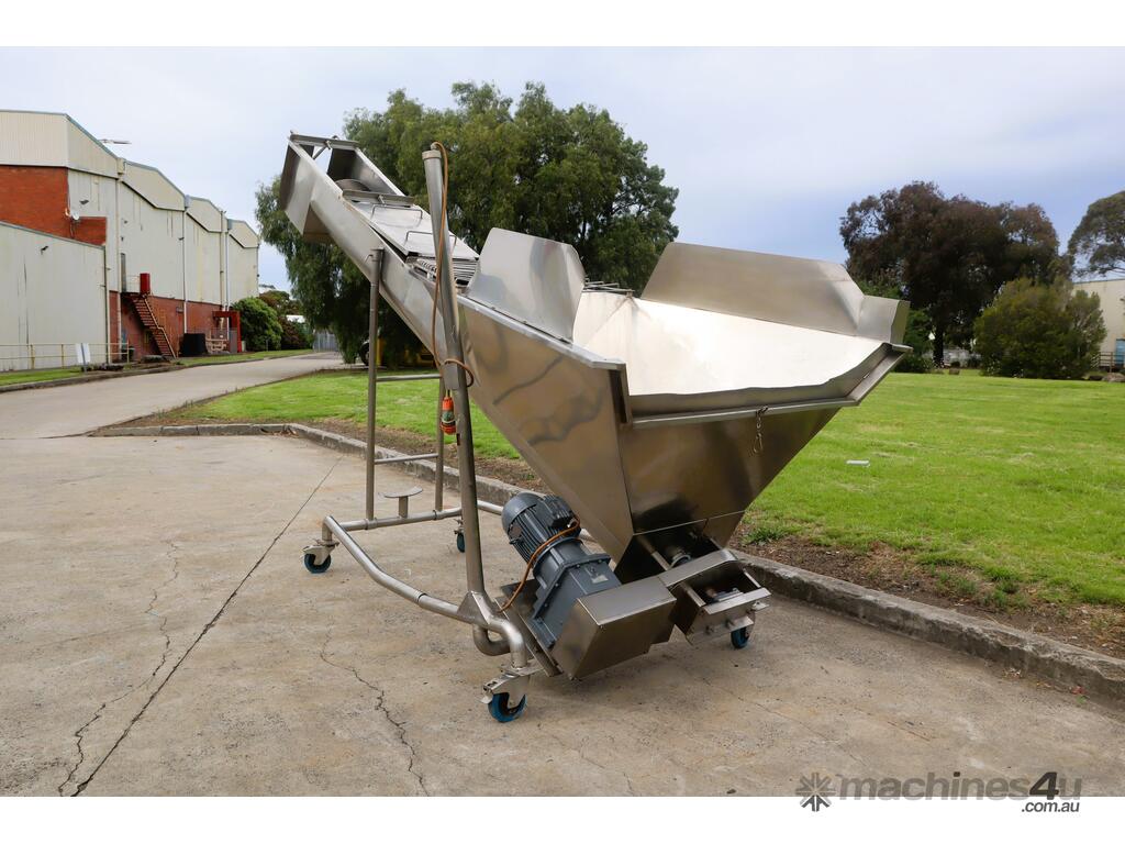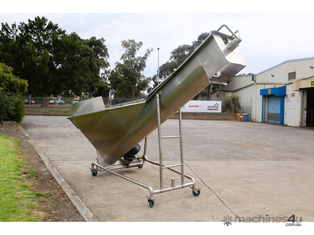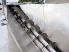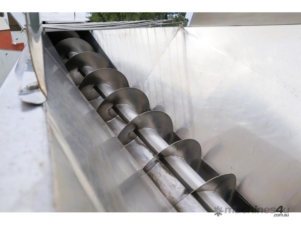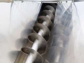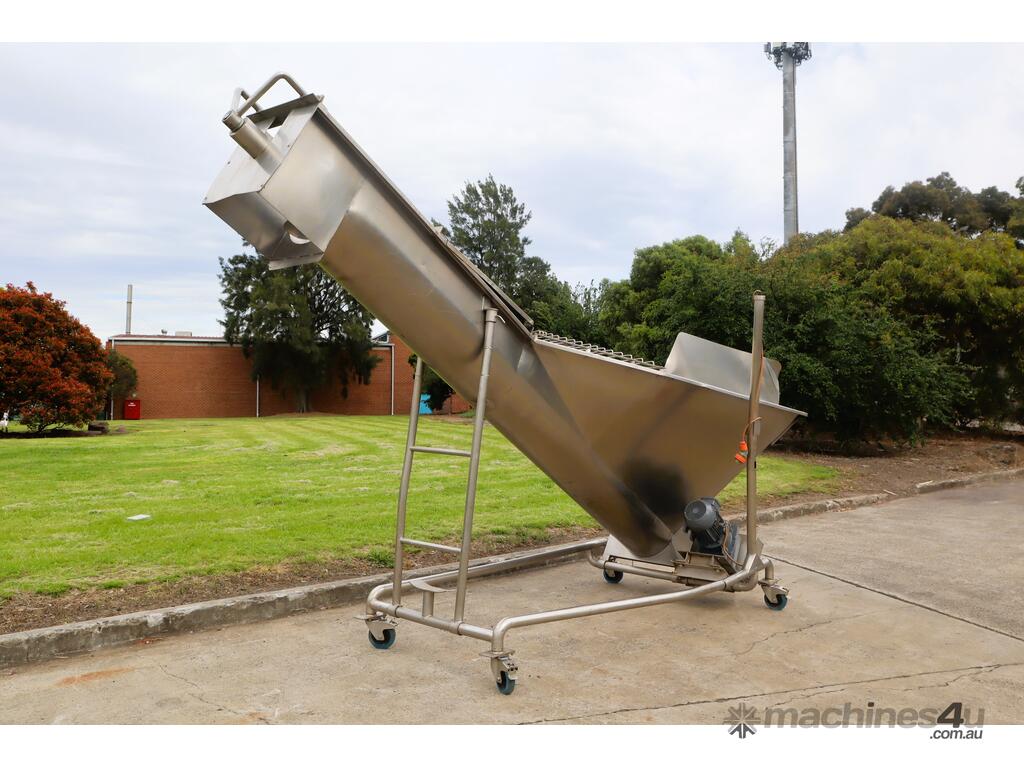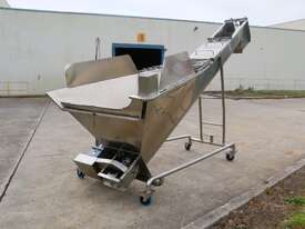 Stainless steel hopper screw auger feeder in excellent condition designed for controlled feeding and transfer of bulk materials from a hopper into downstream processing equipment. This unit features a large stainless steel hopper with an inclined screw auger, providing consistent, metered discharge. Mounted on a mobile stainless steel frame with castors, it is well suited to general processing environments.