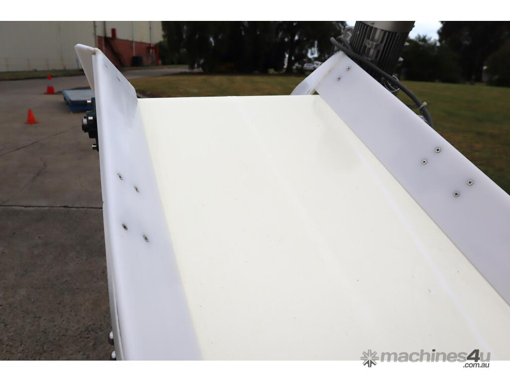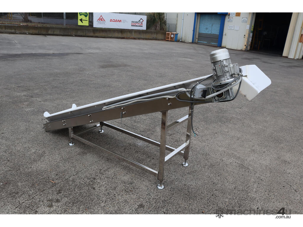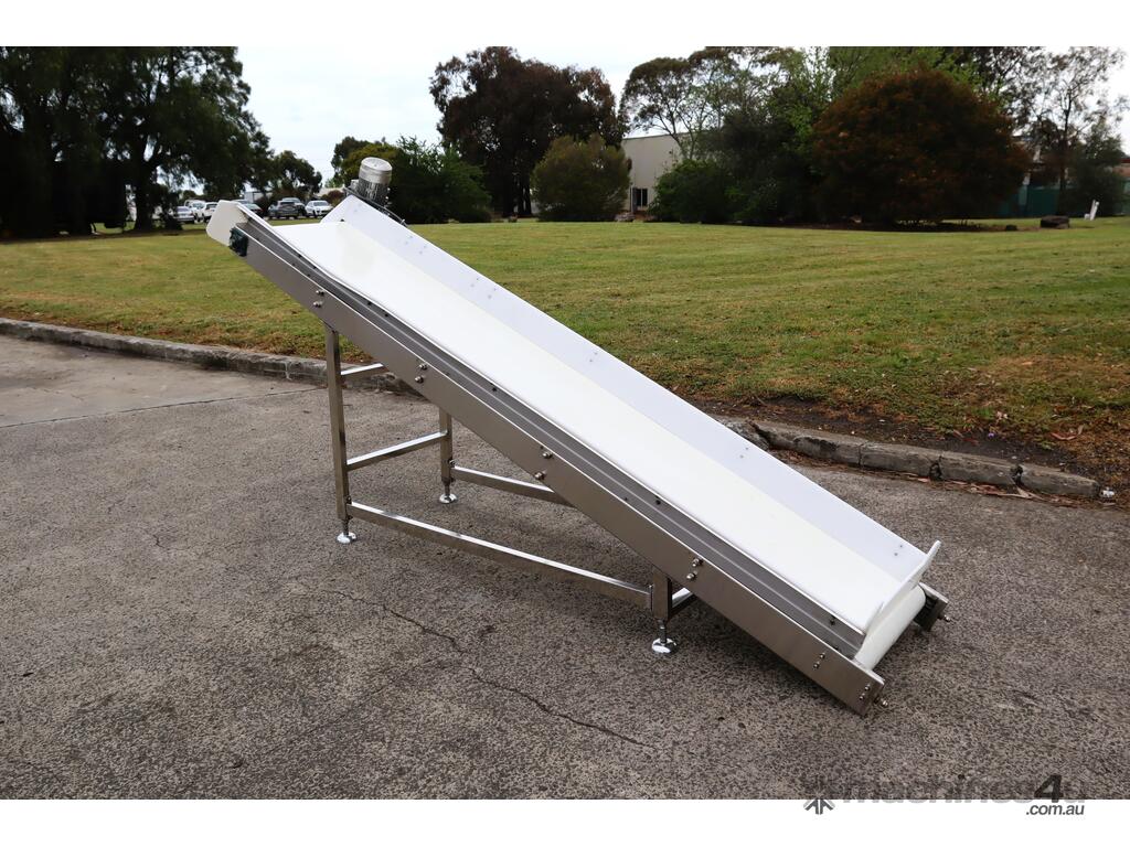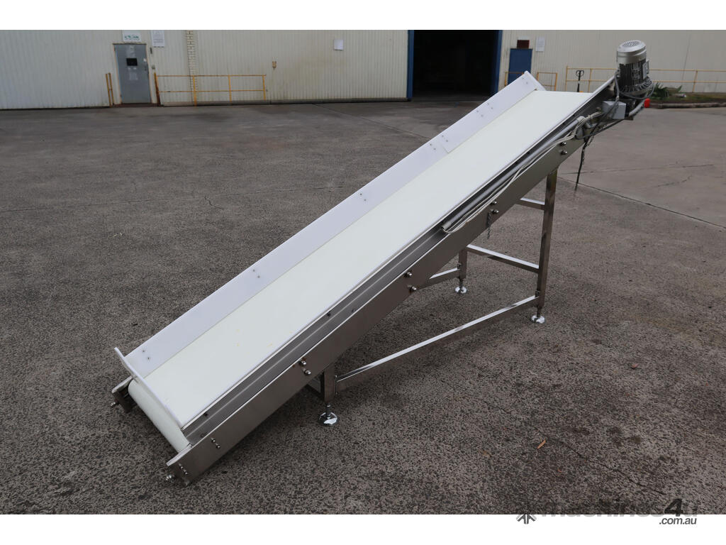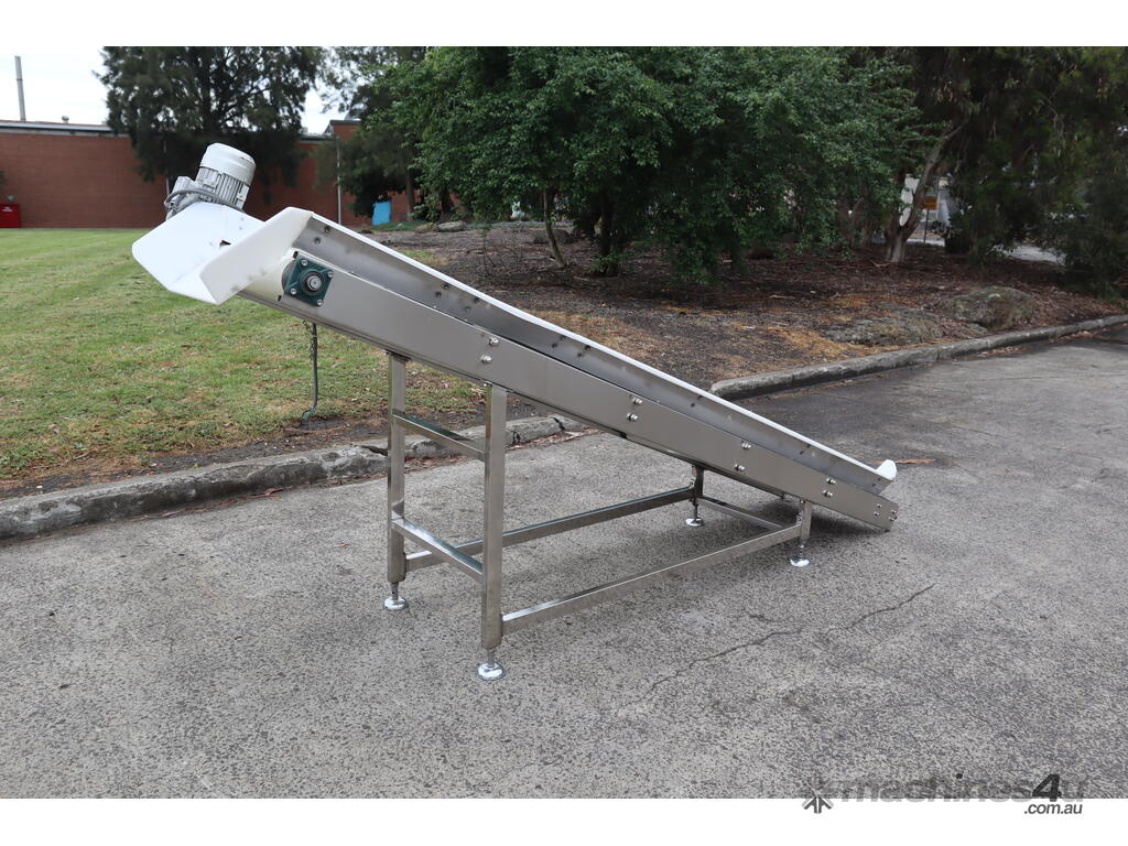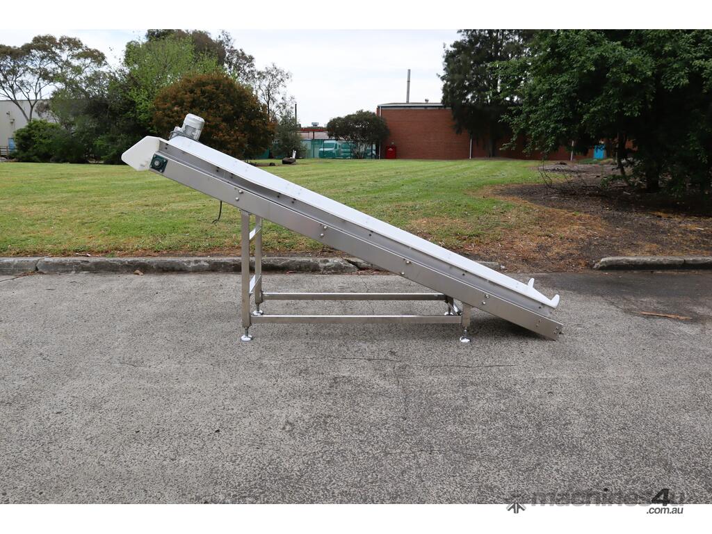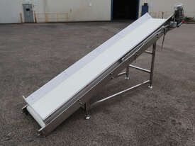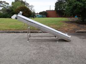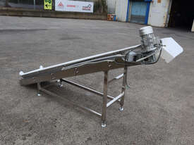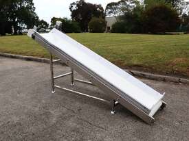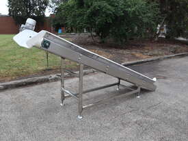 Stainless steel incline conveyor in great condition, suited for elevating product between processing stages. Features a hygienic design with smooth, easy to clean surfaces and a food-grade belt. Compact footprint and stable frame make it suitable for tight production layouts.