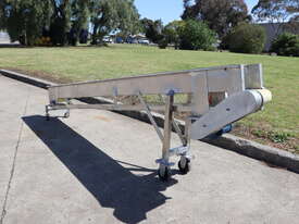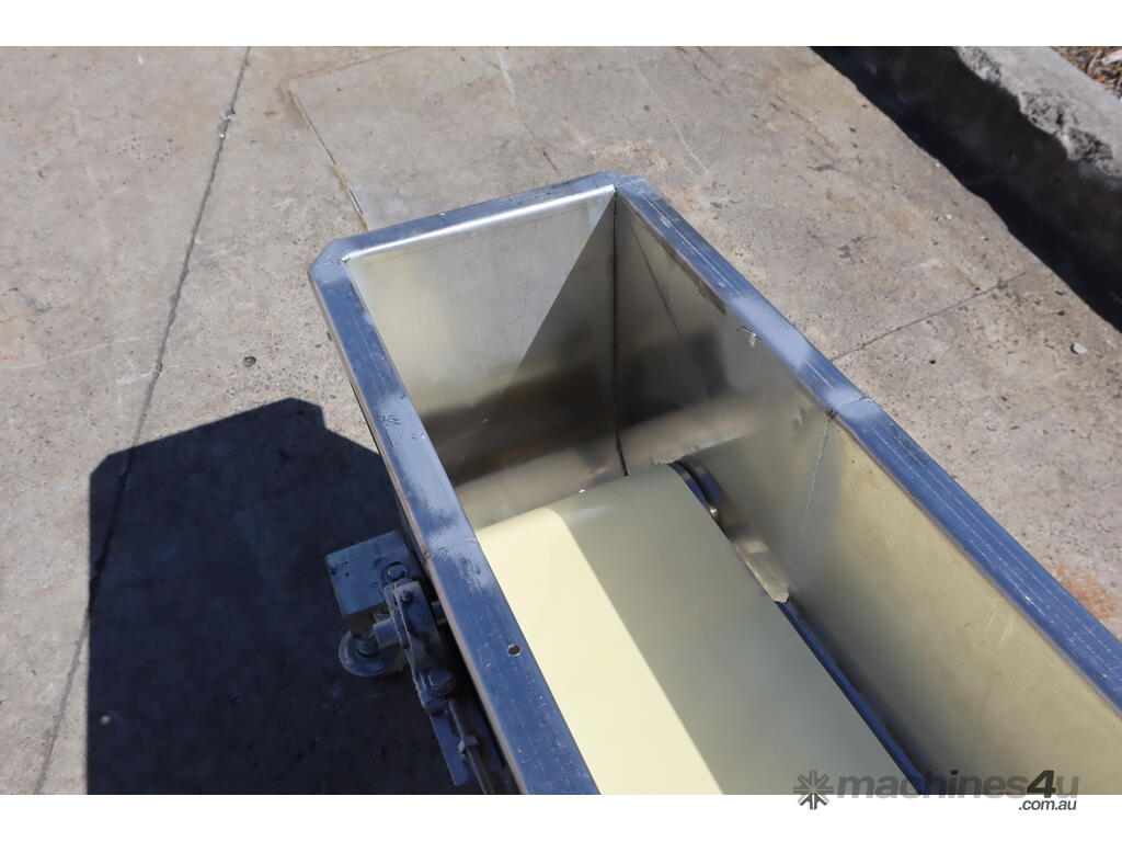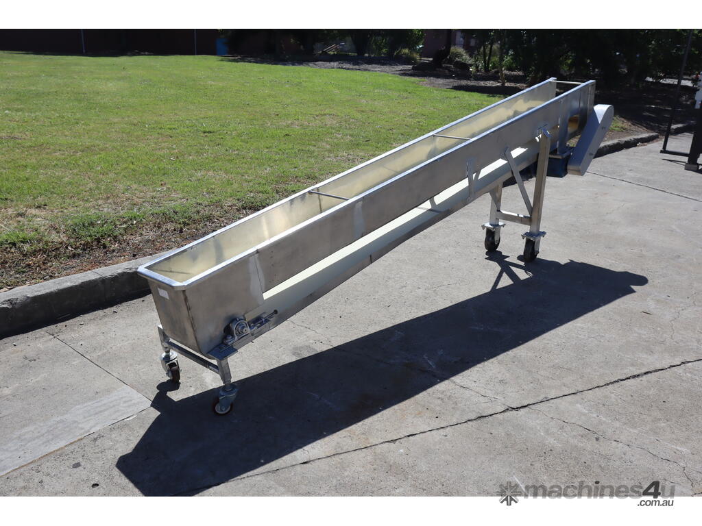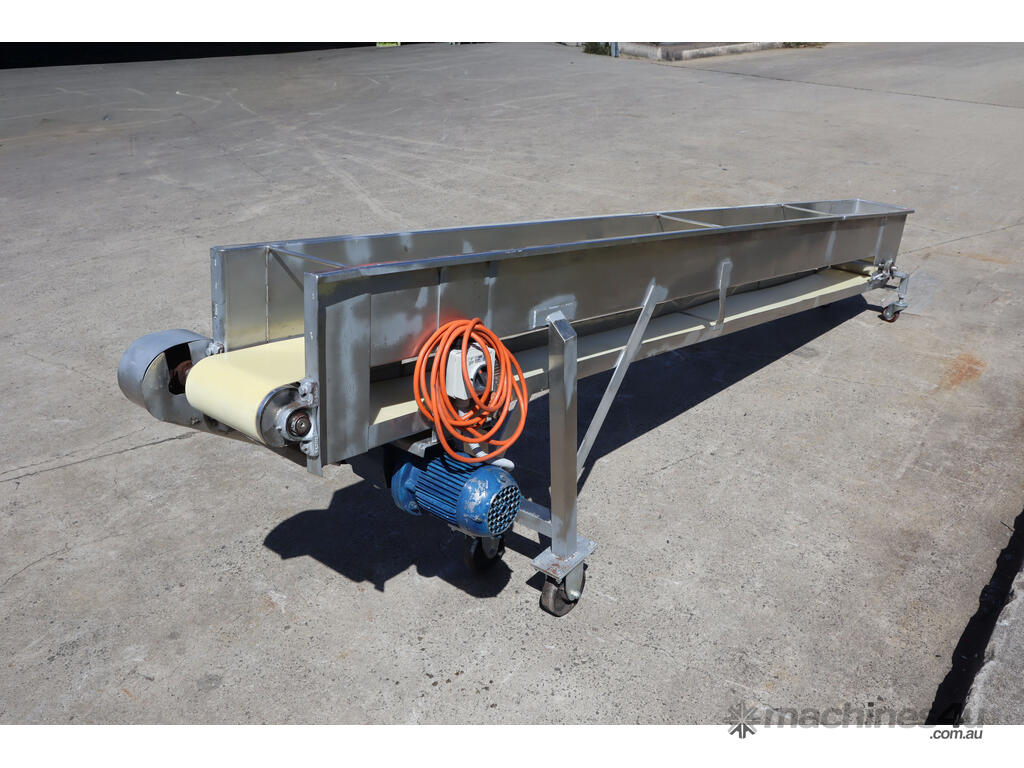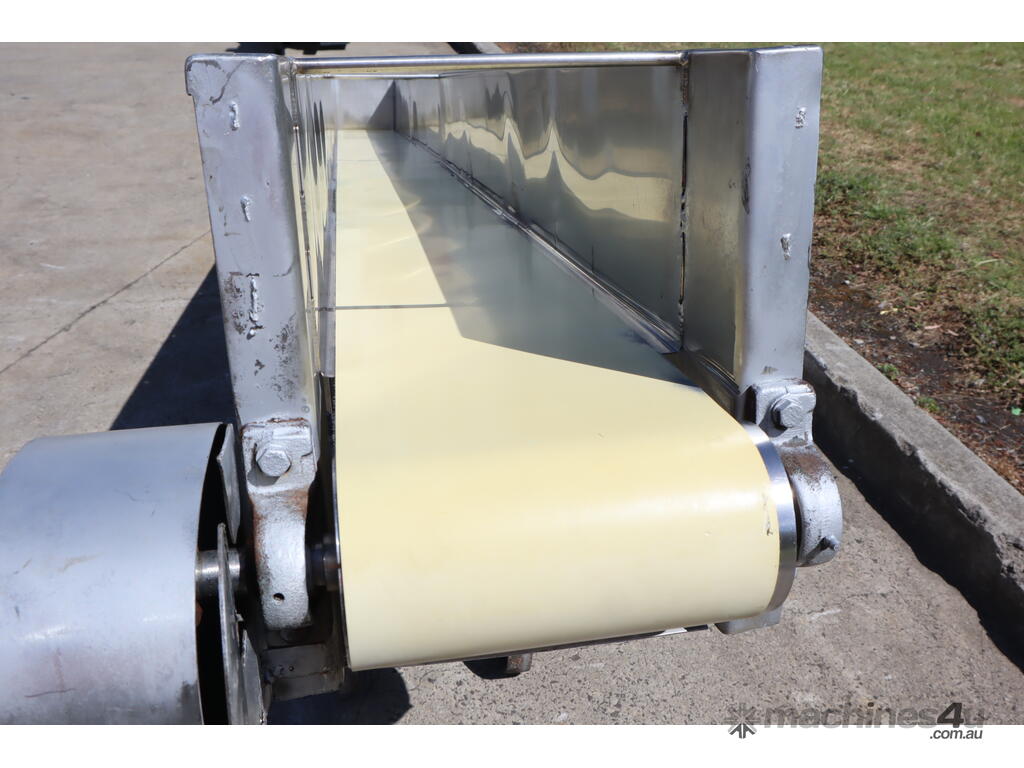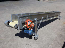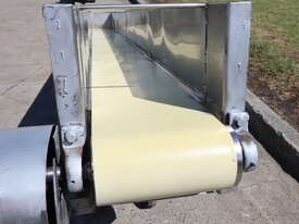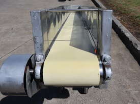 Stainless steel incline conveyor in great condition, suited for smooth and gradual elevating of product between processing stages. Features a hygienic design with smooth, easy to clean surfaces and a food-grade belt. Compact footprint and stable frame make it suitable for tight production layouts.